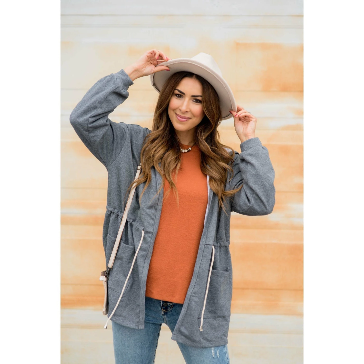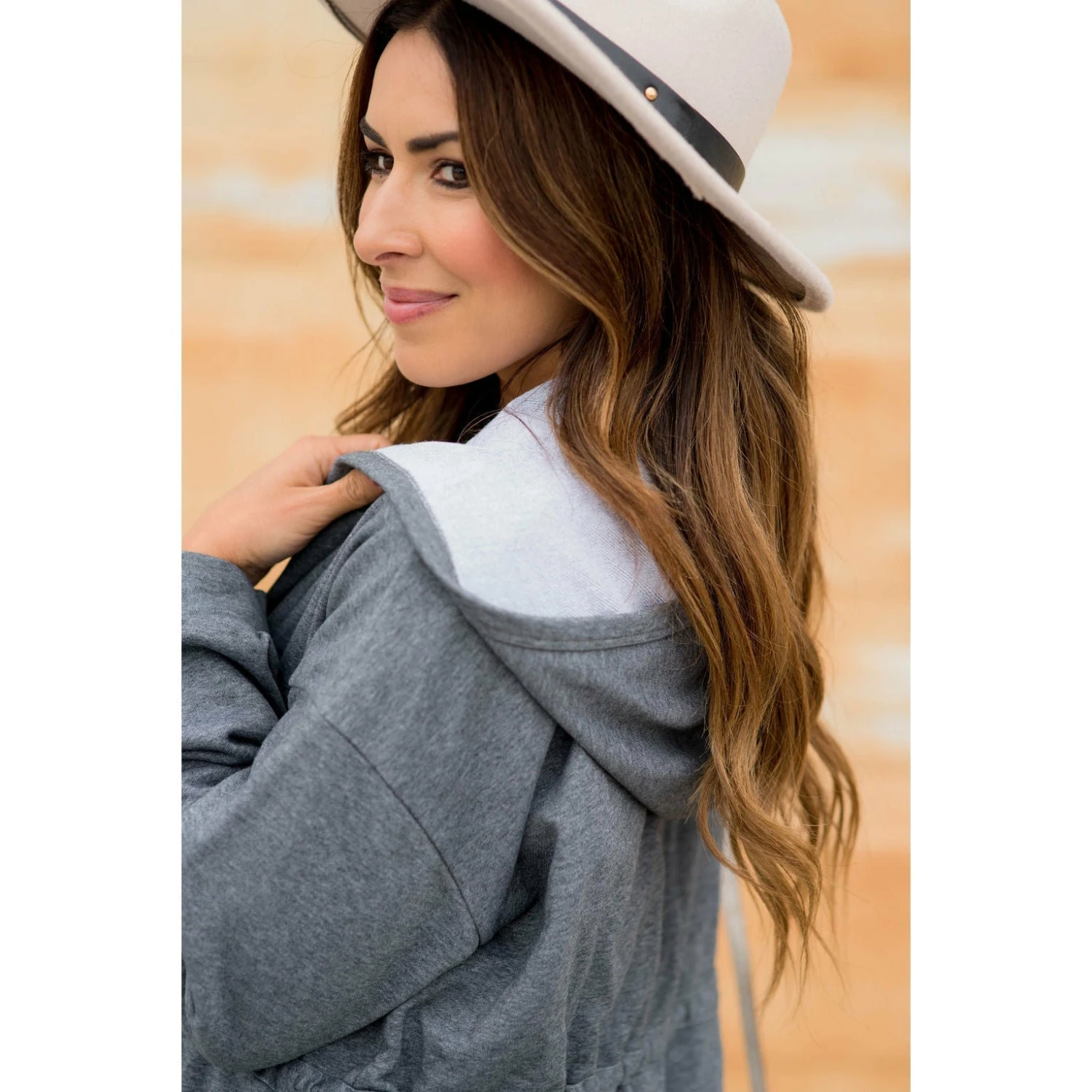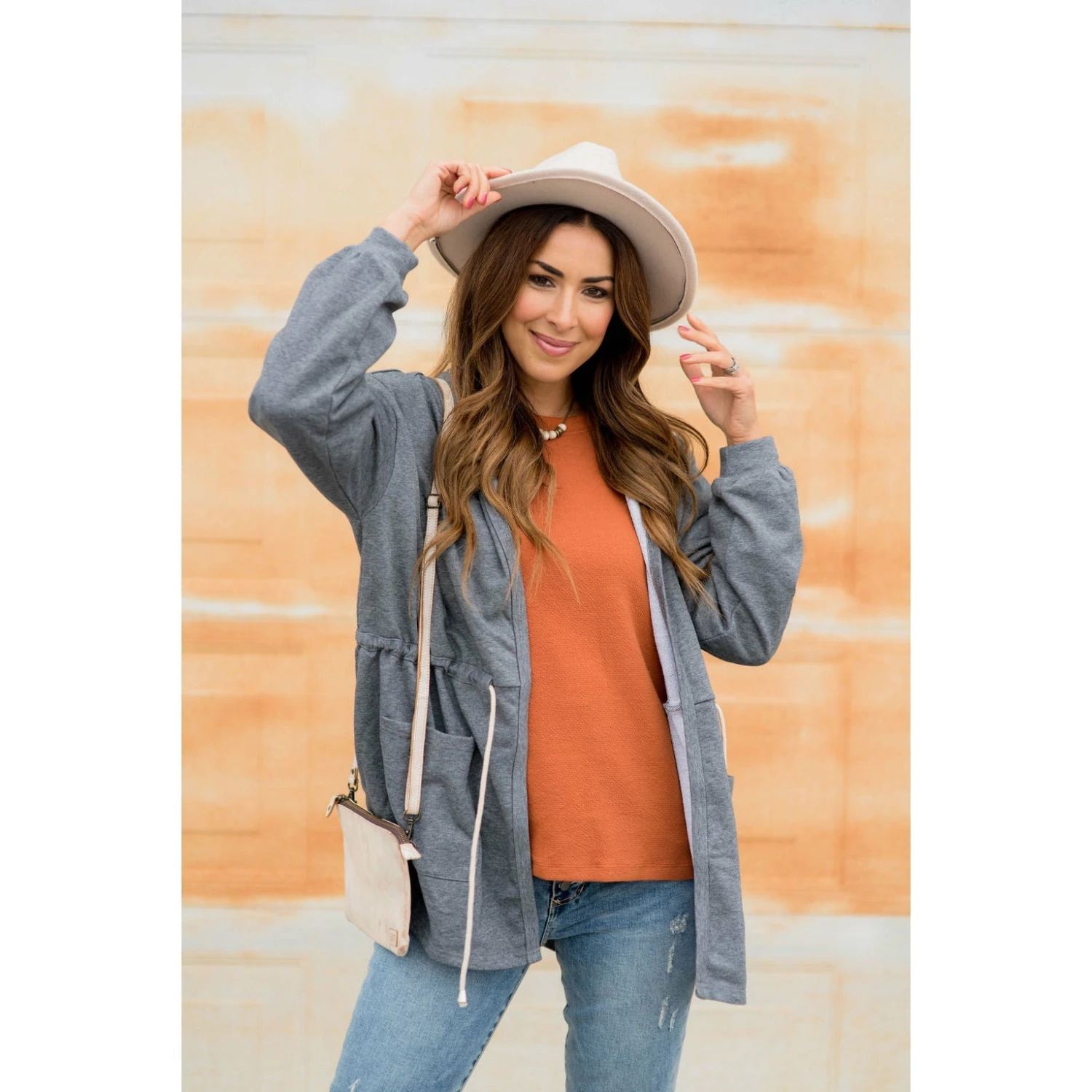 Need that extra comfy jacket that looks cute over everything? Here is one for you! Our Sweatshirt Hooded Open Tie Jacket is a great piece to wear over a sweater or basic tee! The possibilities really are endless with this one!