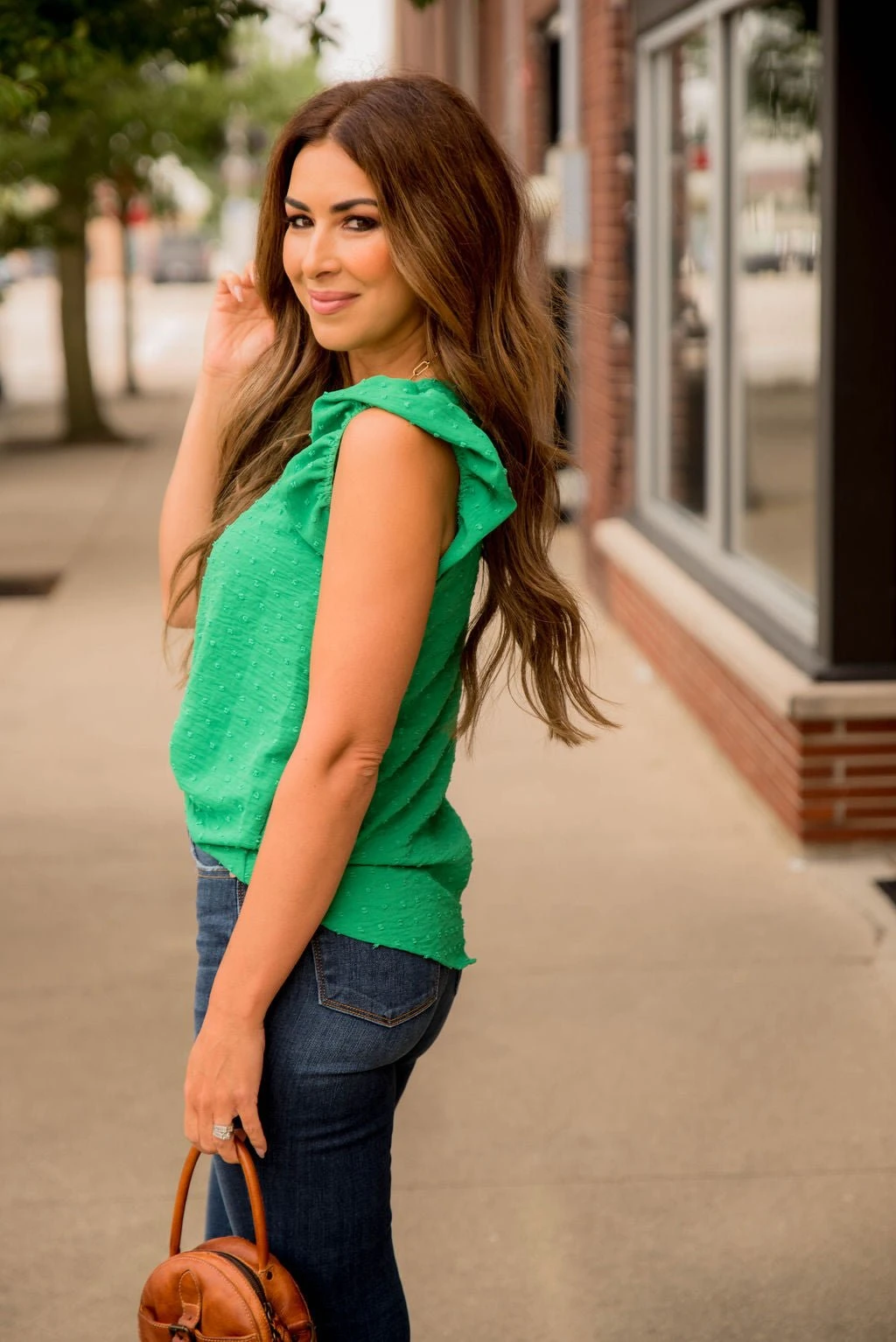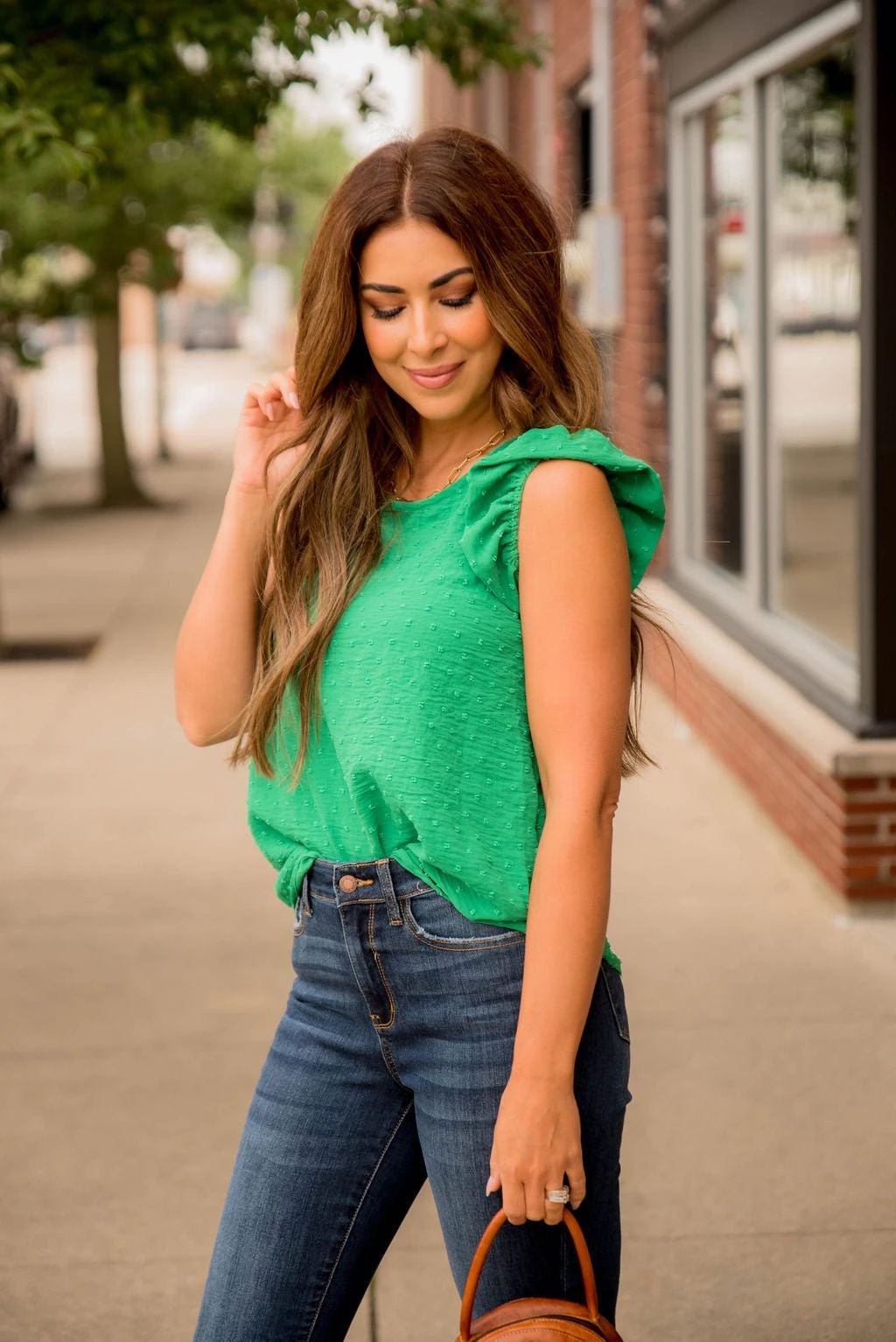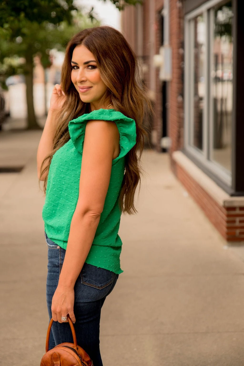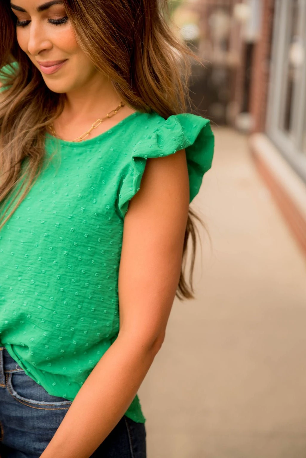 The flutter trim accents and the swiss dot detailing sets this blouse apart from the rest! This blouse is bold enough to wear on its own, but can just as easily be layered up with your favorite cardigan or kimono, making it the perfect staple piece for your wardrobe!