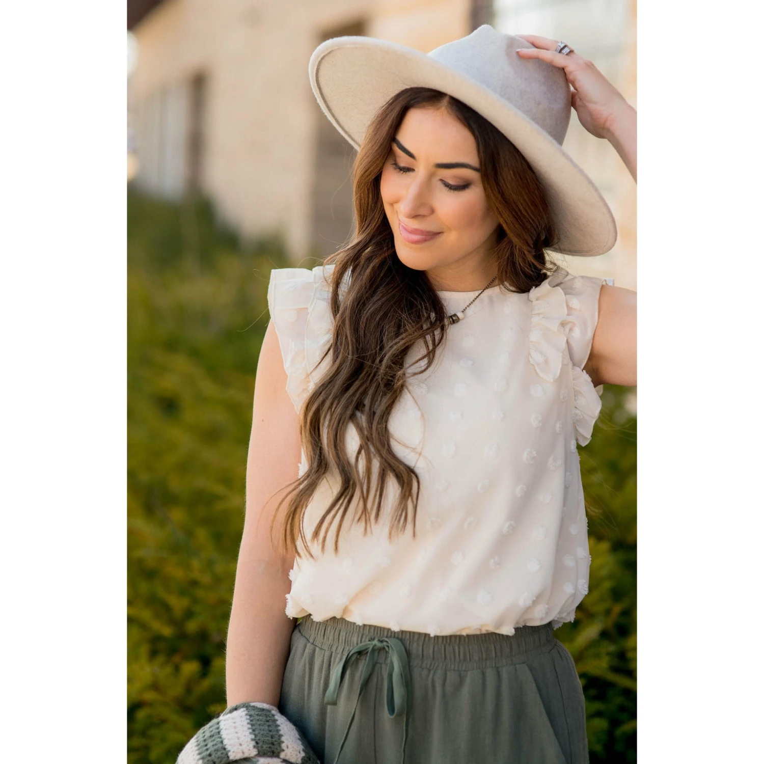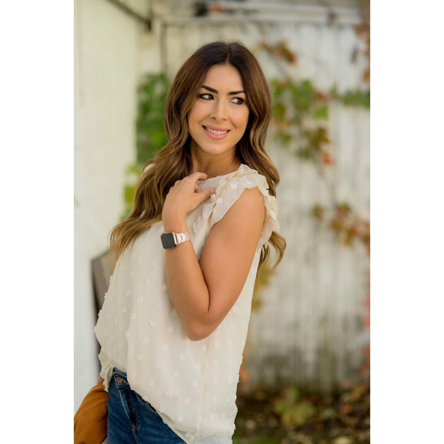The textured dots and ruffled shoulder make this tank looks so elegant and chic. Wear this on it’s own or add a cardigan for added style.