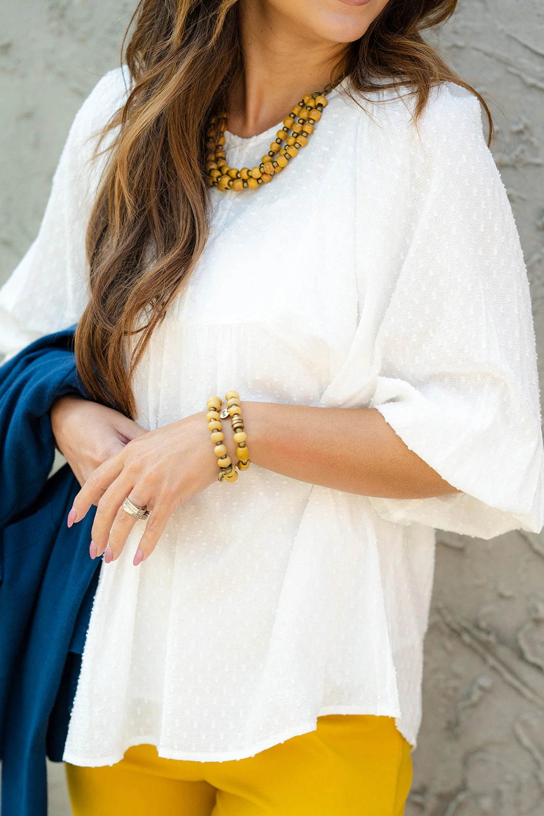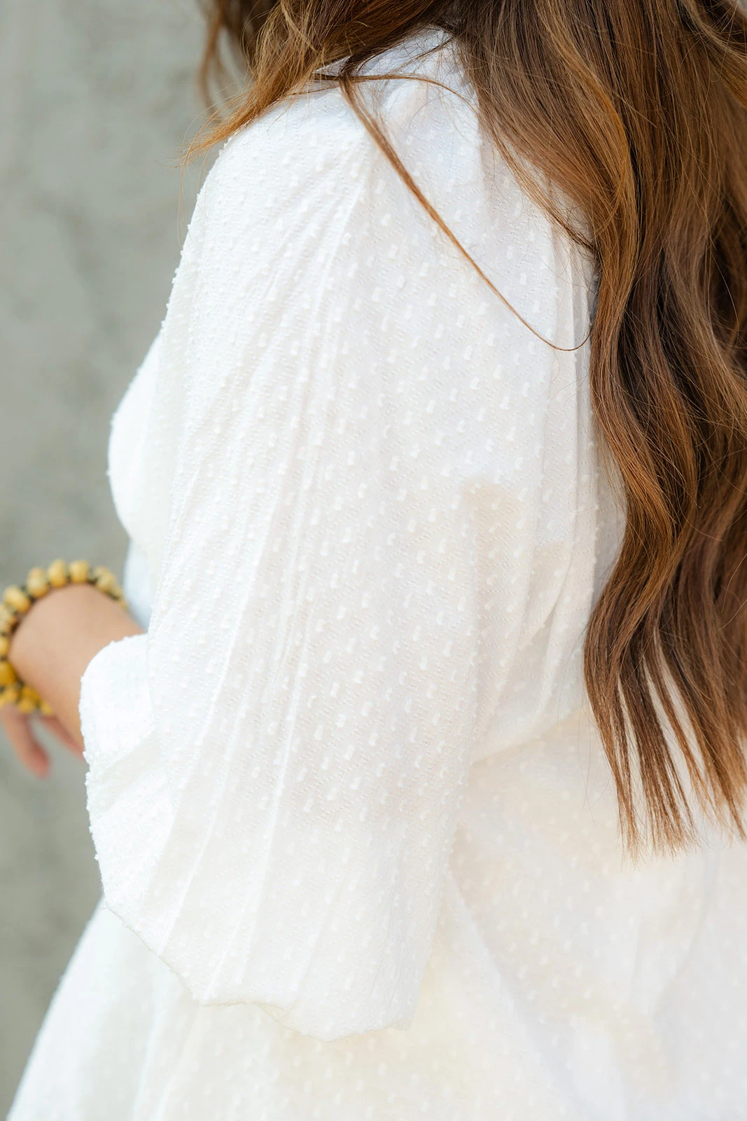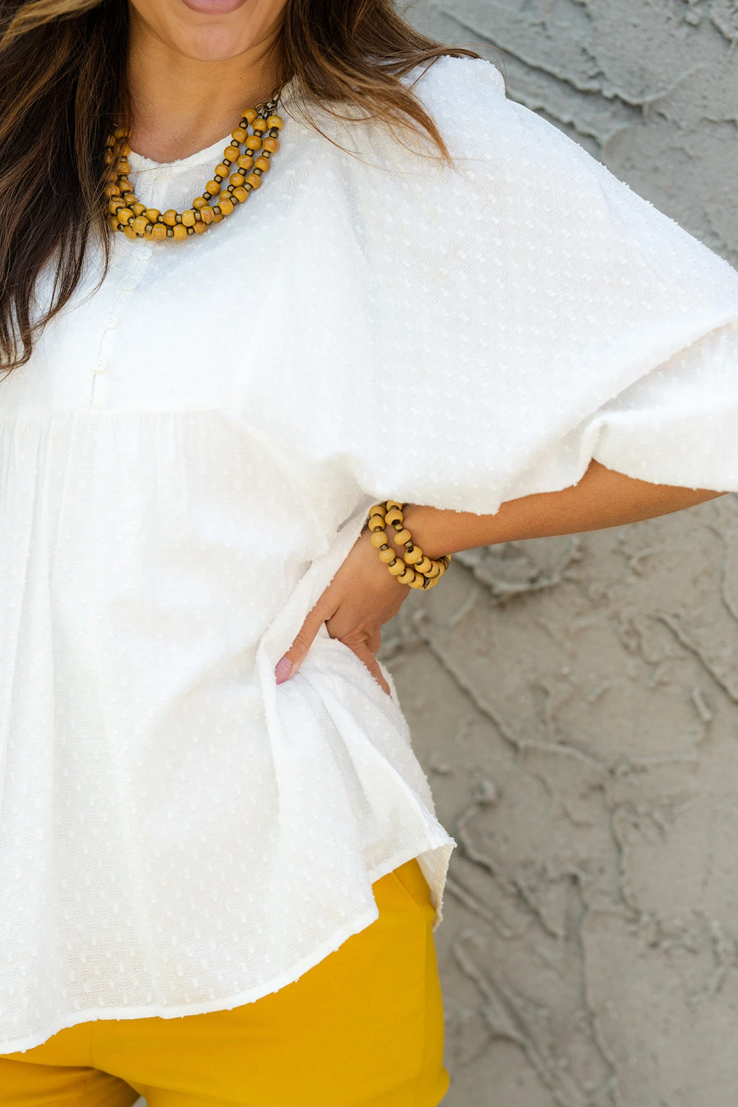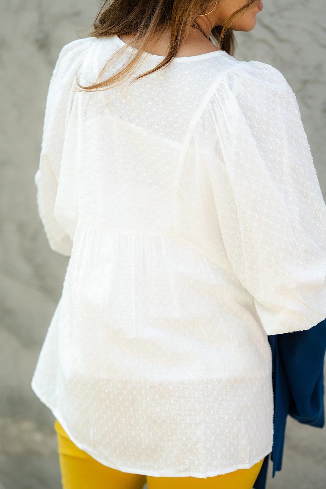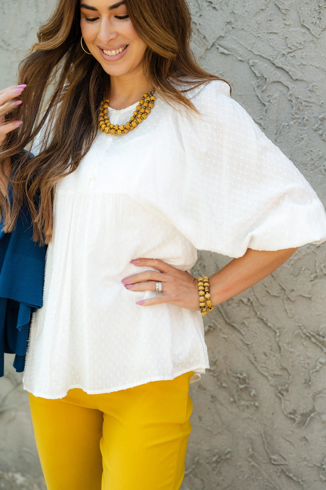 We’re loving the flowy peasant top fit with the textured dot print, puff sleeves, and button detailing of this blouse! We suggest pairing with a bold-colored pair of our Betsey’s Jeggings or Betsey’s Exclusive Shorts or tucked into a high-waisted skirt or shorts and don’t forget your favorite accessories for a complete Betsey’s look! The lightweight material allows you to wear this all year round and this can easily be layered with a cardigan, blazer, or jacket!