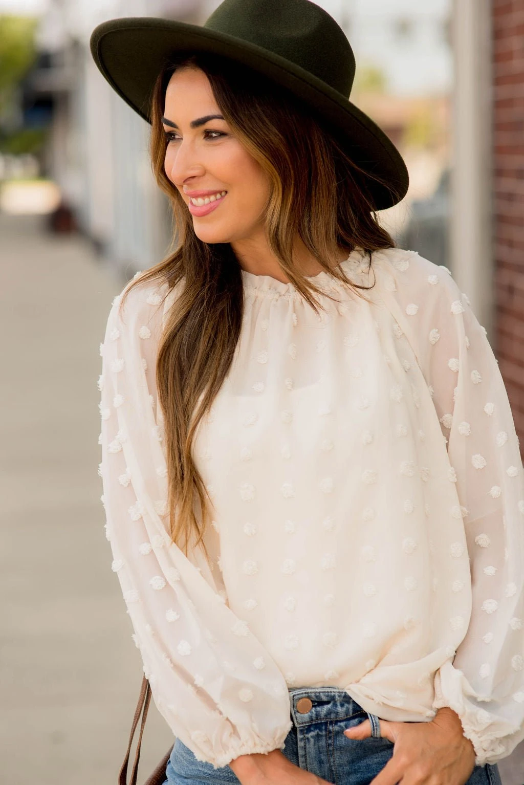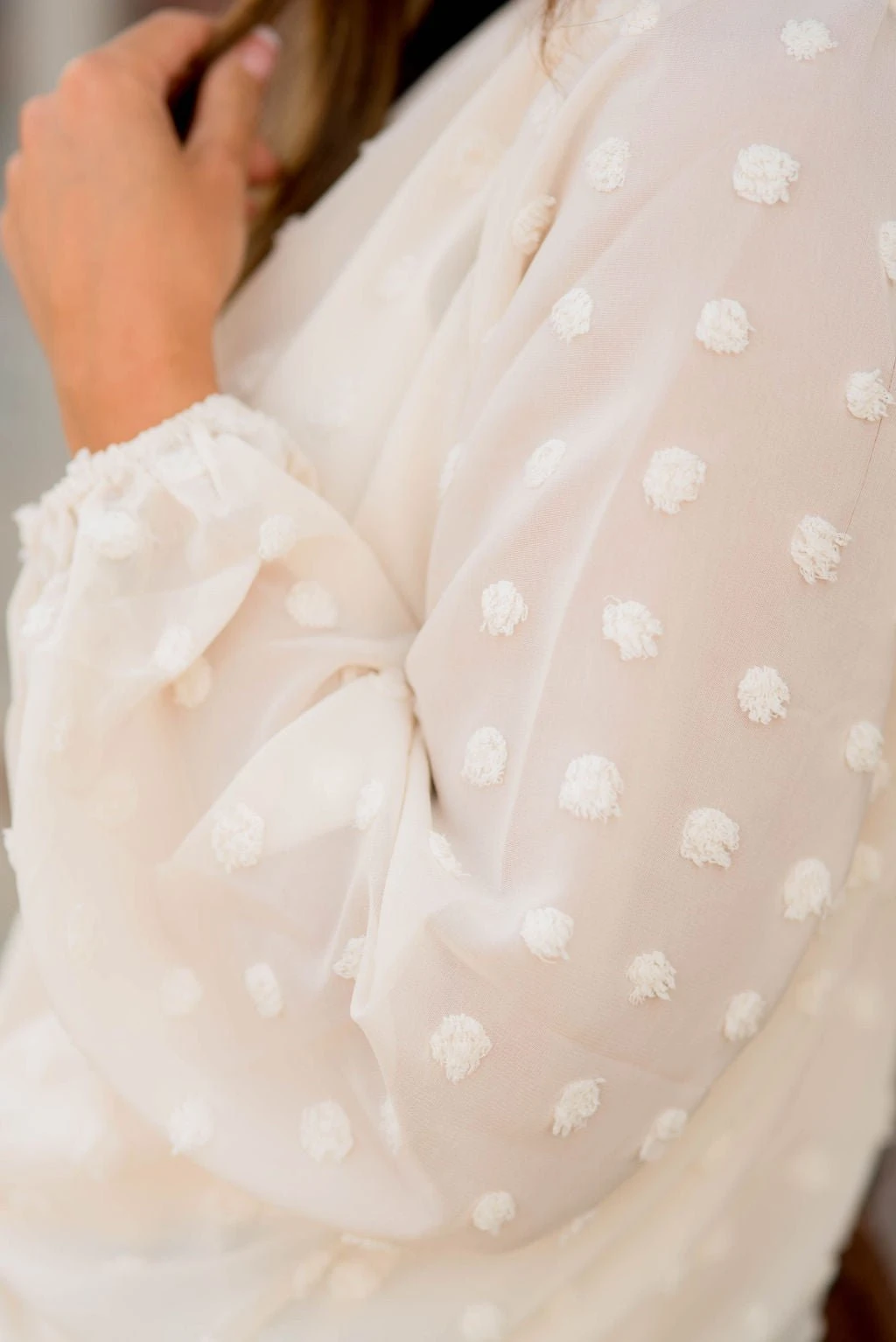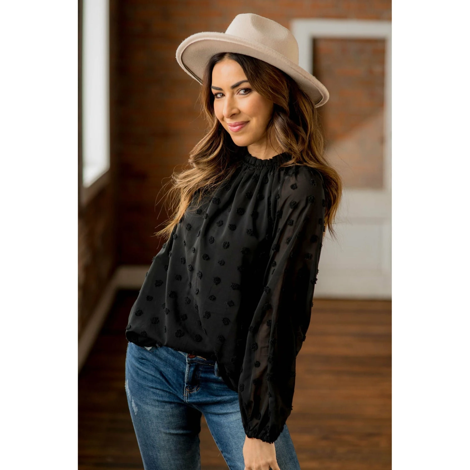 We are loving this swiss dot trend! The cinching, colors and swiss dot pattern on this blouse are elegant and stylish!