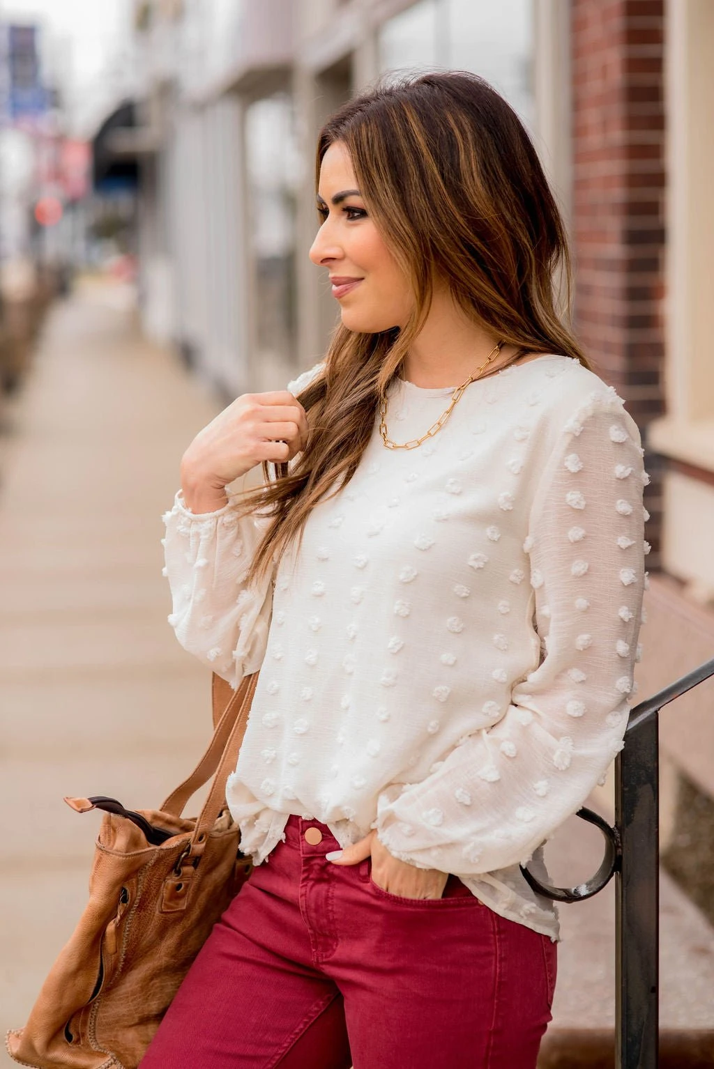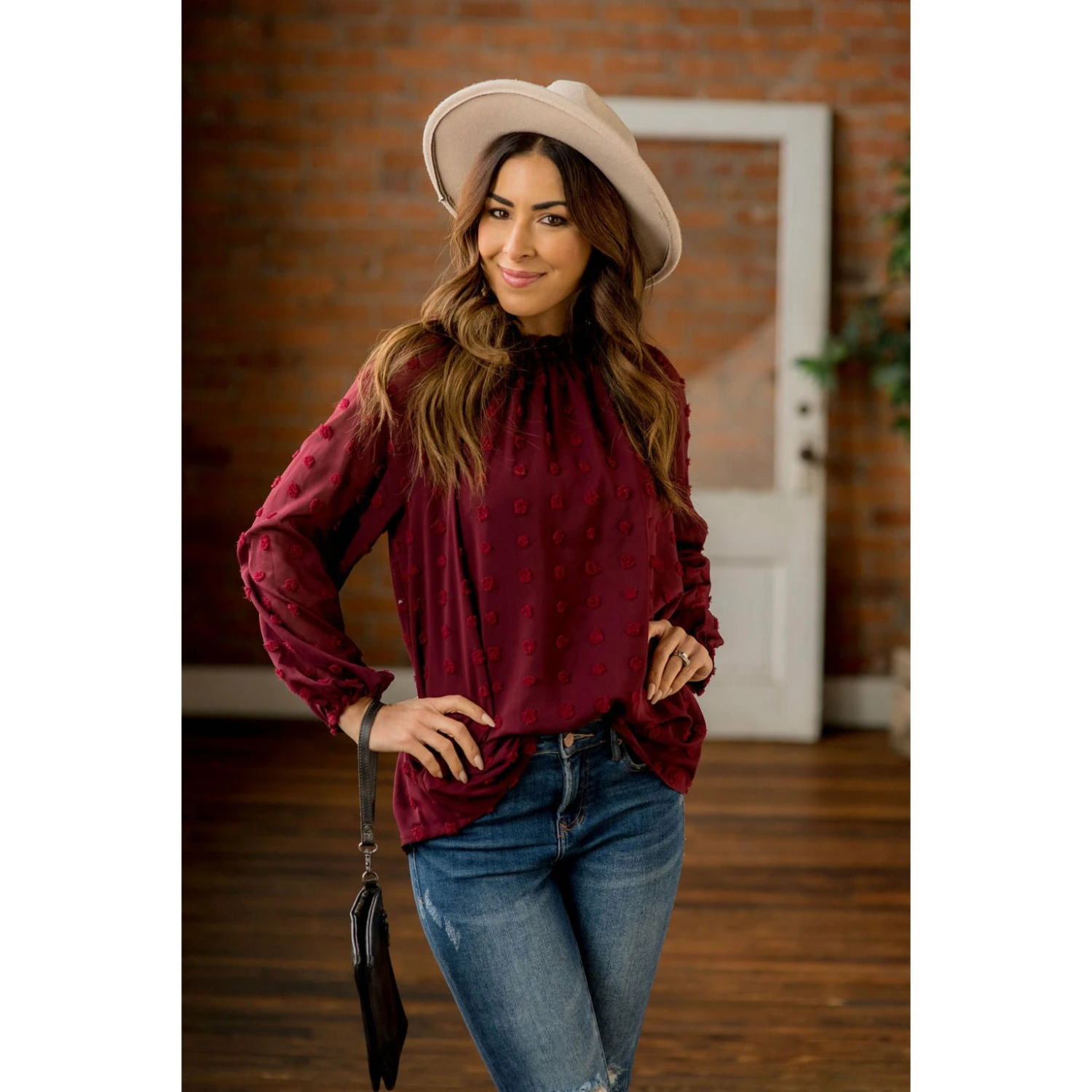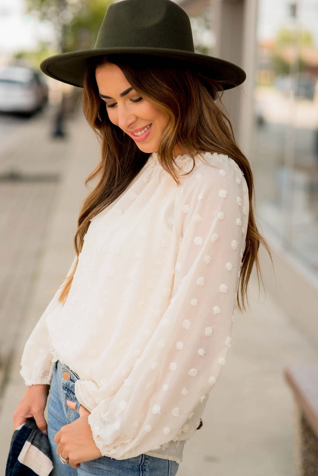 We are loving this swiss dot trend! The cinching, colors and swiss dot pattern on this blouse are elegant and stylish!