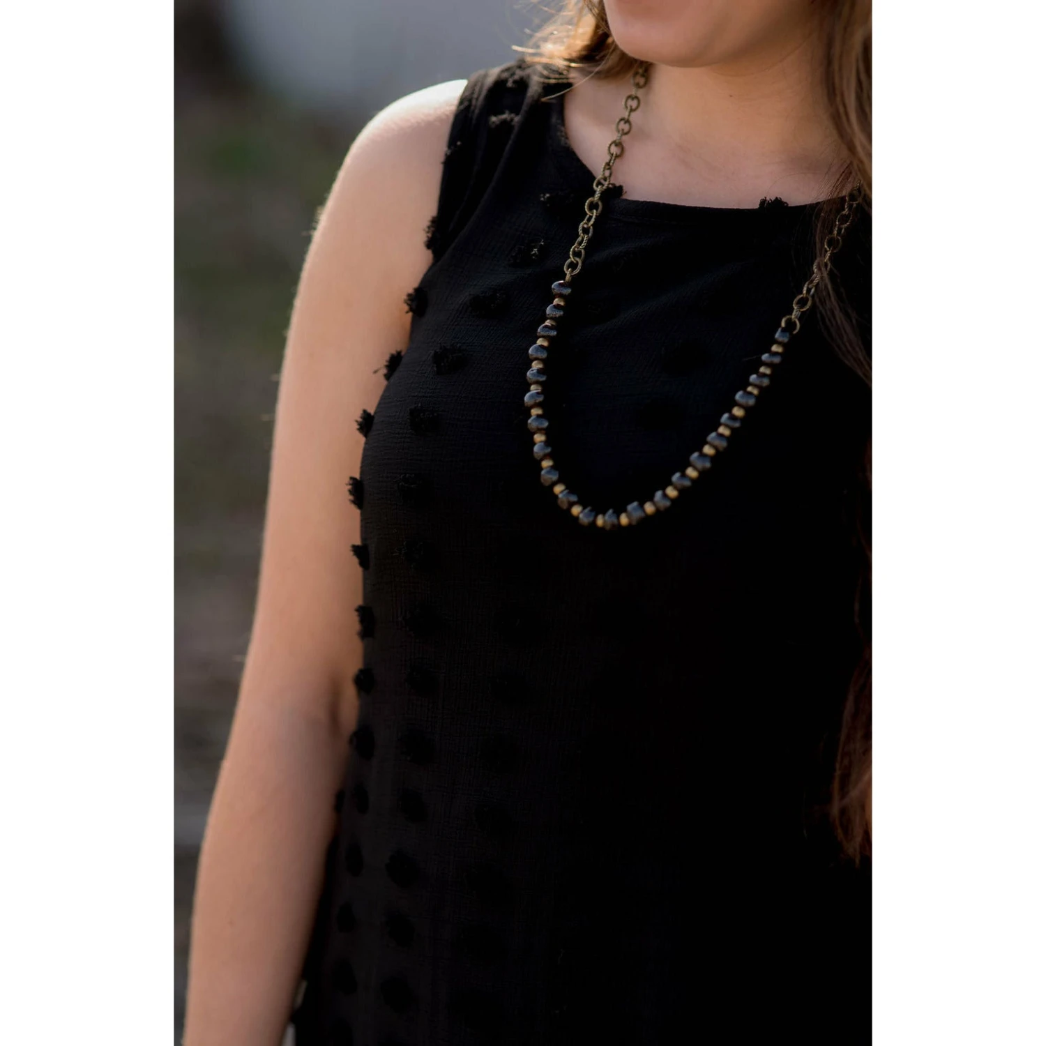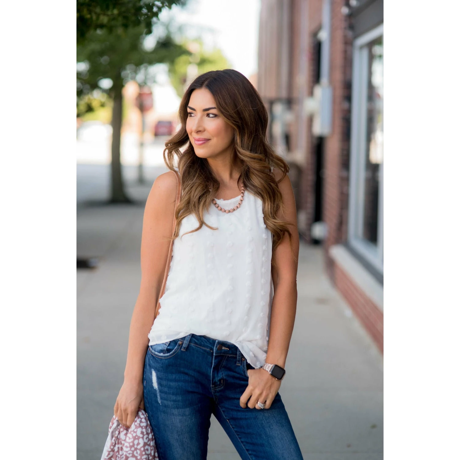 A simple blouse like tank taken to the next level with the addition of the textured dots! We love how easy this tank is to style, whether going for a dressy or more casual look, and how ideal it is for any season because of the ease of layering!Â