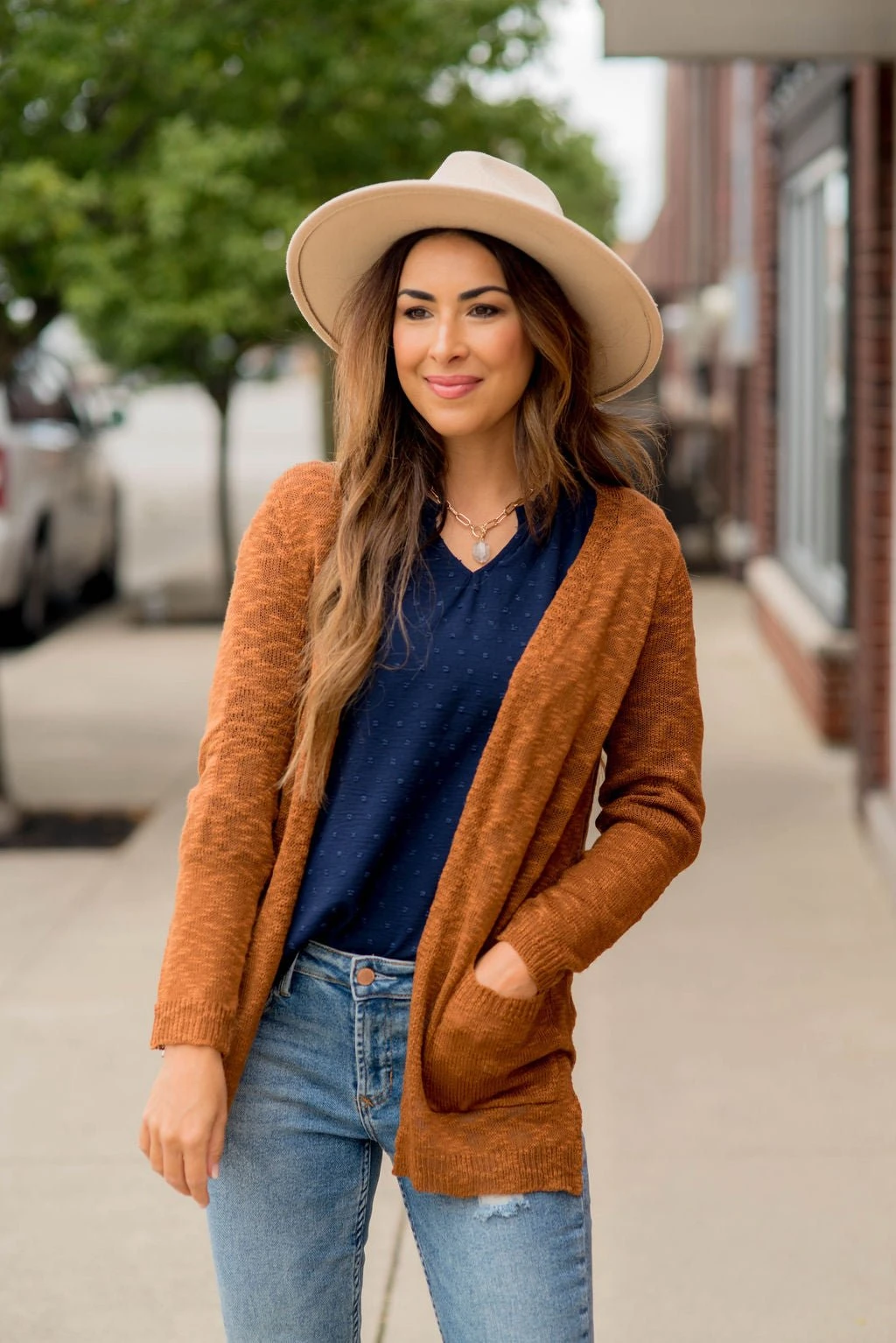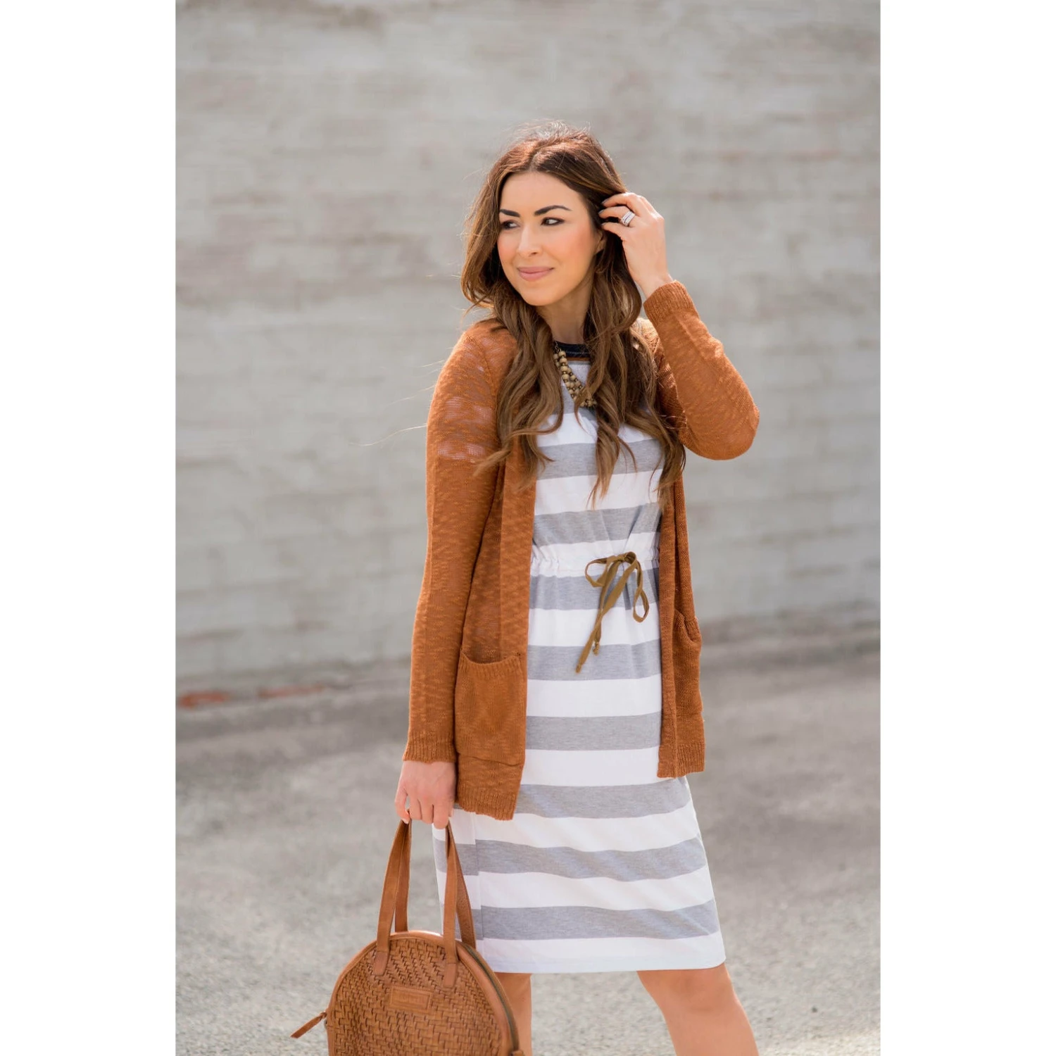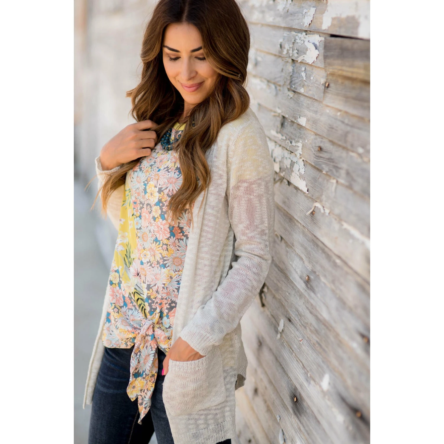 This cardigan is a bit thinner, so perfect for layering and during those cooler summer days! Wear this with leggings and a basic tee!