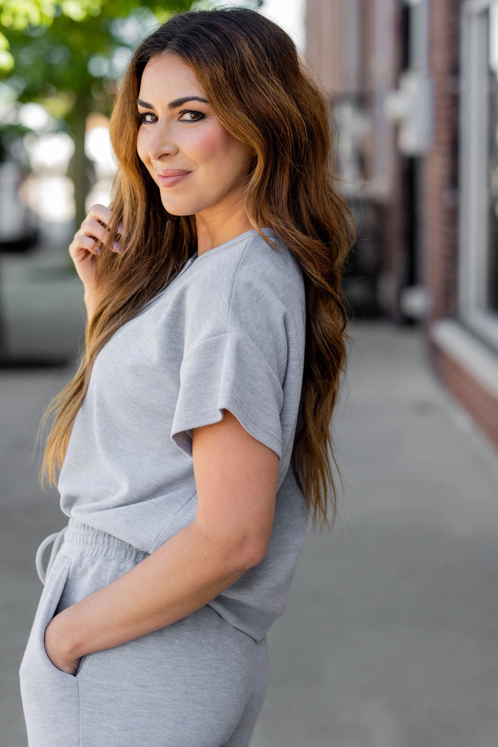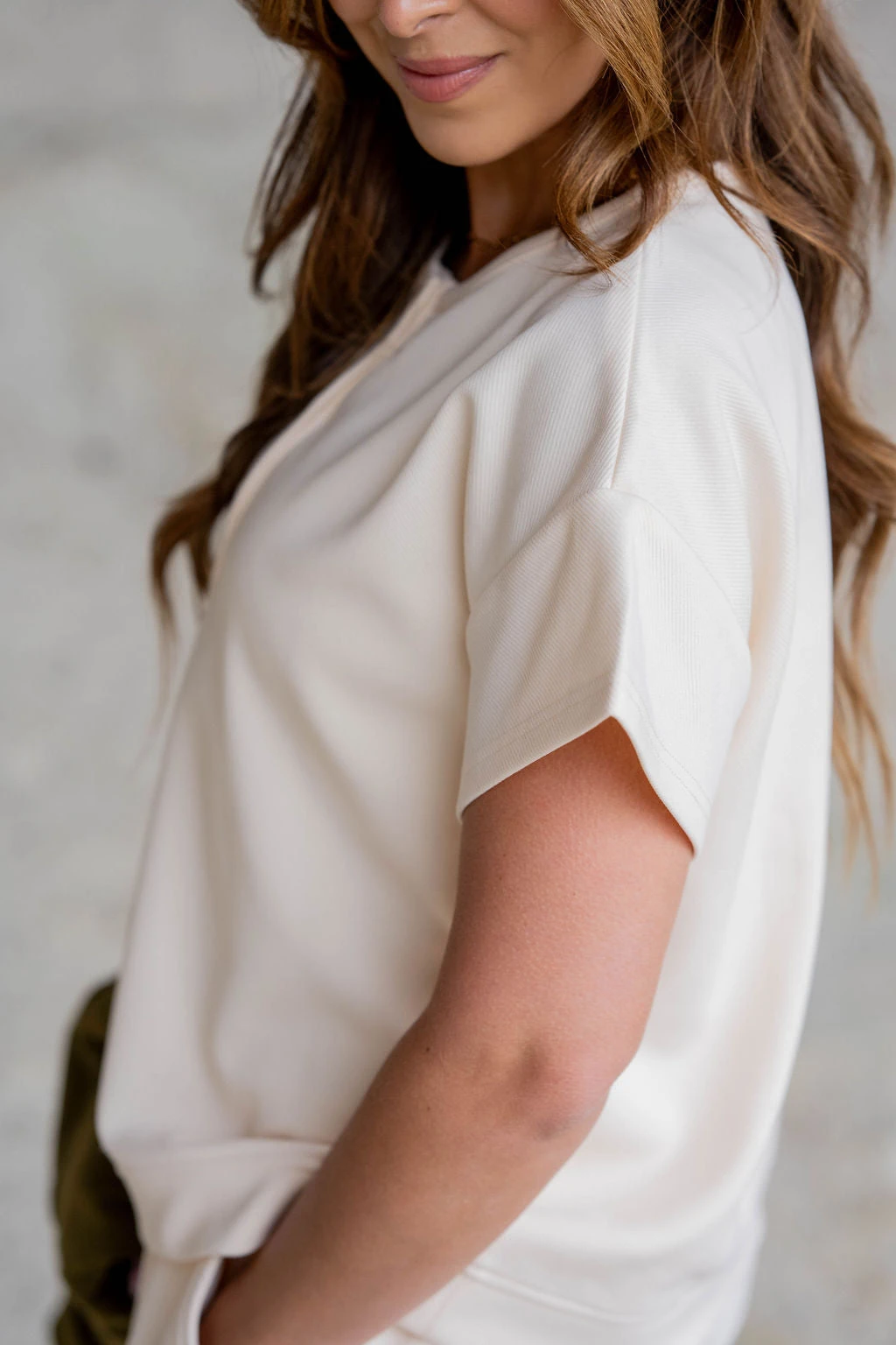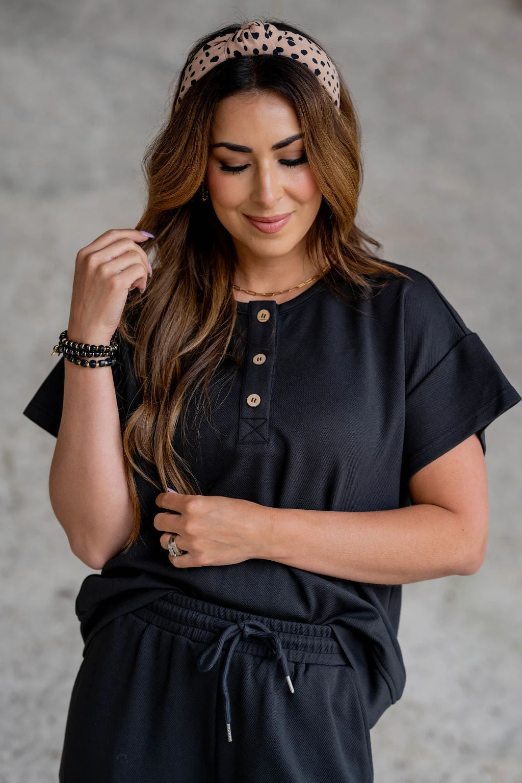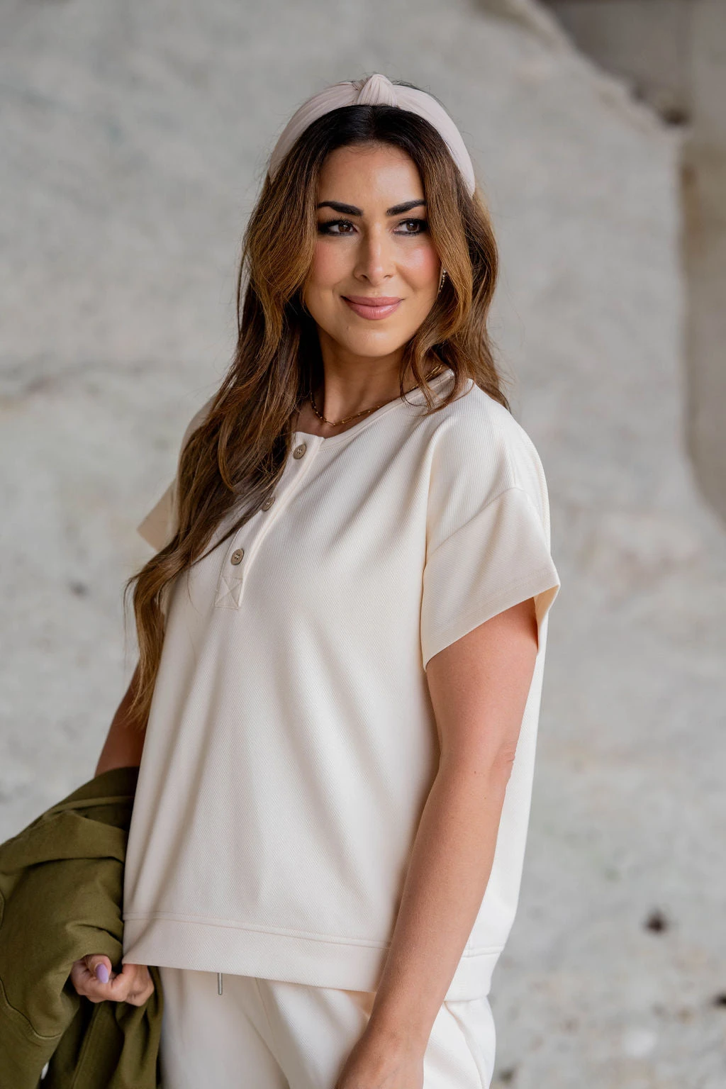 Comfort meets style in this subtle textured tri-button tee! The soft, lightly textured material gives a fun twist to any look, and the relaxed sleeve detailing is perfect to pair with leggings, denim, or joggers! Chilly? Layer with a vest or shacket! We also suggest pairing this with our Textured Relaxed Pants for a chic and complete look!