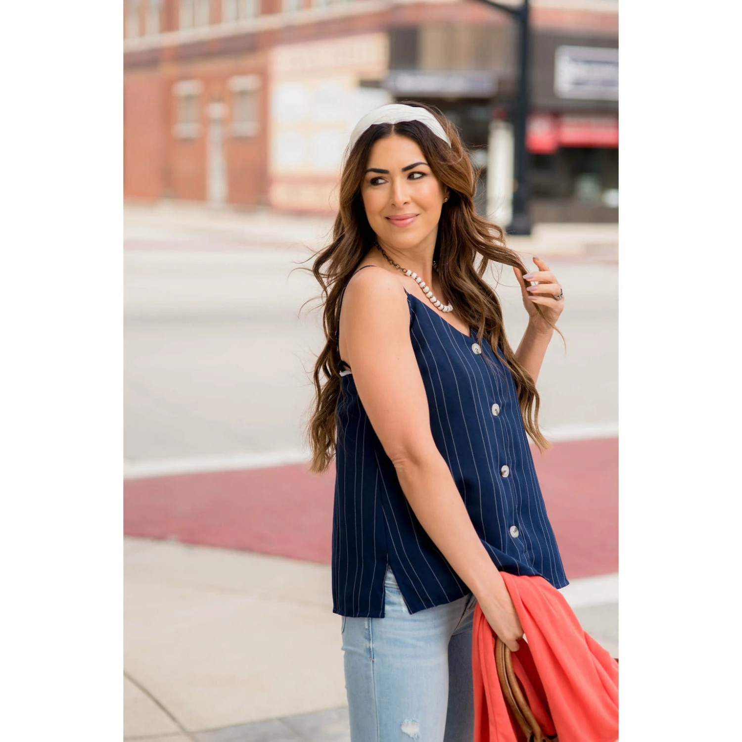 How cute is this?! The thin vertical stripes with the button accents really set this apart from the rest! Pair this with a pair of shorts for the warmer months or with your favorite denim and a cardigan for the cooler ones!