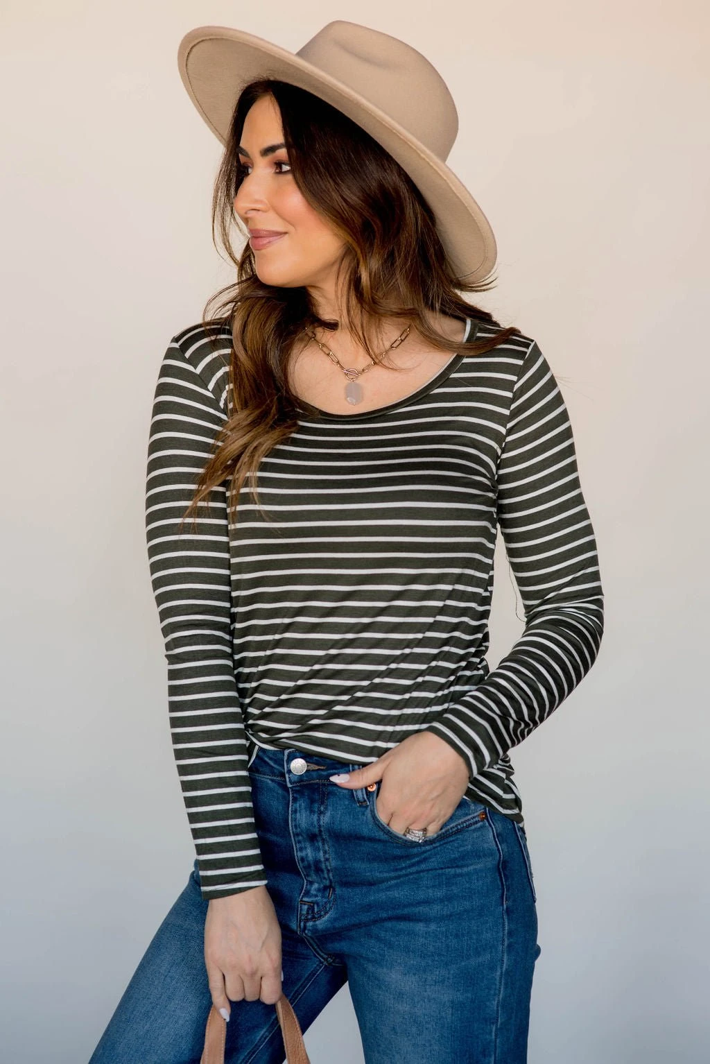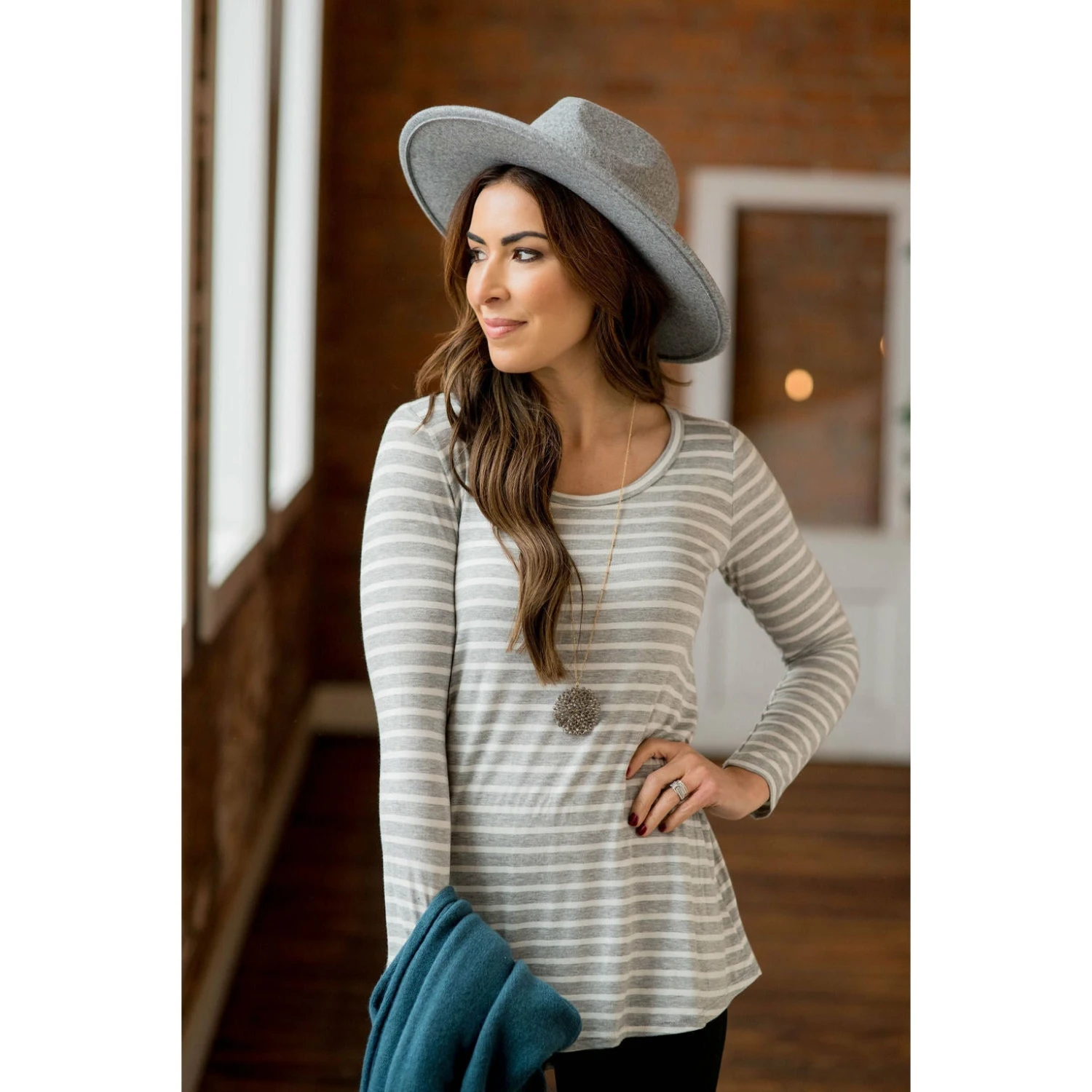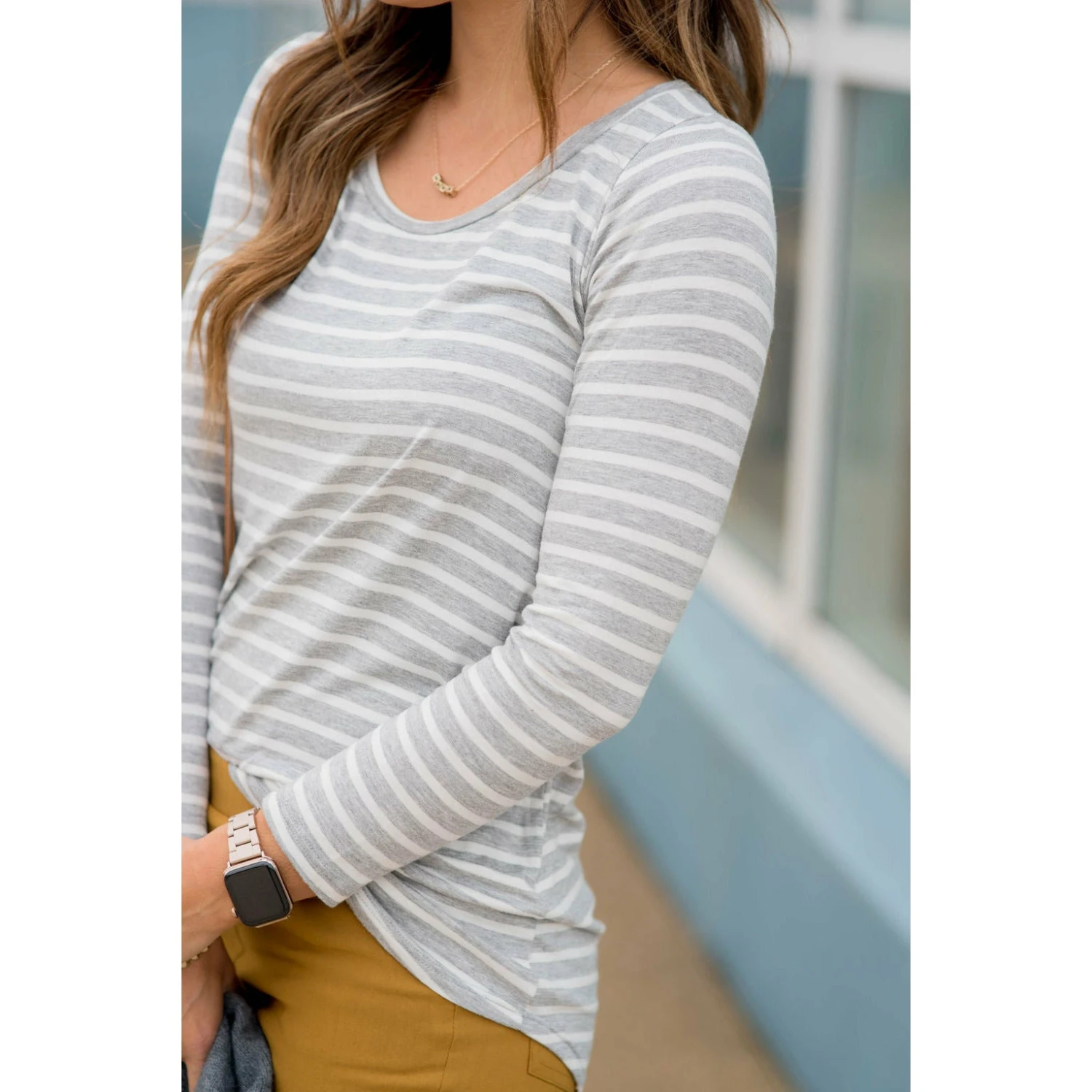 Stripes are always such a classic look, but the added bonus to this tee is it’s super soft and stretchy material and the perfect length to wear with leggings and a cardigan for a classy yet comfy look! Add a plaid blanket scarf or statement necklace to take this outfit up a notch, we’re sure you will want to snag this in multiple colors.