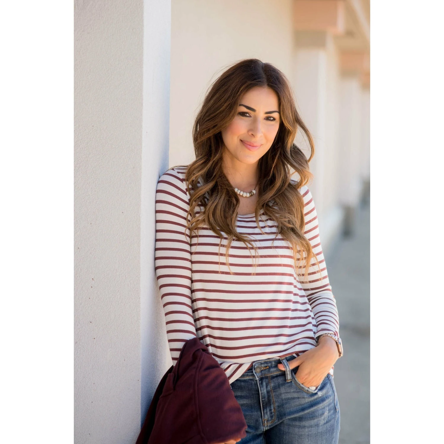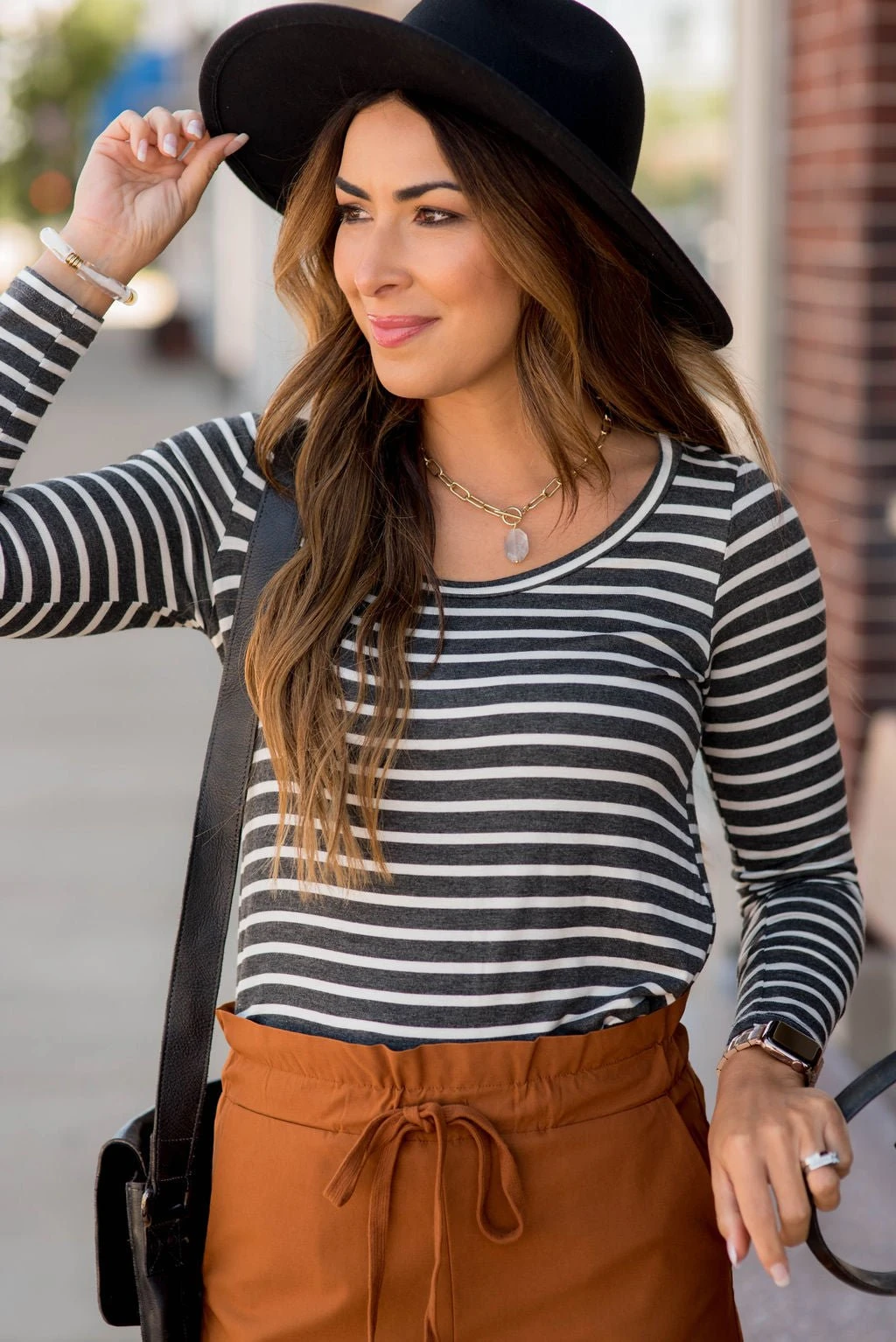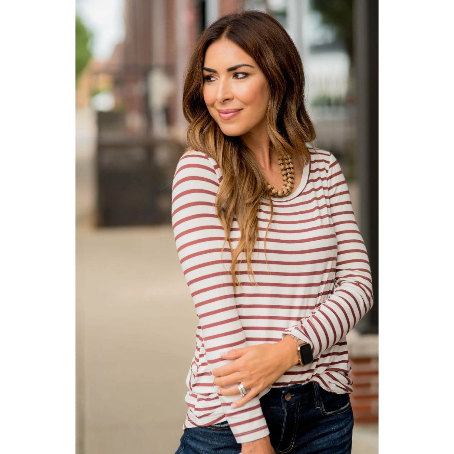 Stripes are always such a classic look, but the added bonus to this tee is it’s super soft and stretchy material and the perfect length to wear with leggings and a cardigan for a classy yet comfy look! Add a plaid blanket scarf or statement necklace to take this outfit up a notch, we’re sure you will want to snag this in multiple colors.