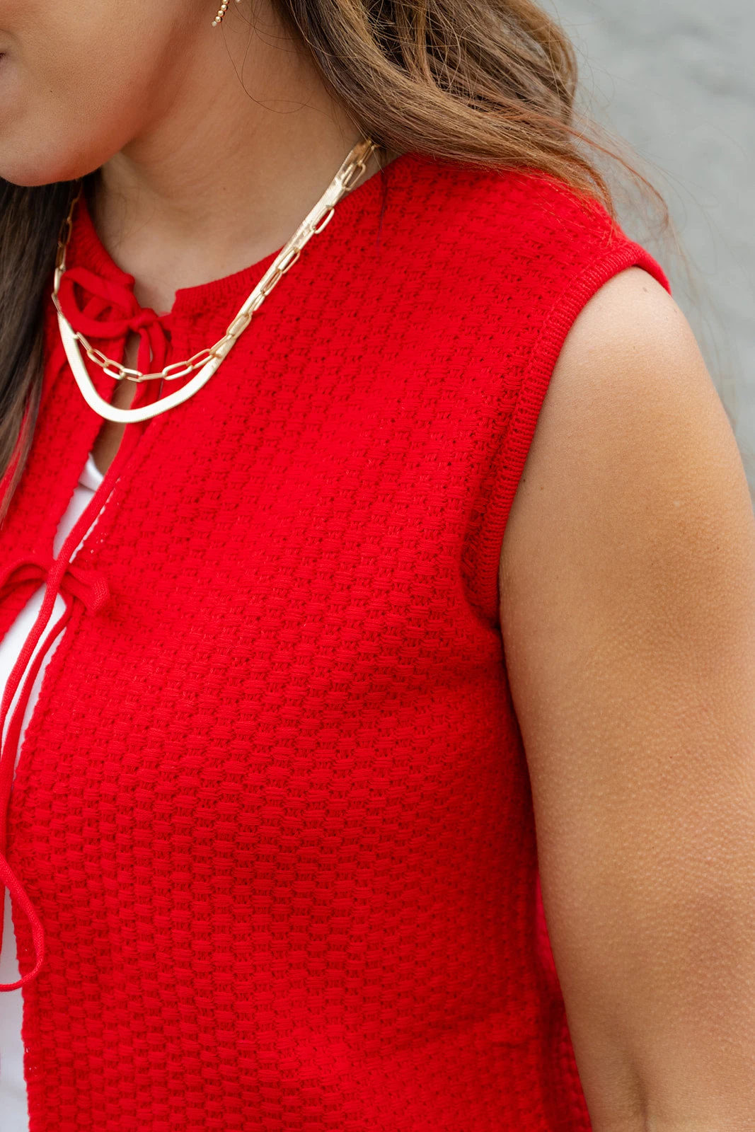 The woven material and tie front detailing of this vest have us swooning! Pair with a blouse, dress, basic tee or tank, long sleeve, anything! This is easy to dress up or down for everyday wear!Â