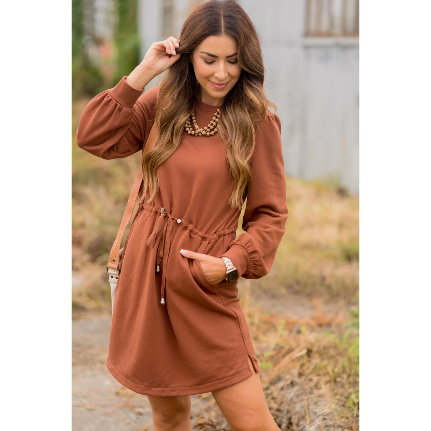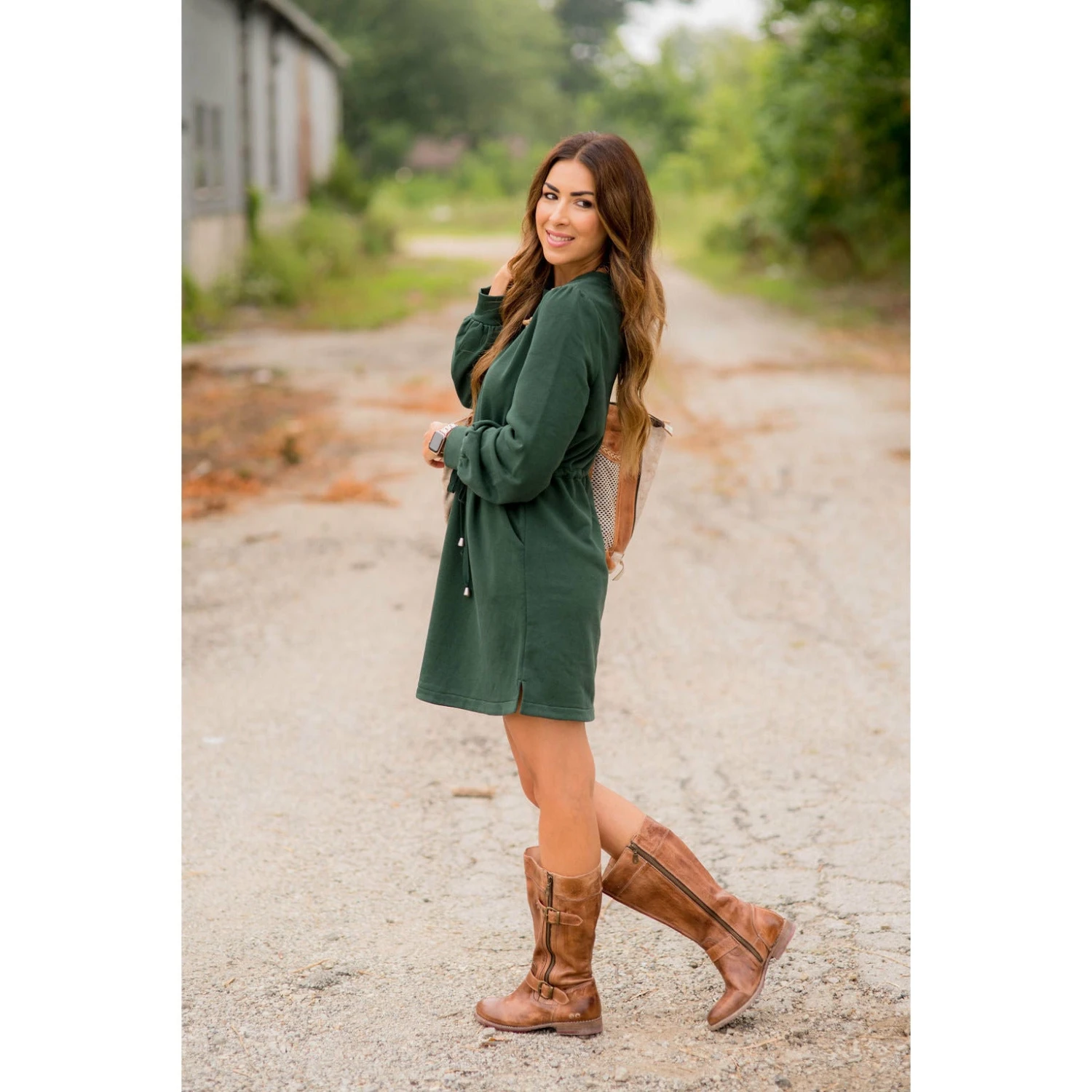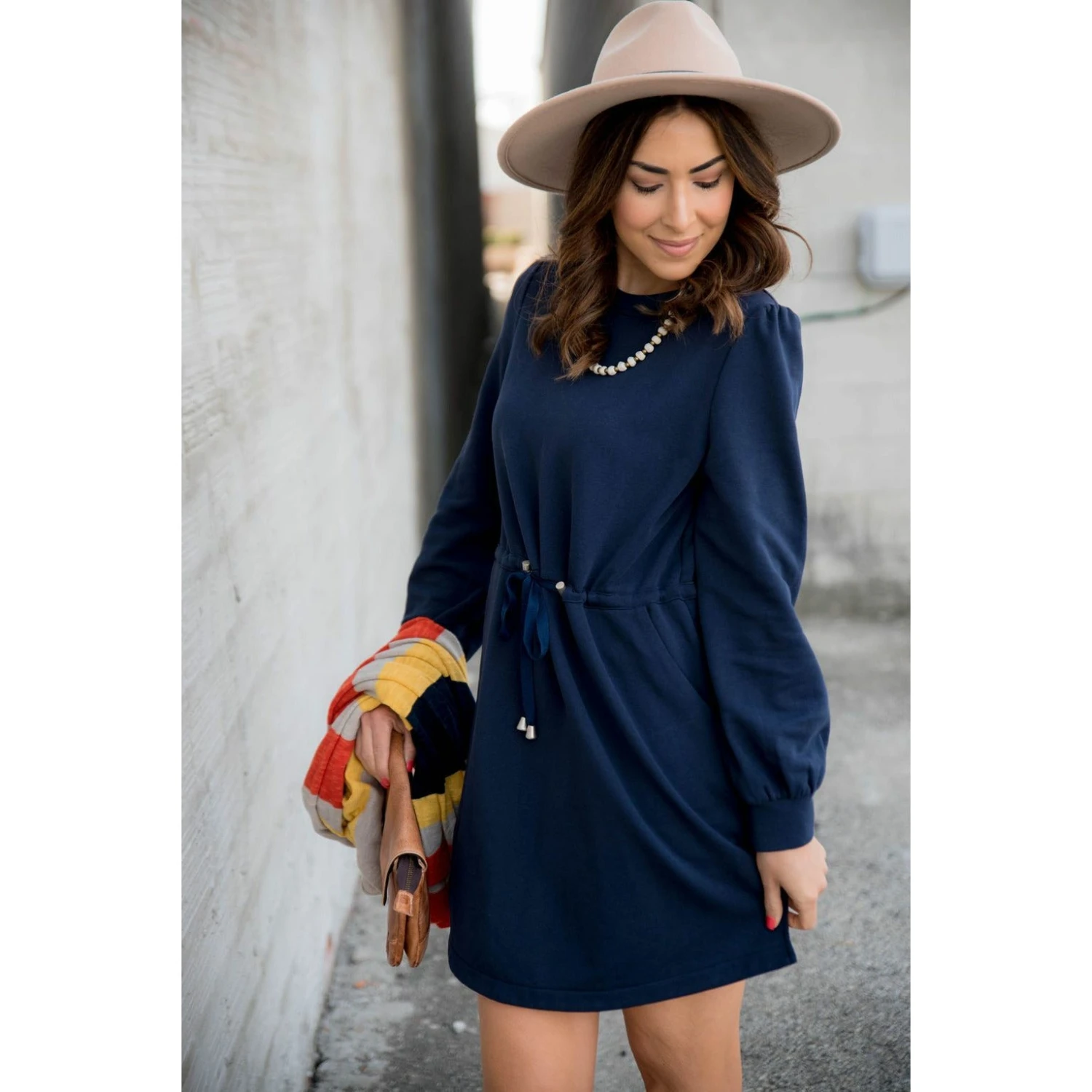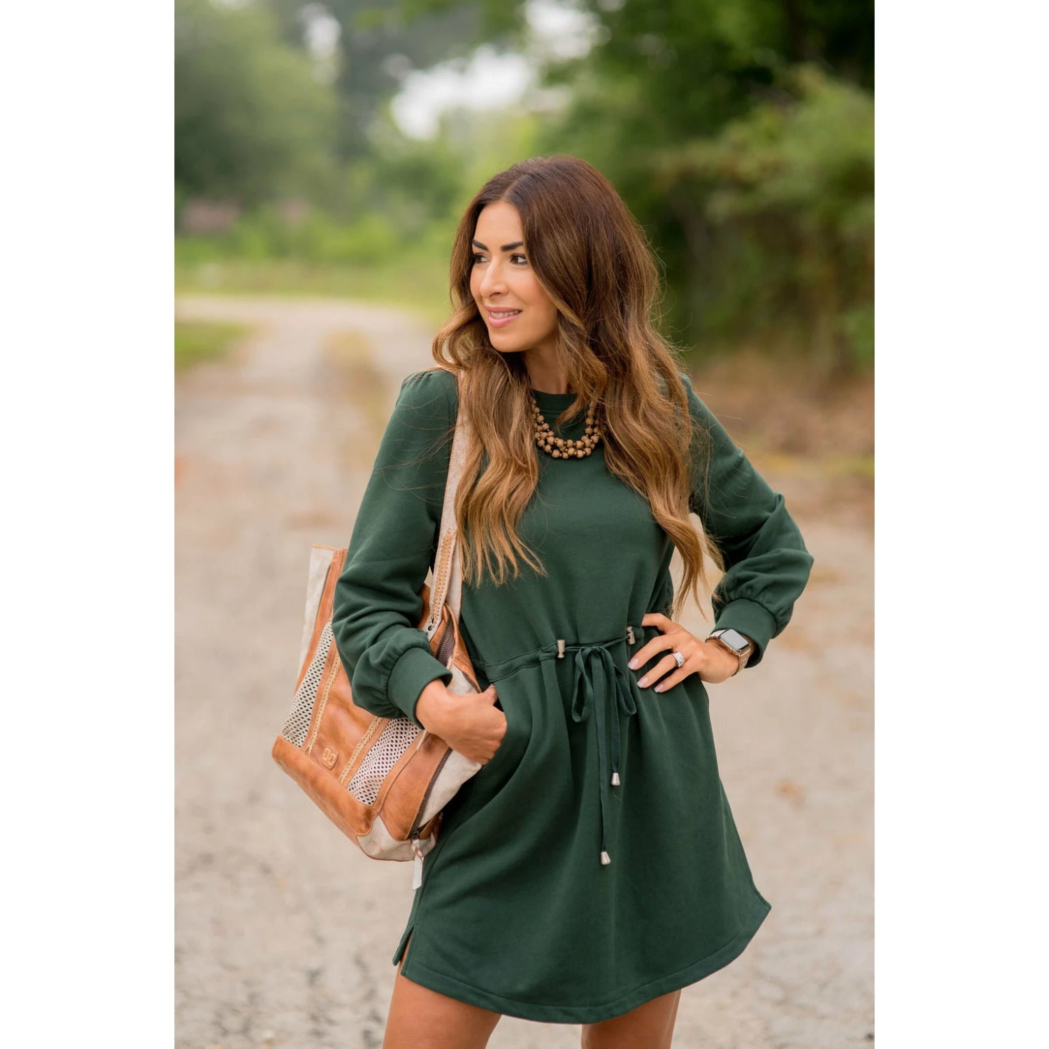 Looking for a dress that is a bit warmer than average> Try the Tie Waist Pocket Sweatshirt Dress! This dress has a cinched waist with tie and long sleeves, which makes it perfect for those colder months! Add a pair of leggings and a cardigan to make this Winter look even better!