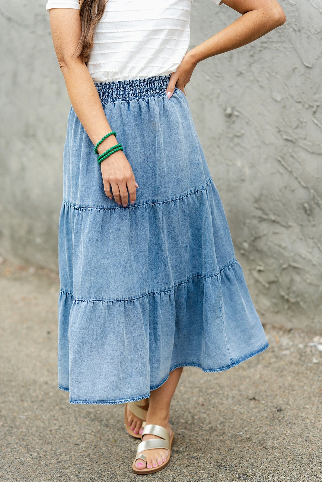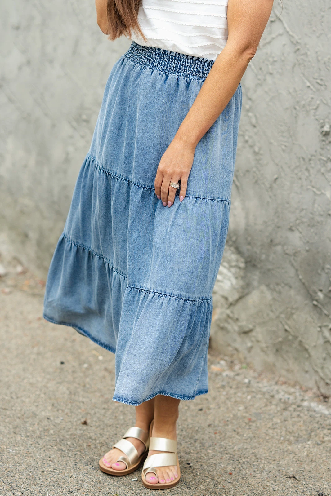 We cannot get over how stylish this skirt is! The classic denim look and tiered style fit makes such a cute, elegant look! Wear this skirt to any event and you are sure to receive compliments! We love tucking a blouse into this for a more elevated look or a basic or graphic tee for a casual feel!
