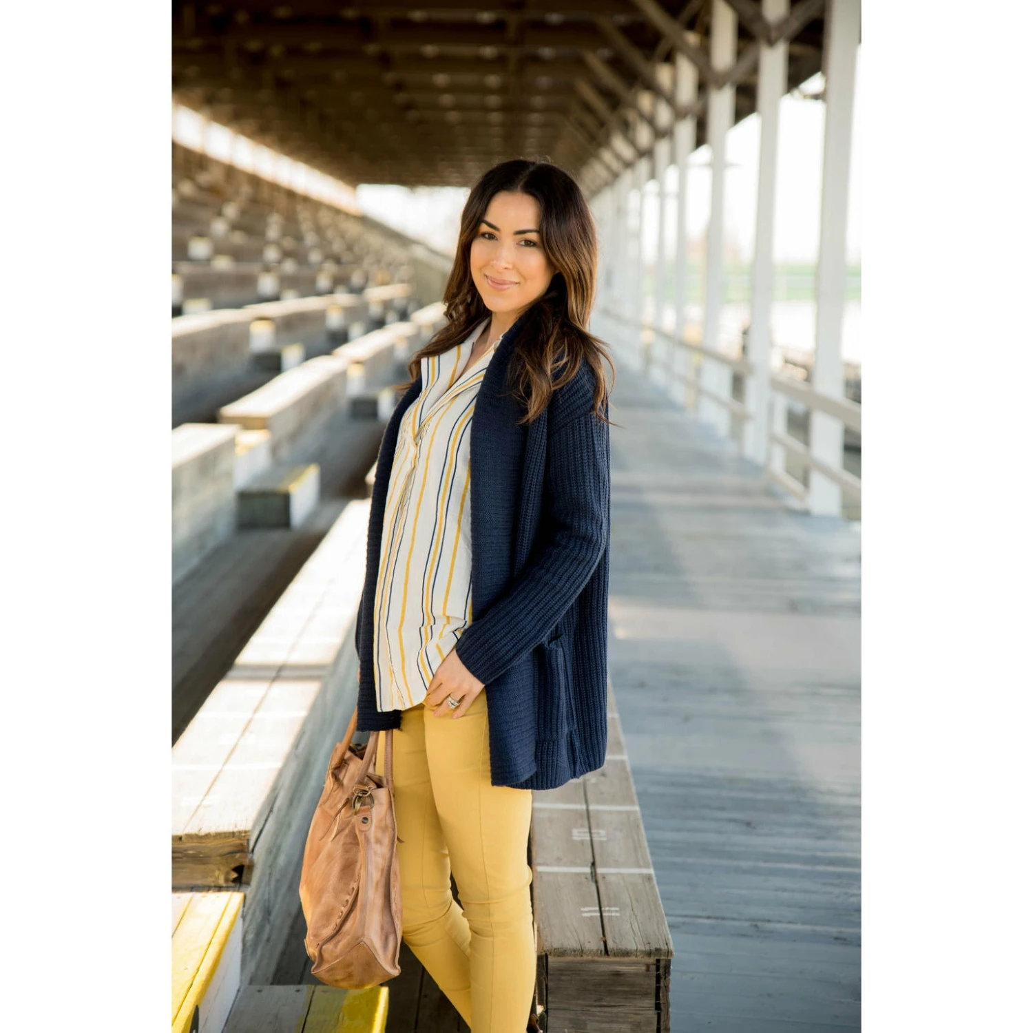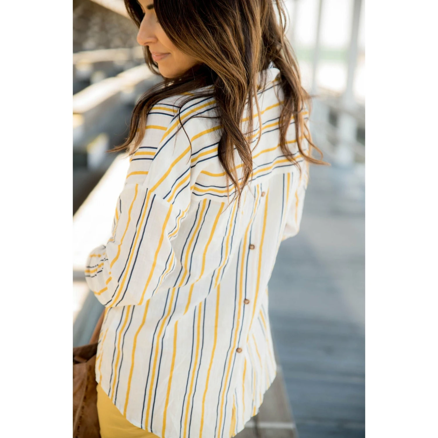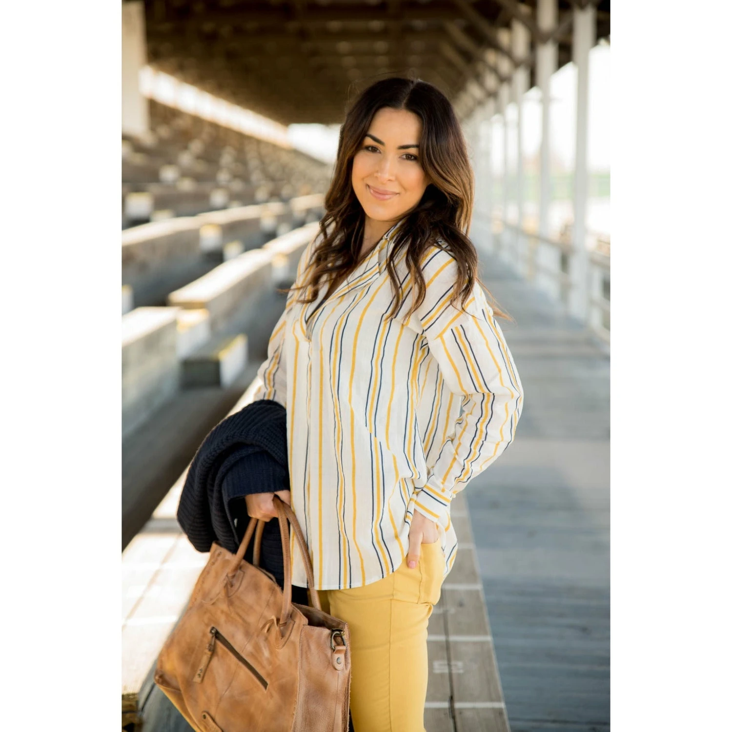 Everybody needs a good button down blouse and this is the perfect one! It can be worn alone or layered with a cardigan for colder days. The button detailing on the back makes this shirt even more unique than any other button down blouse.