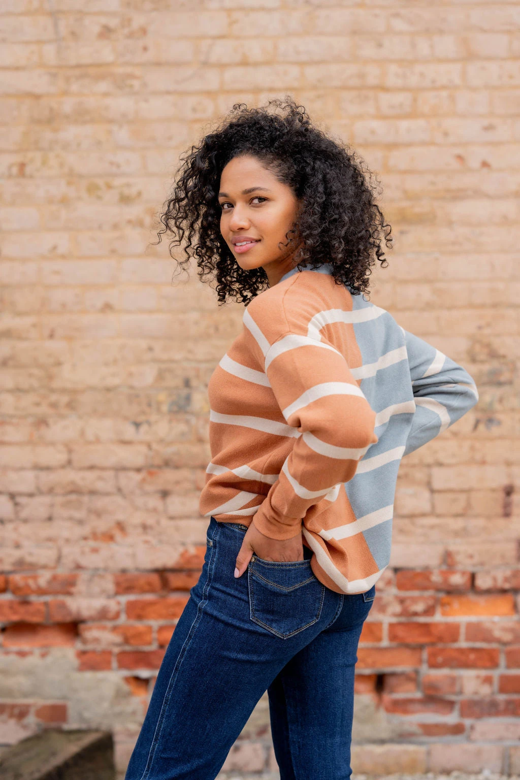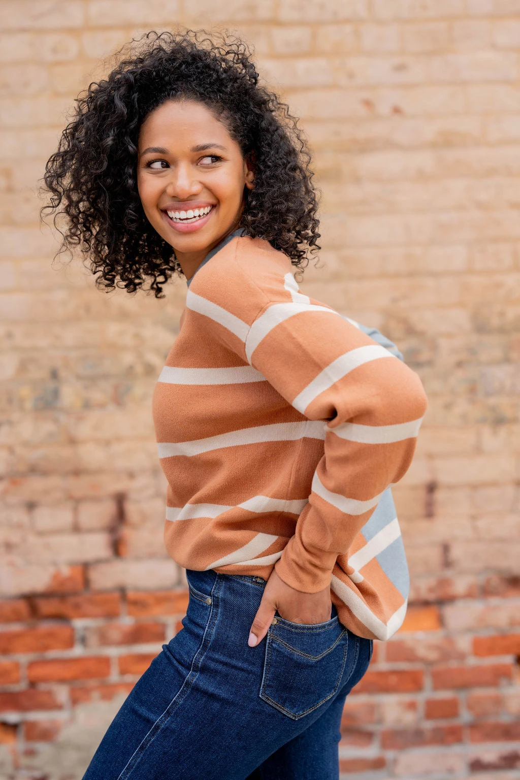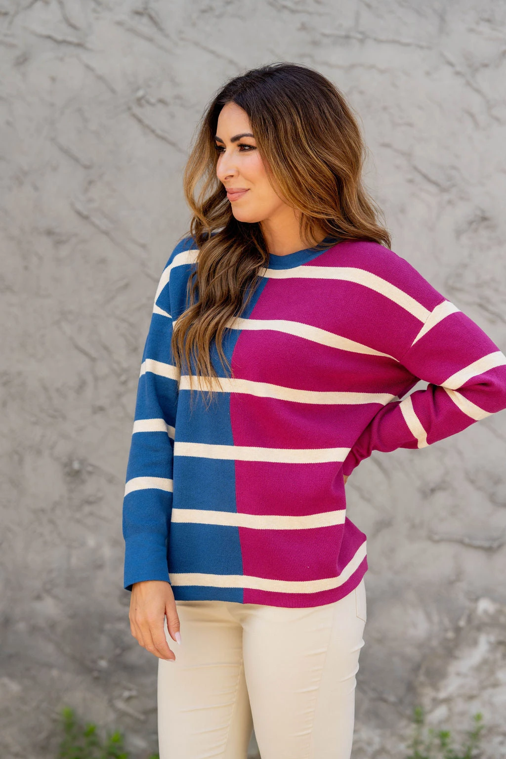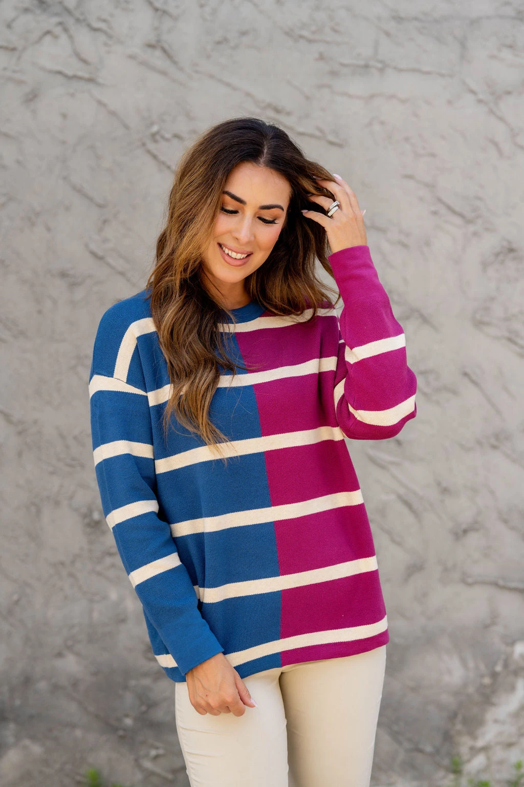 Sweater weather is upon us and we’re in love with this one! The two tone look and the stripes are so simple yet so chic! Pair this sweater with jeans, accessorize and add your favorite pair of shoes for a quick, stylish look! Chilly? Add a vest or jacket with ease!!