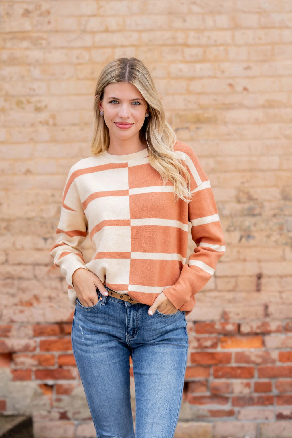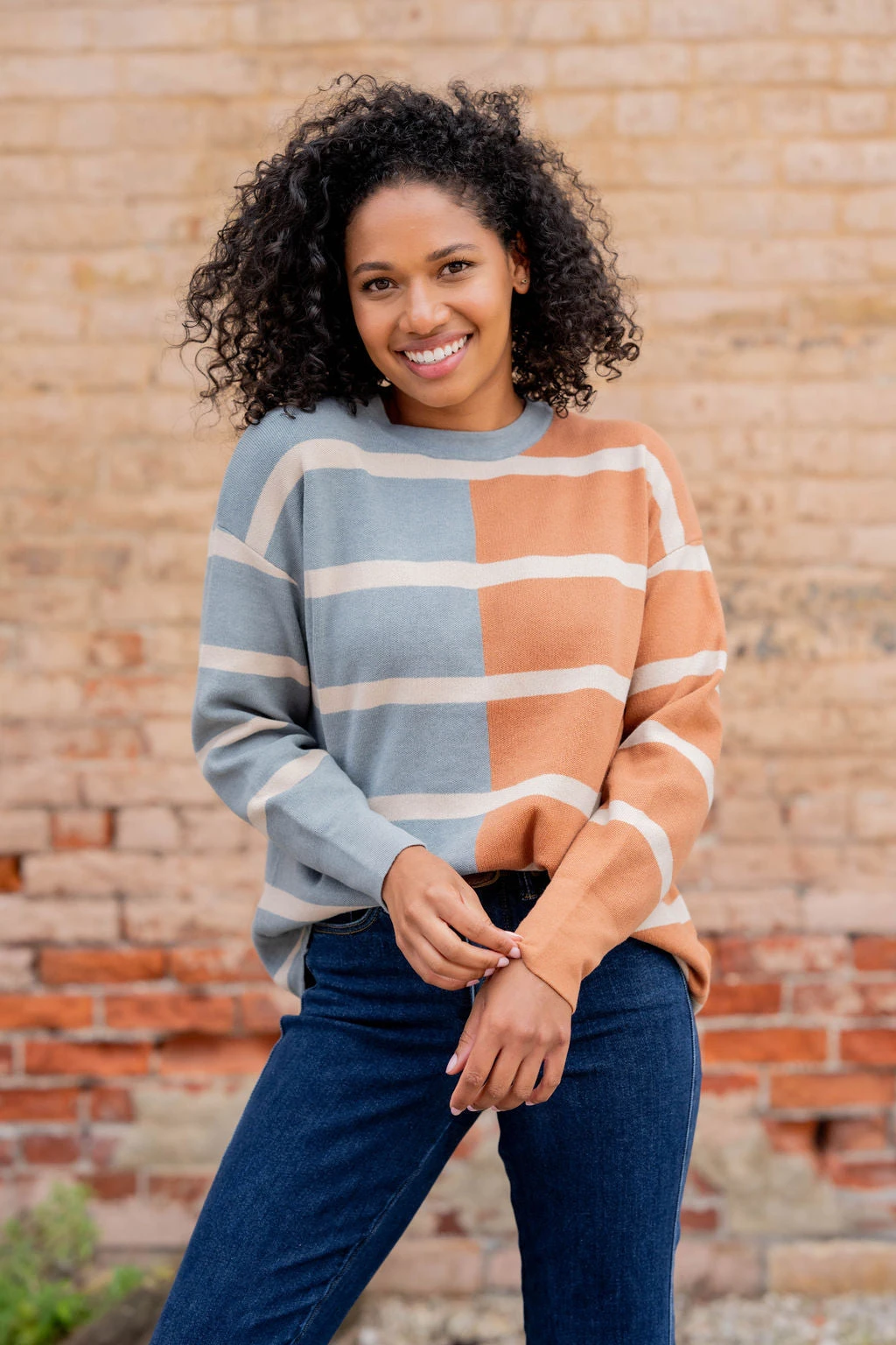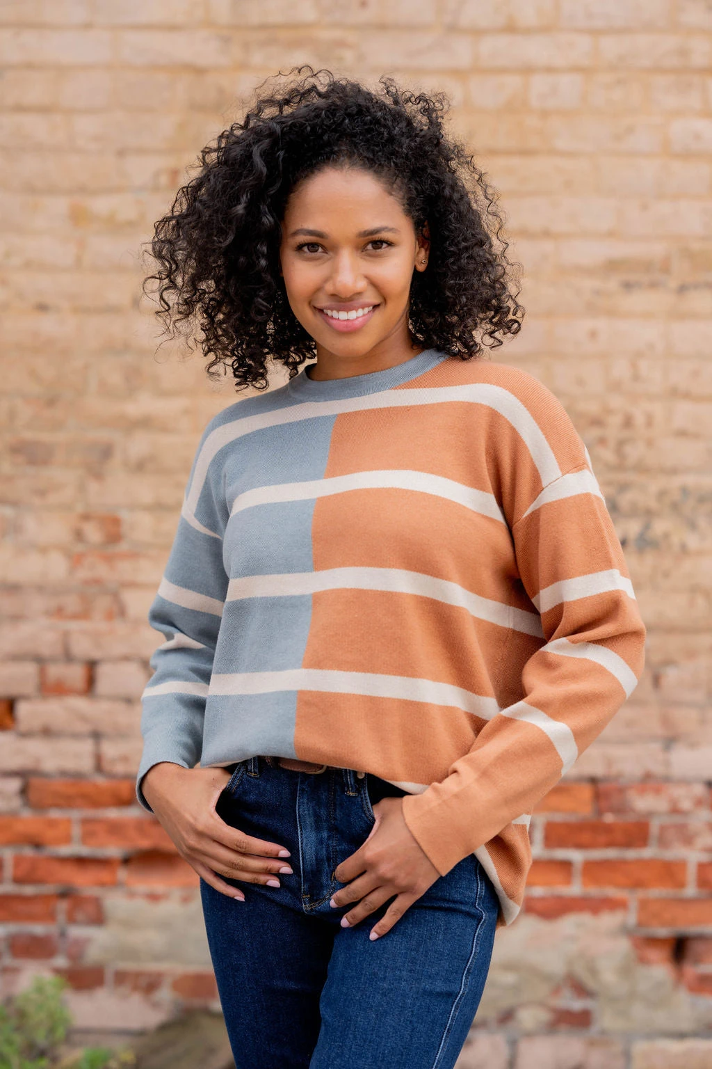Sweater weather is upon us and we’re in love with this one! The two tone look and the stripes are so simple yet so chic! Pair this sweater with jeans, accessorize and add your favorite pair of shoes for a quick, stylish look! Chilly? Add a vest or jacket with ease!!