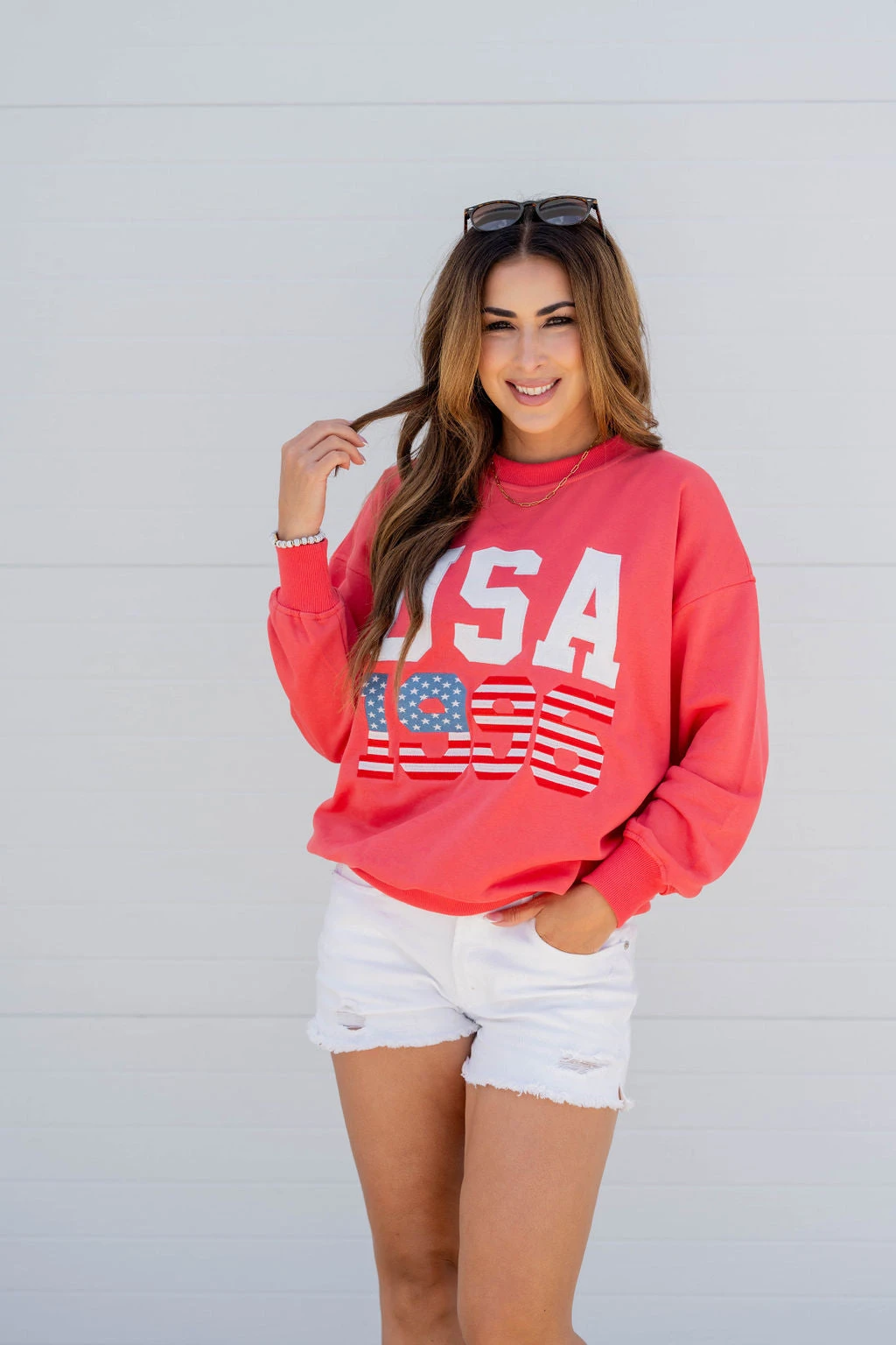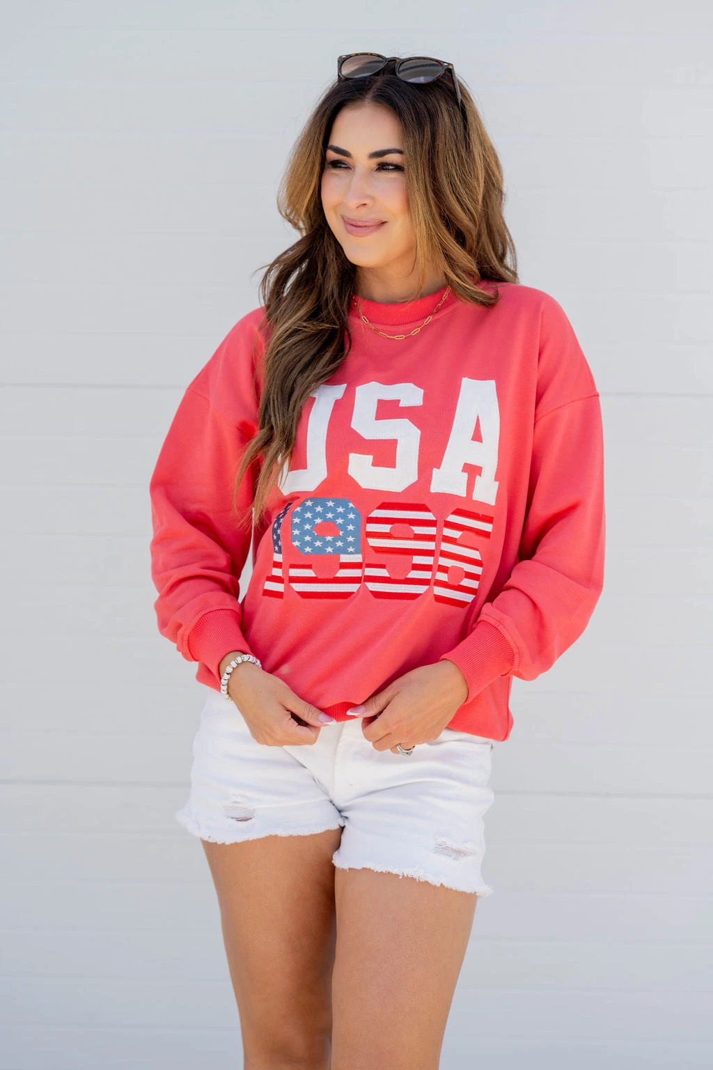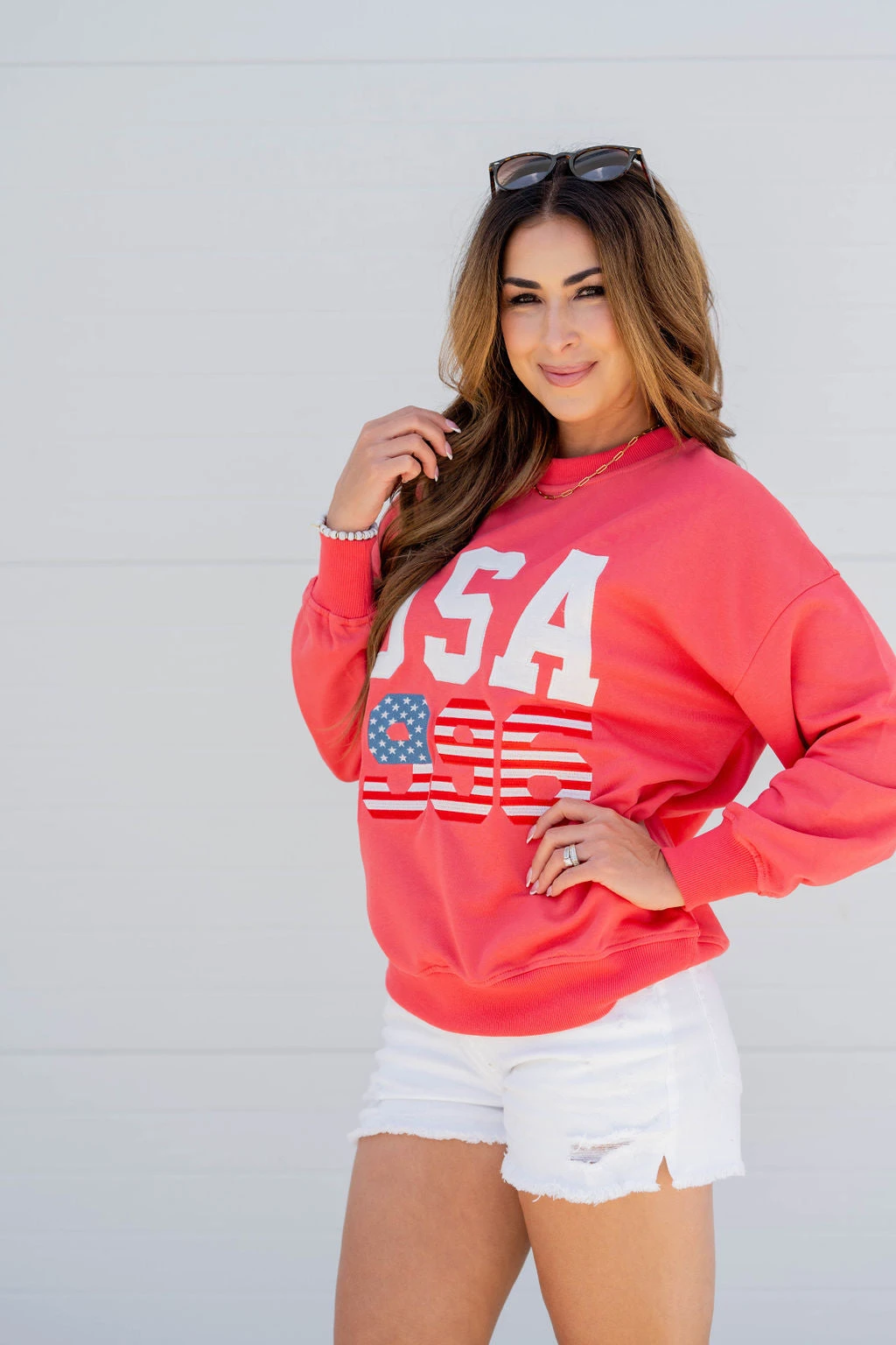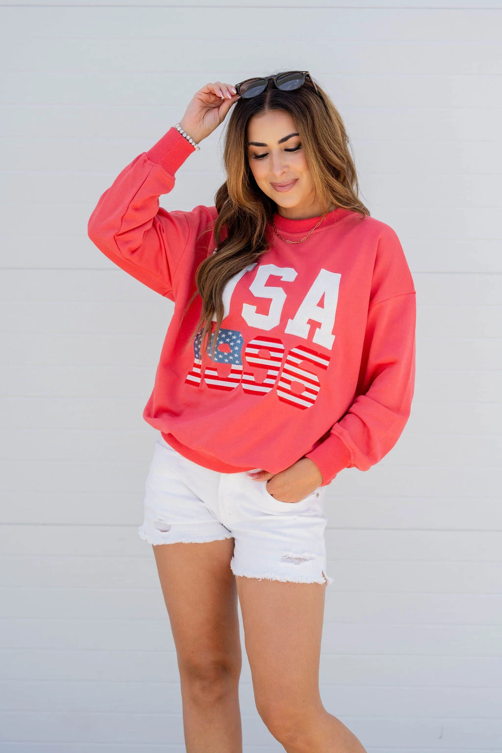 Feel patriotic in this one-of-a-kind sweatshirt! This super soft and cozy graphic crewneck is sure to become a new fan favorite! Pair with shorts to transition you into warmer months or with your favorite denim, joggers, or leggings for the cooler ones! Add a vest or shacket for an extra layer of warmth and style!