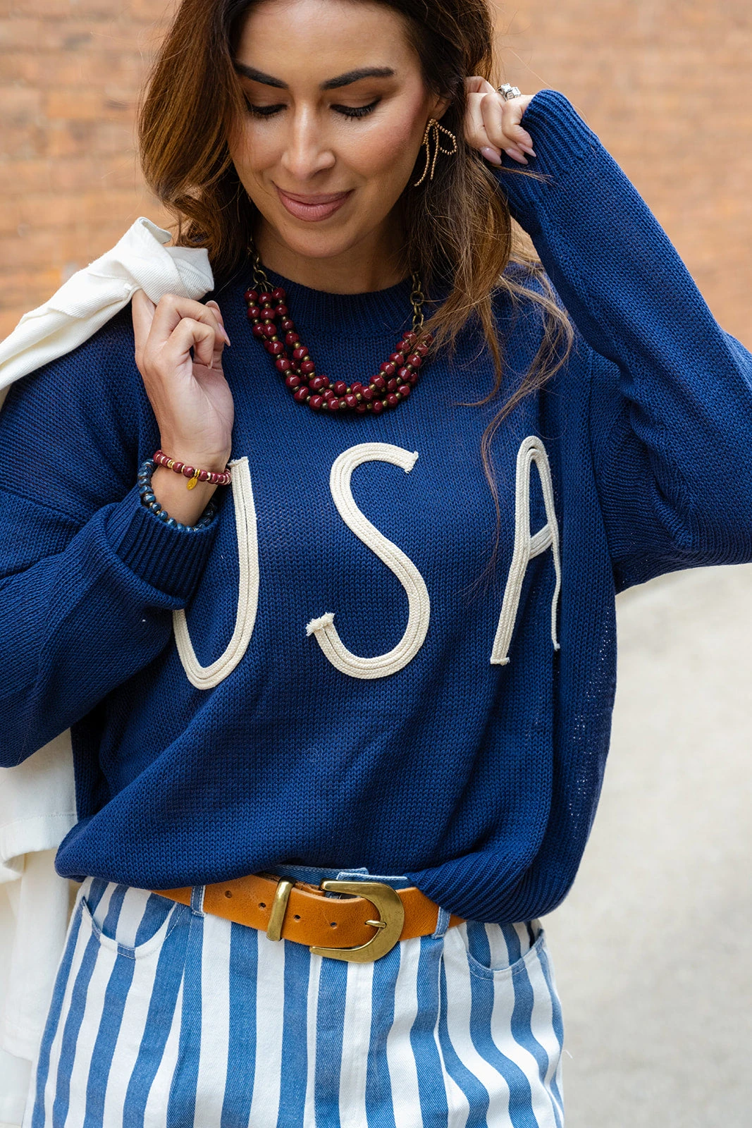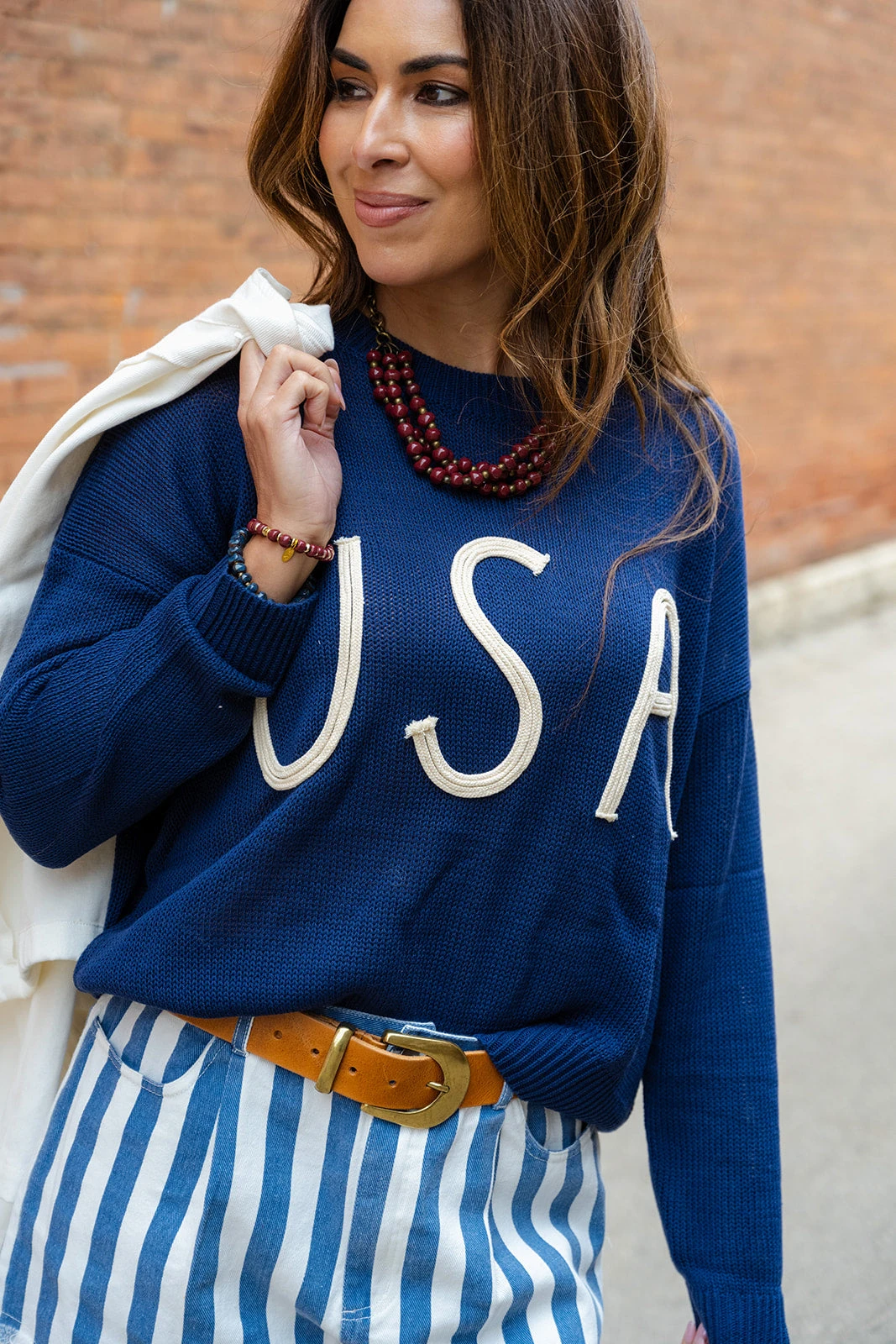 Feel patriotic in this sweater! Lightweight and soft and oh so perfect for any season! Pair with shorts or a skirt for the warmer months or leggings, denim or joggers for the cooler ones!