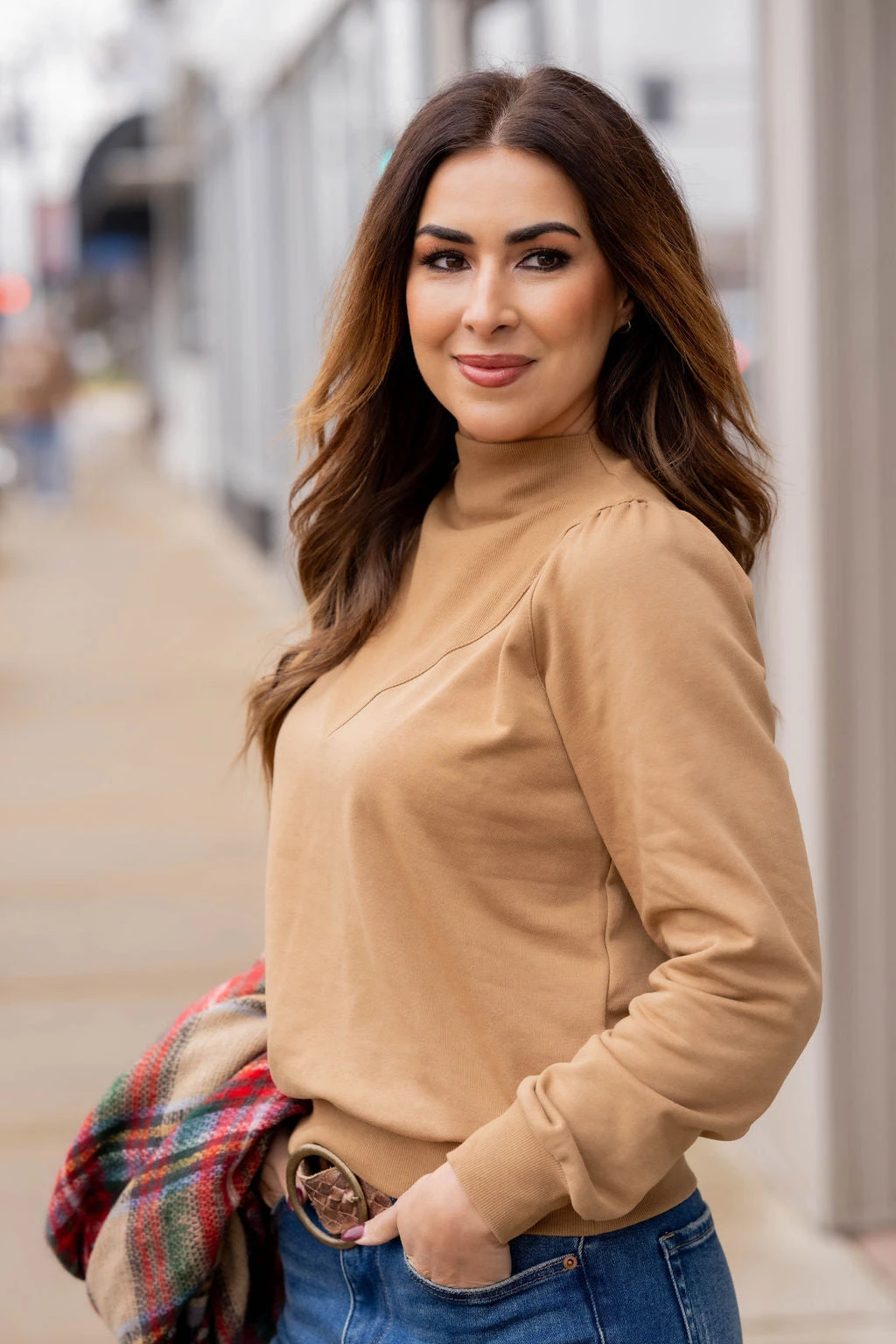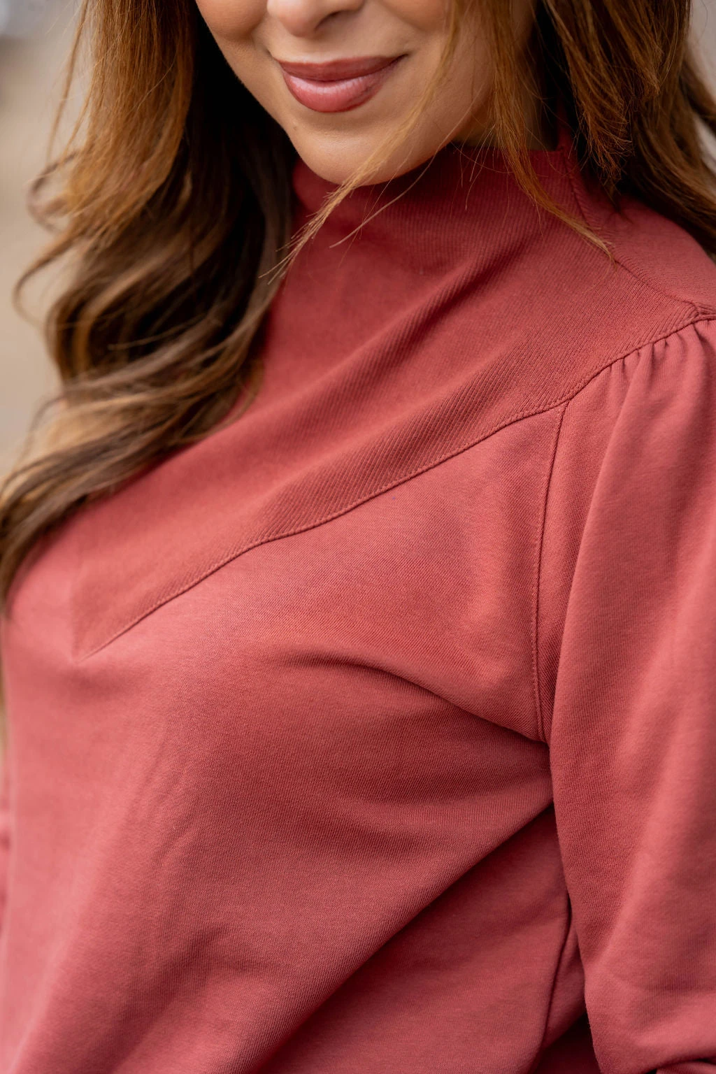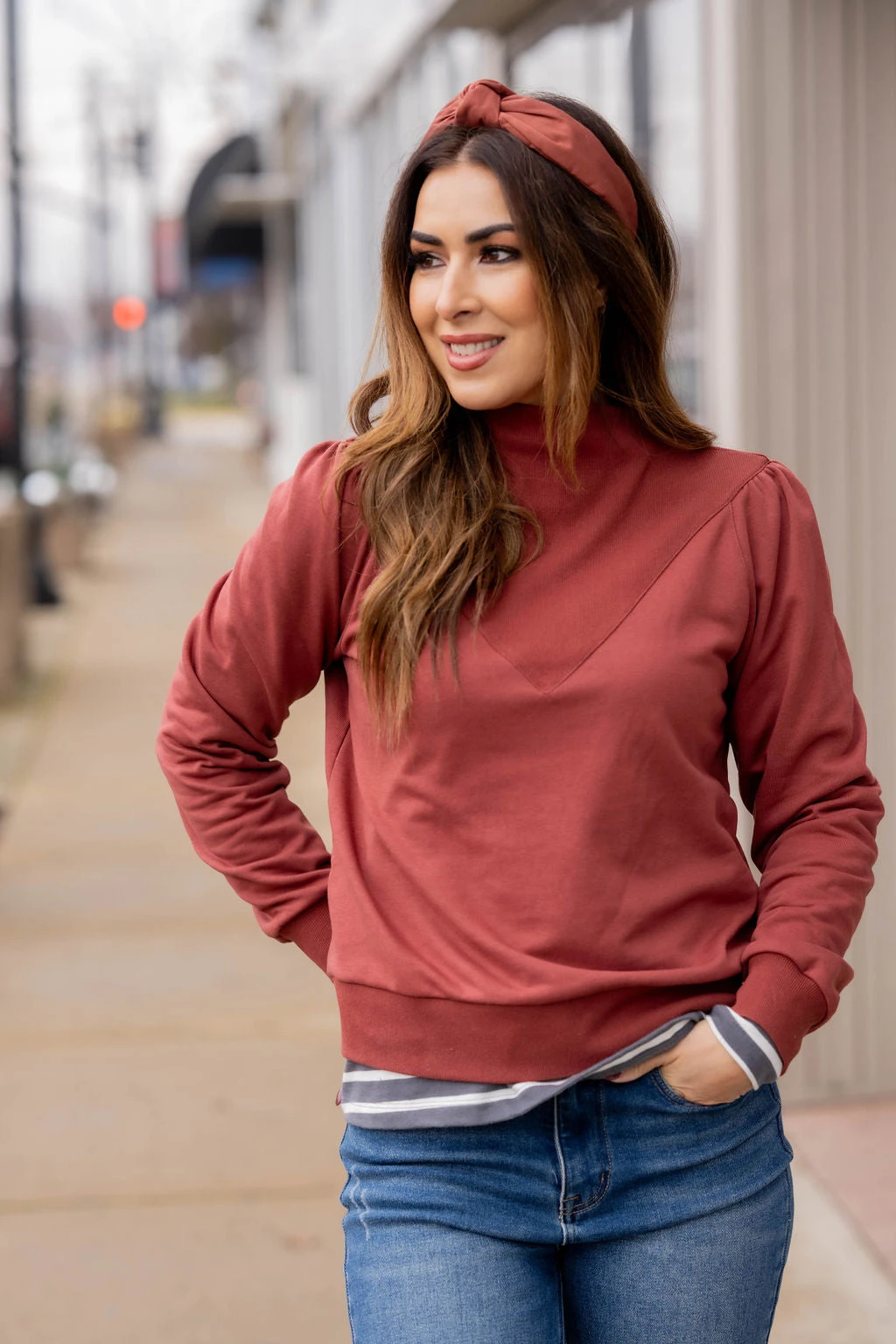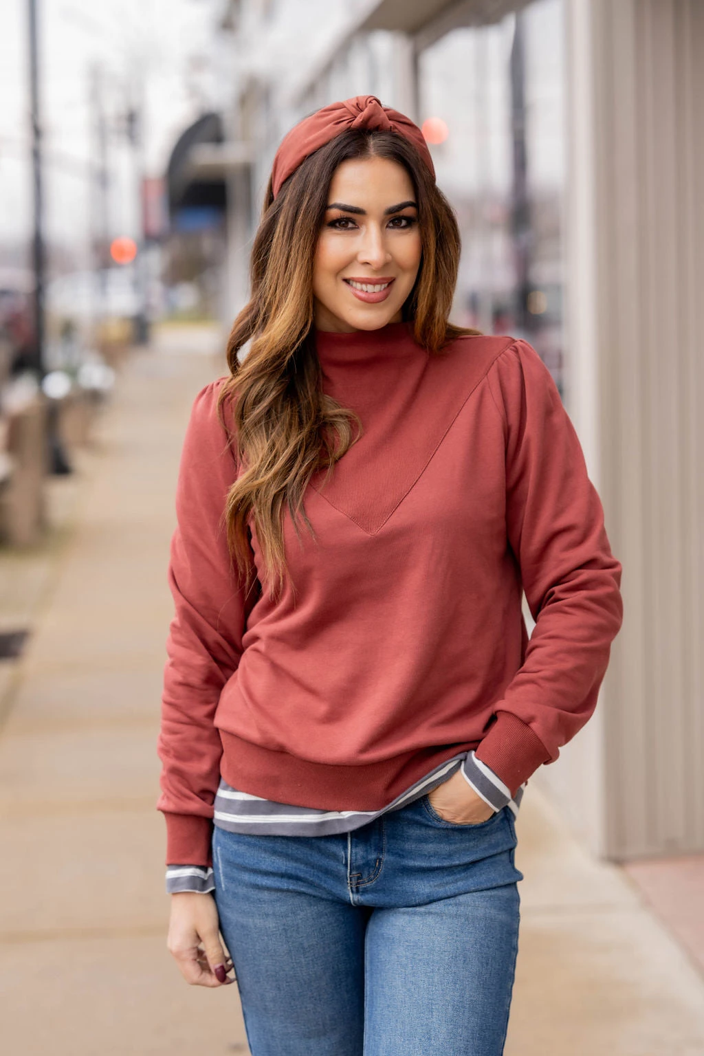 A fun sweatshirt with added ribbed detailing inside the v and a mock neck! We love how the small details elevates this so you can wear it more casually or dressed up! Pair with denim, joggers, leggings, or even our Betsey’s Jeggings for a quick and cute look! Chilly? Add a vest, cardigan, or shacket!Â
