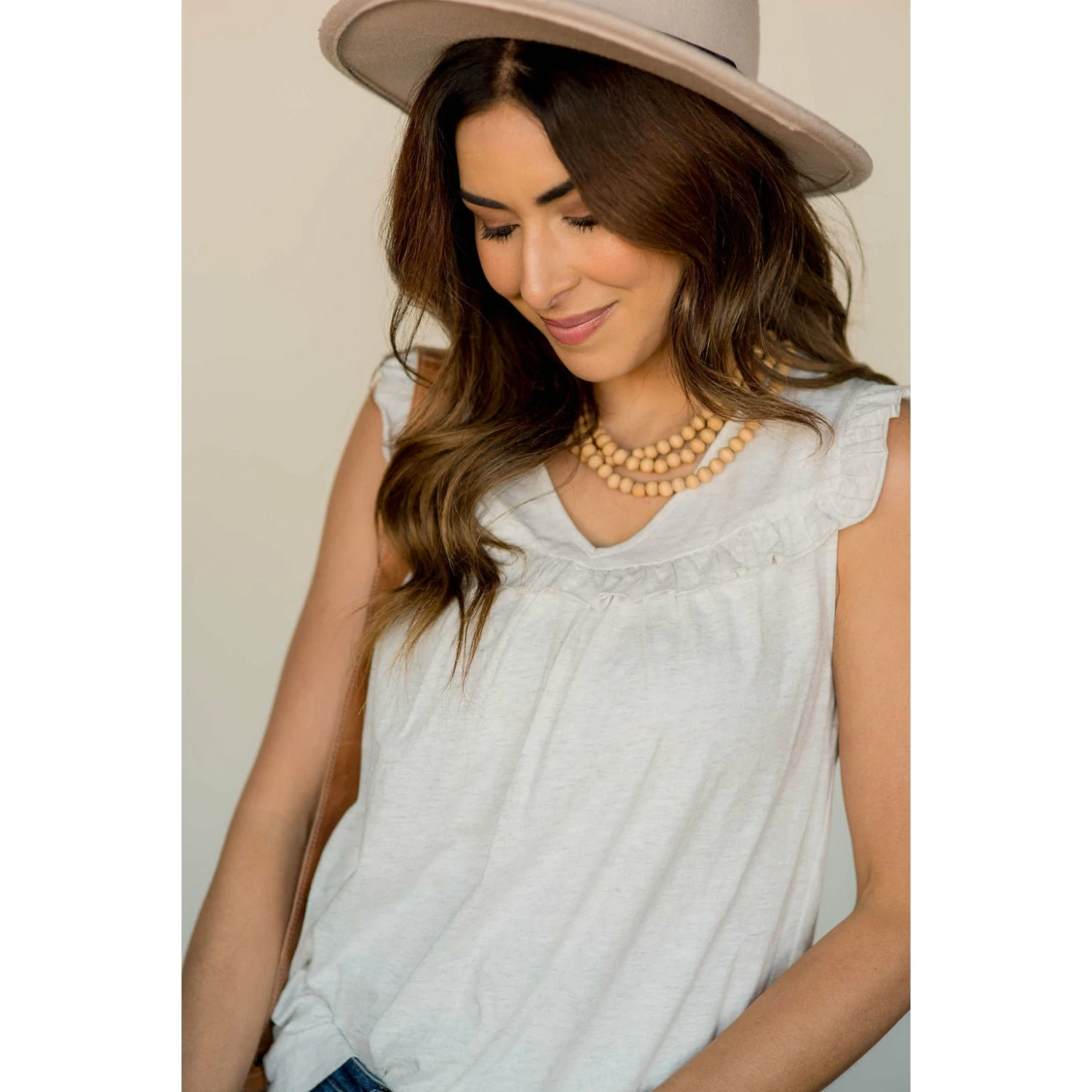 Tanks are a necessity in every closet. They can be worn by themselves in warmer weather or layered in colder weather. We love the sophisticated look of this tank! The small detailing of ruffles sets this tank apart from others. Pair with a cardigan for added color and style!