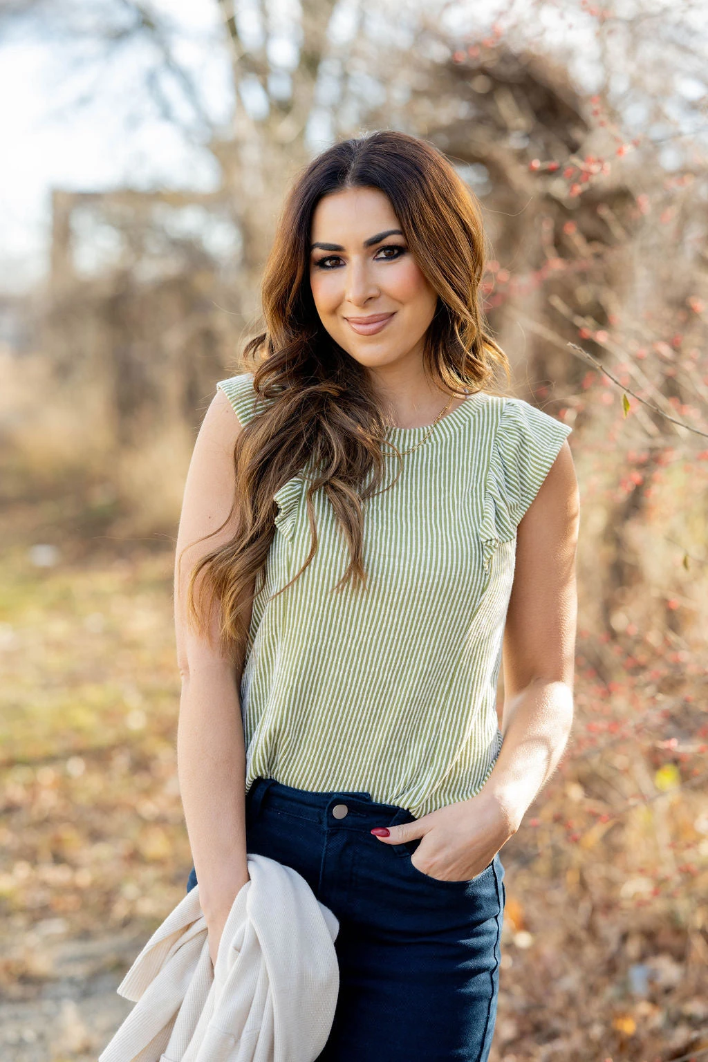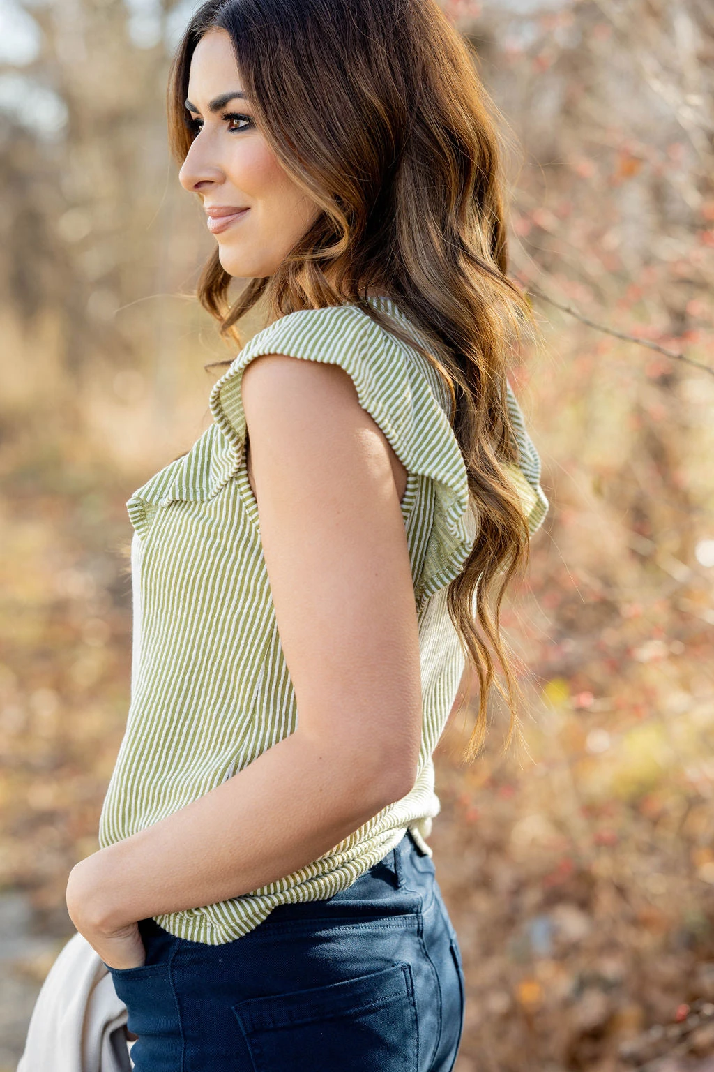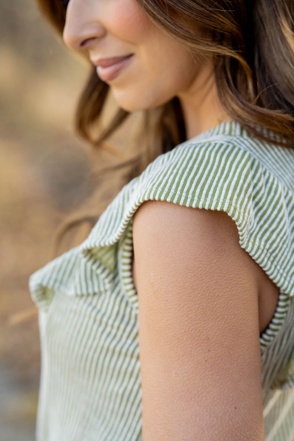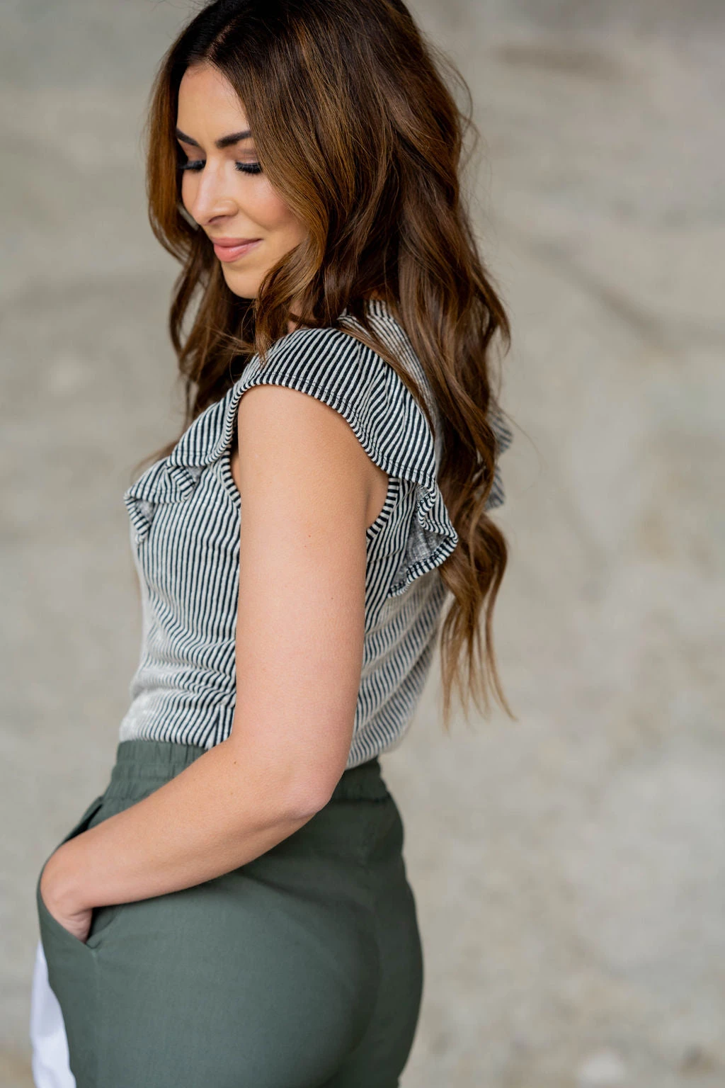A basic tee taken to the next level with the cute and classy flutter sleeves and a ribbed texture! Pair this with a cute pair of high-waisted shorts or a skirt for the warmer months or use it as a layering piece with a cardigan or shacket for the cooler ones!