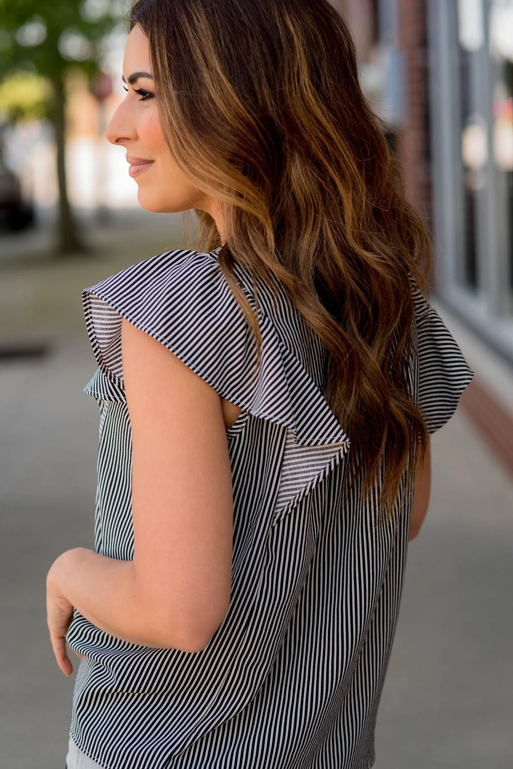 A simple soft and lightweight tank elevated with fun stripes and double flutter trim! We love that this can be worn in the summer with shorts or a high-waisted skirt in the warmer months or with denim, leggings, joggers, or our Betsey’s Jeggings in the cooler months! This can also be dressed up or down for wherever the day takes you!