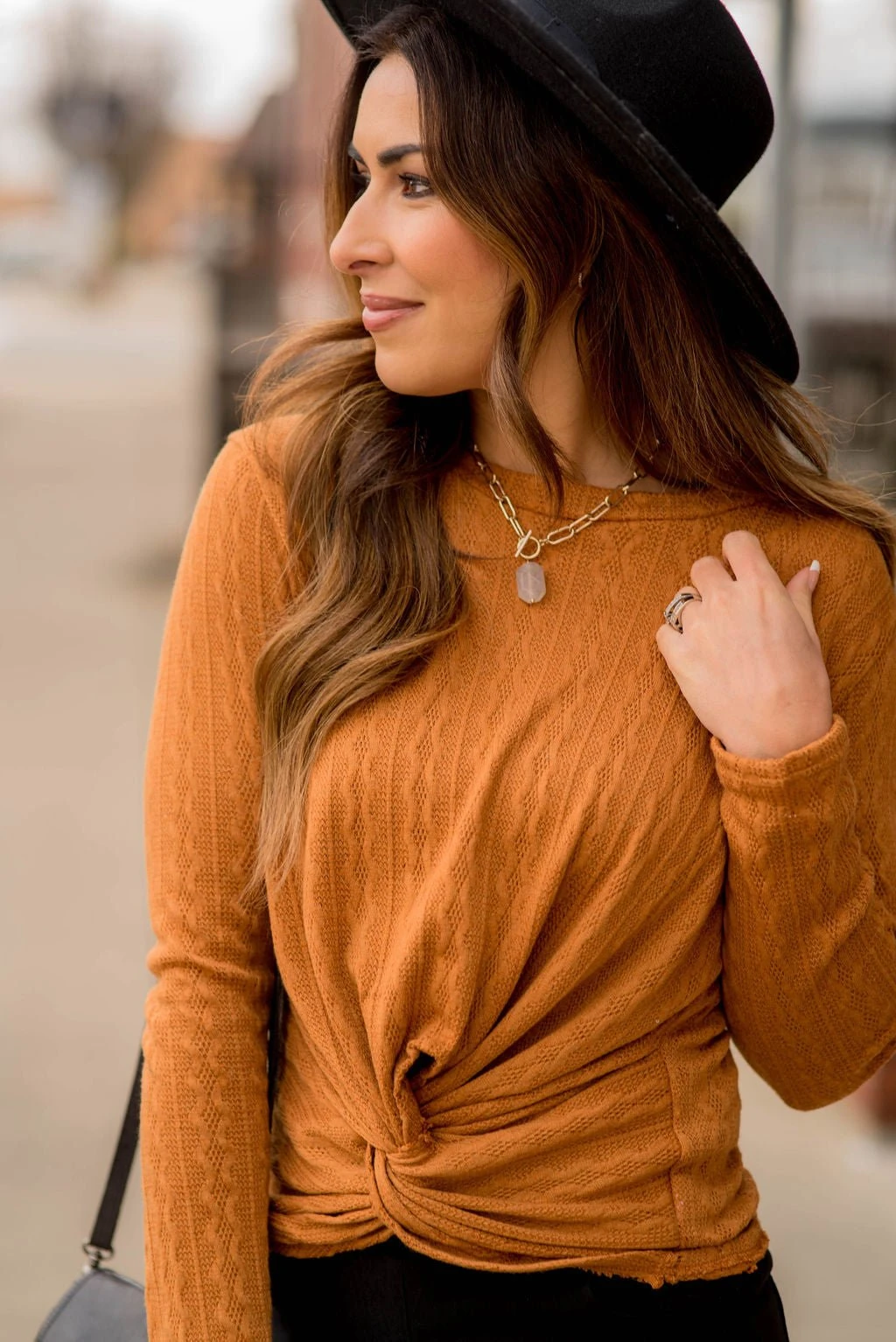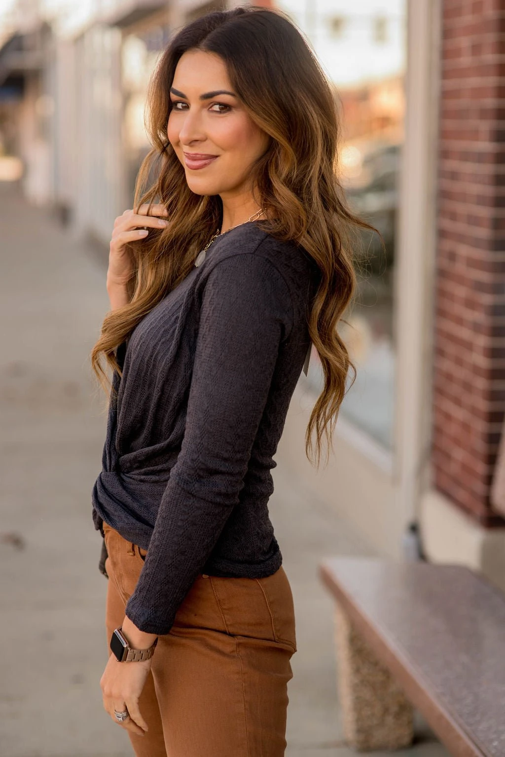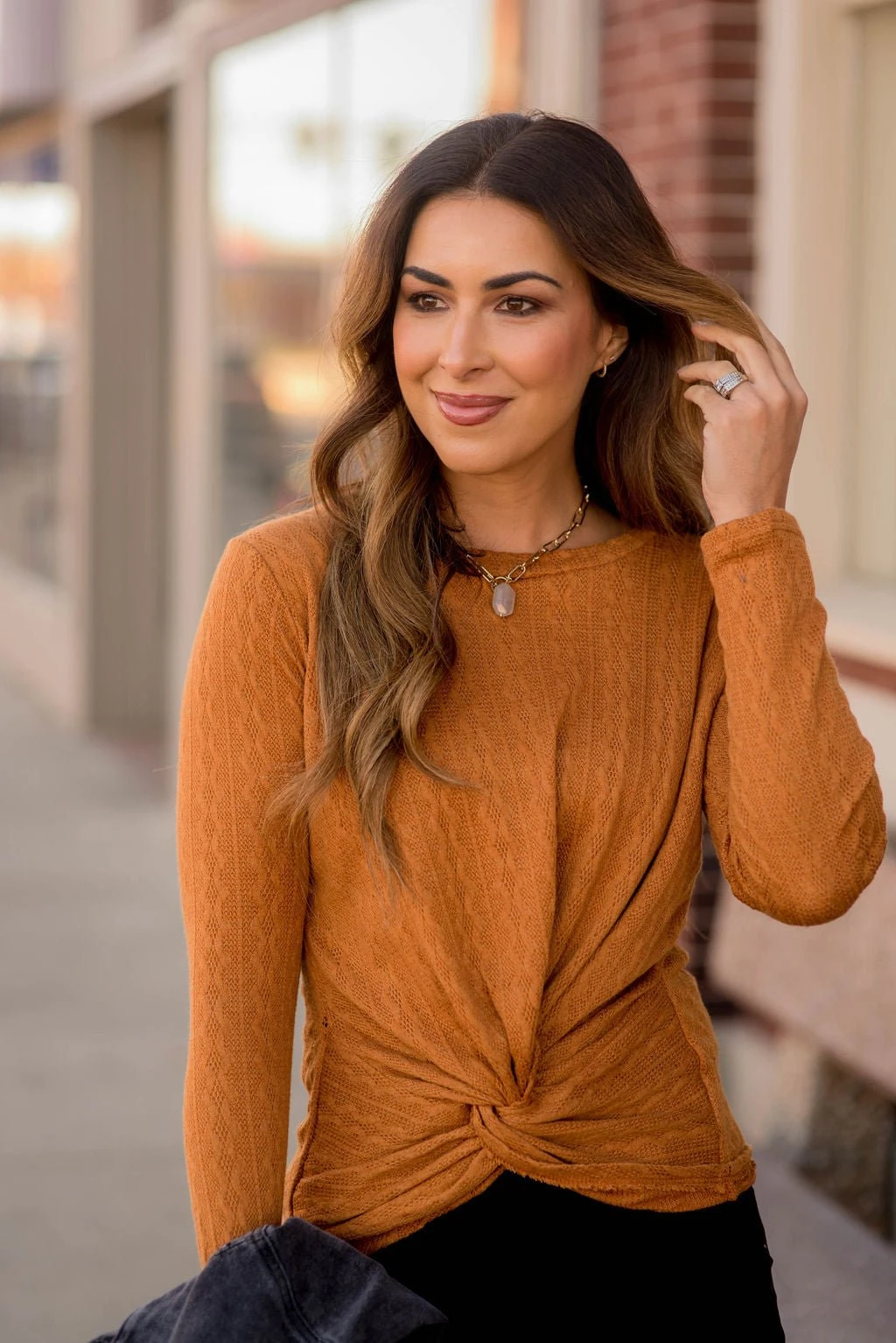 A lightweight long sleeve tee elevated with the vertical textured pattern and knot front detailing! Wear this alone or use as a layering piece with your vests, cardigans, or shackets! We love that this can be dressed up or down for wherever the day takes you!