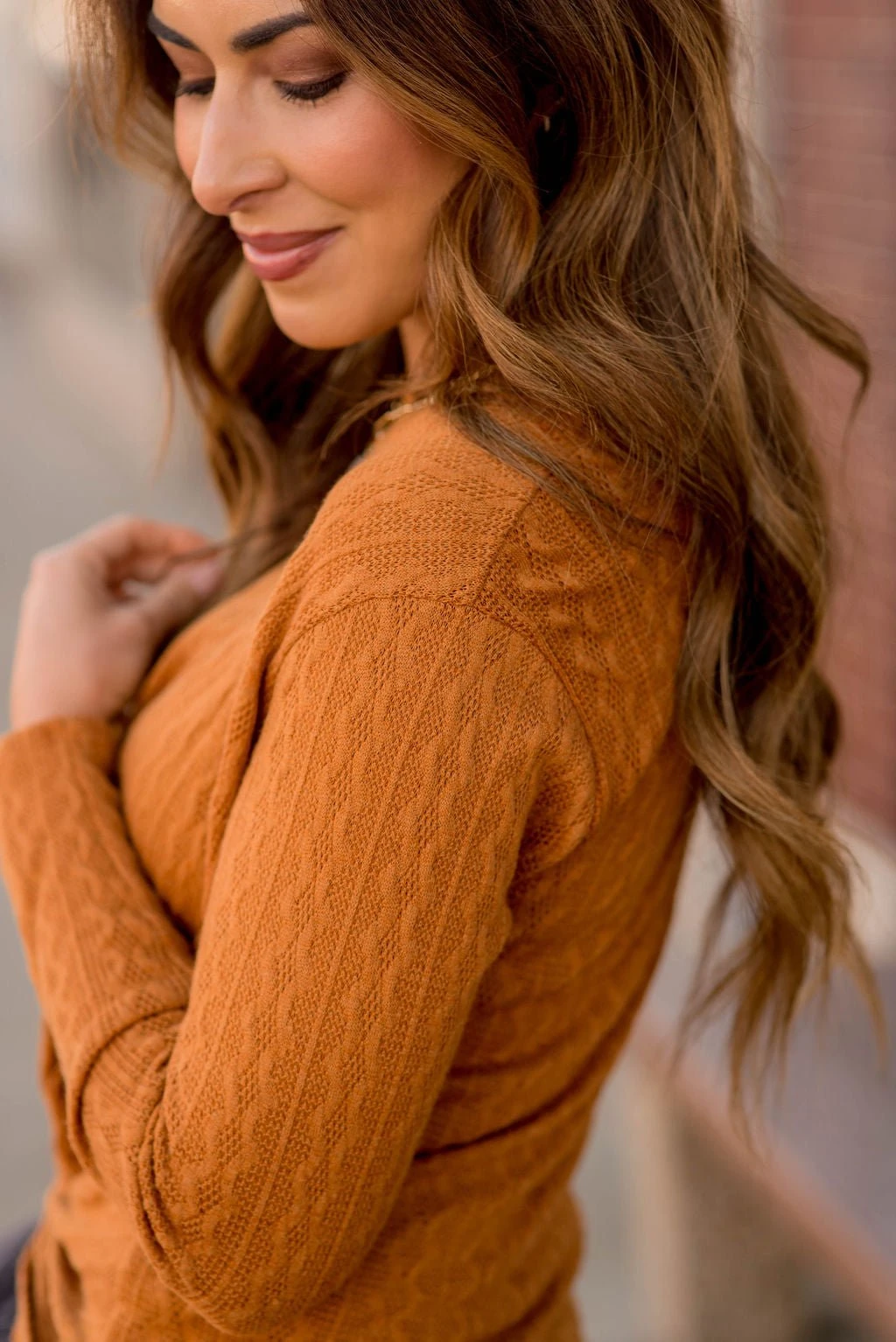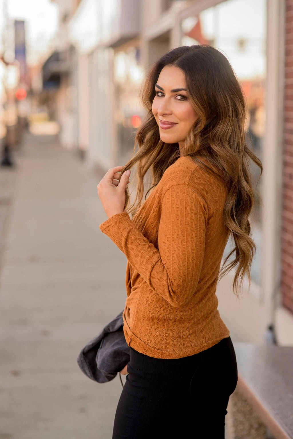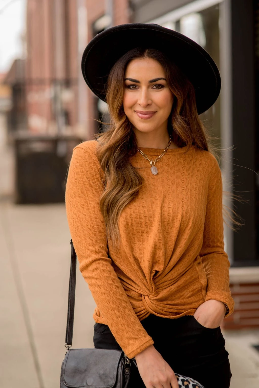 A lightweight long sleeve tee elevated with the vertical textured pattern and knot front detailing! Wear this alone or use as a layering piece with your vests, cardigans, or shackets! We love that this can be dressed up or down for wherever the day takes you!
