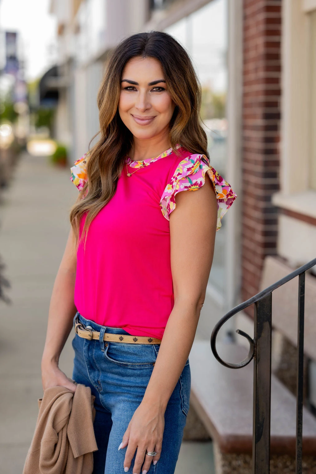 With a solid-colored body and a bold printed double flutter sleeve, this tee just screams sunny days! This is easily paired with shorts or a skirt for those hot sunny days or you can add denim or a bold-colored pair of our Betsey’s Jeggings for the office or the classroom! This is definitely going to stand out from the rest of your wardrobe!