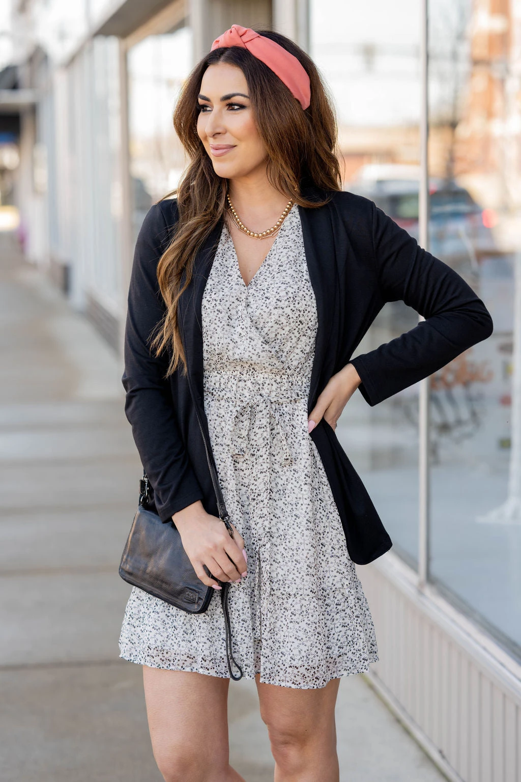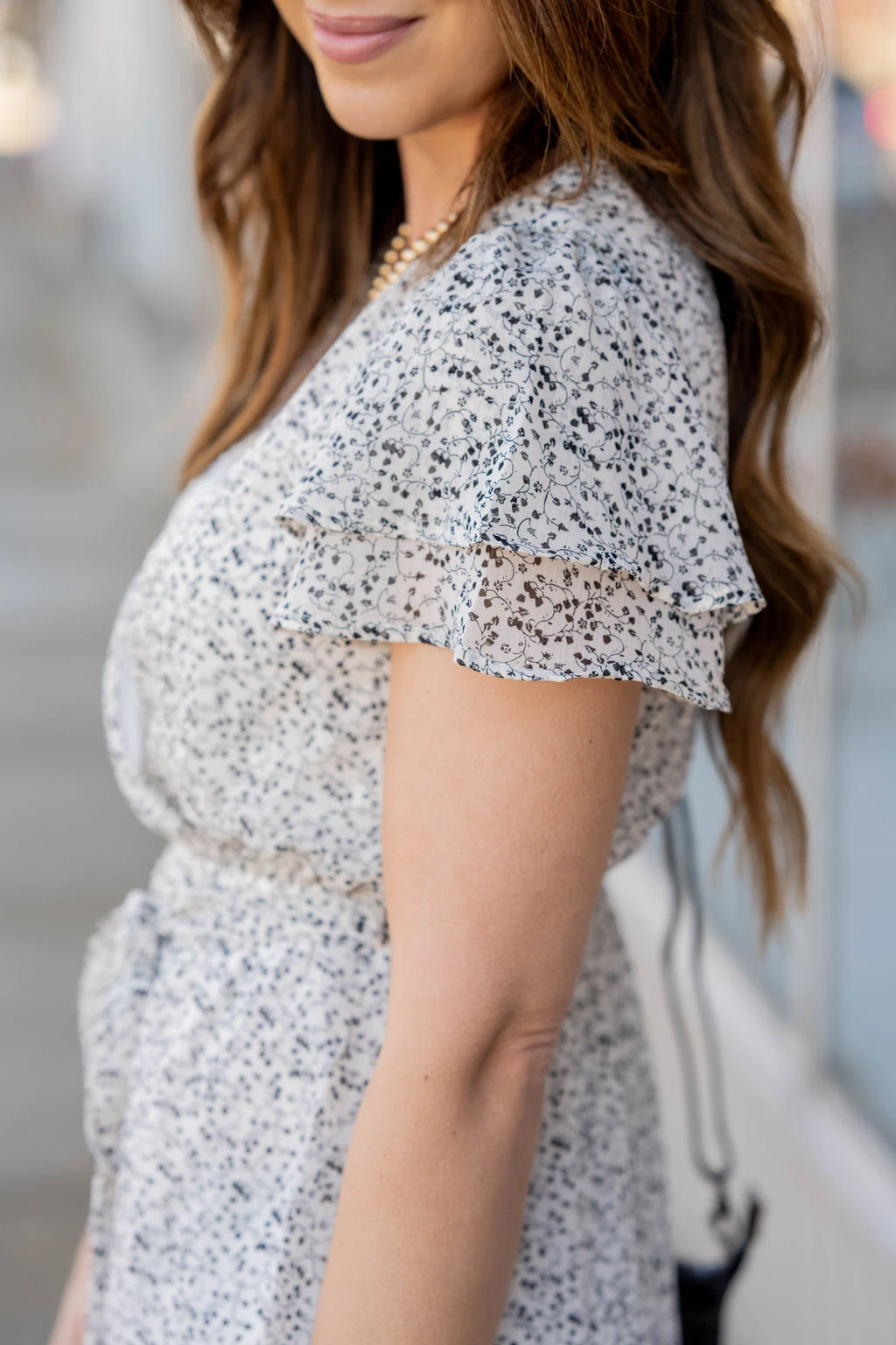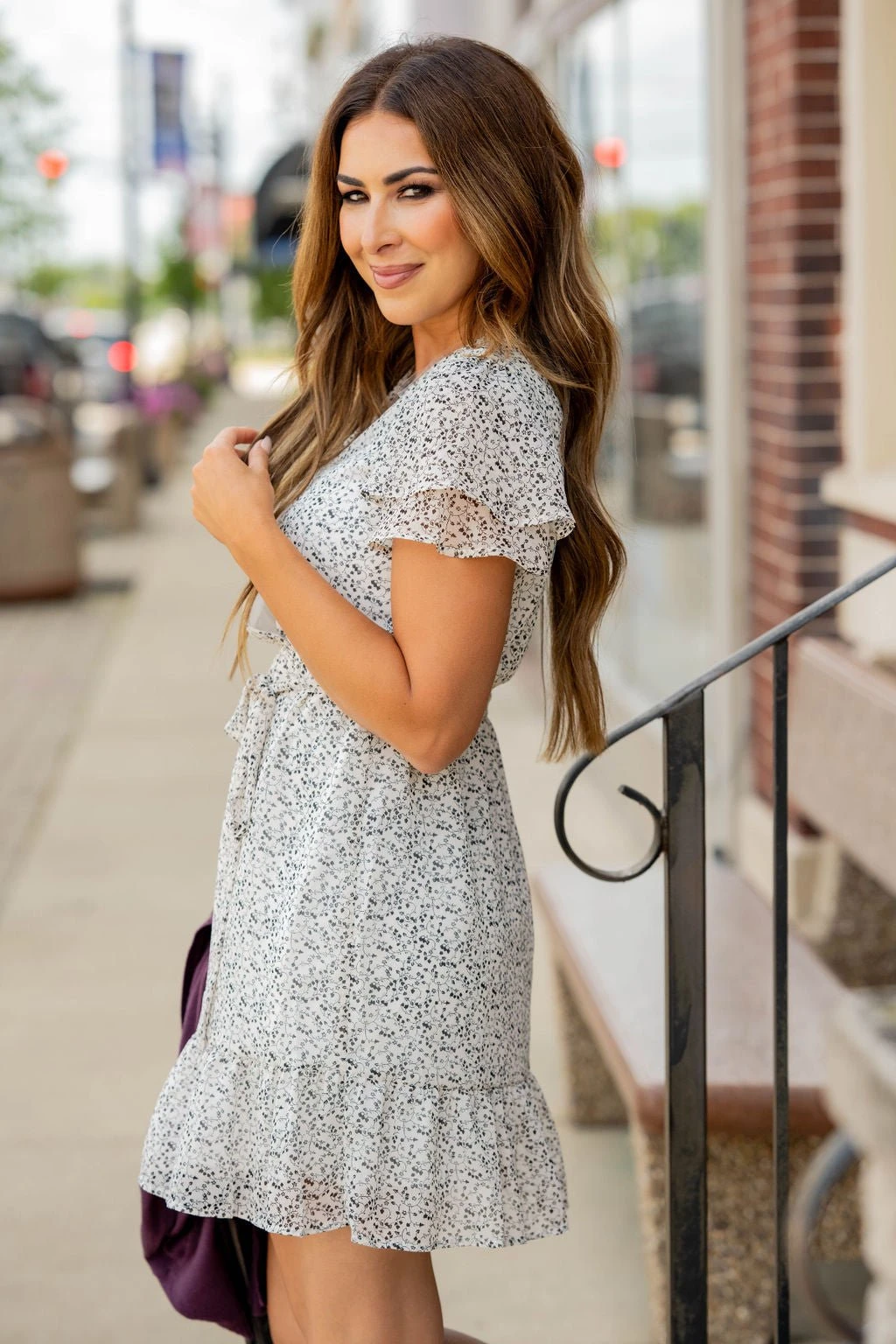 This dress gives us major feminine and flirty vibes! The lightweight and breathable material makes it ideal for those hot days but this can just as easily be layered with a cardigan or denim jacket and boots! The faux wrap style and tie waist gives a nice slimming effect and we’re loving the double flutter sleeves and ruffle bottom accent to set it apart from the rest!