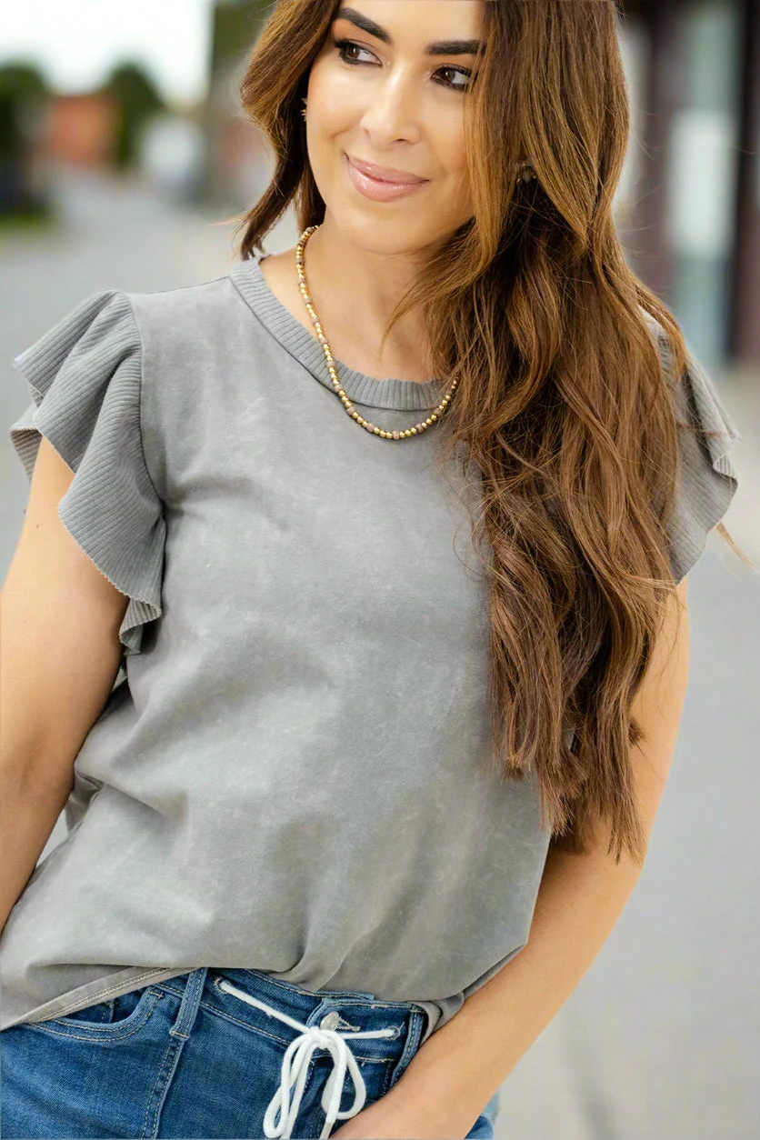 A simple vintage washed tee accented with ribbed material to give this a unique twist! Wear alone in the warmer months or use as a base for your layering pieces in the cooler ones! We love that this can be elevated with your favorite accessories for work or it can be thrown on with joggers and sneakers for on-the-go!