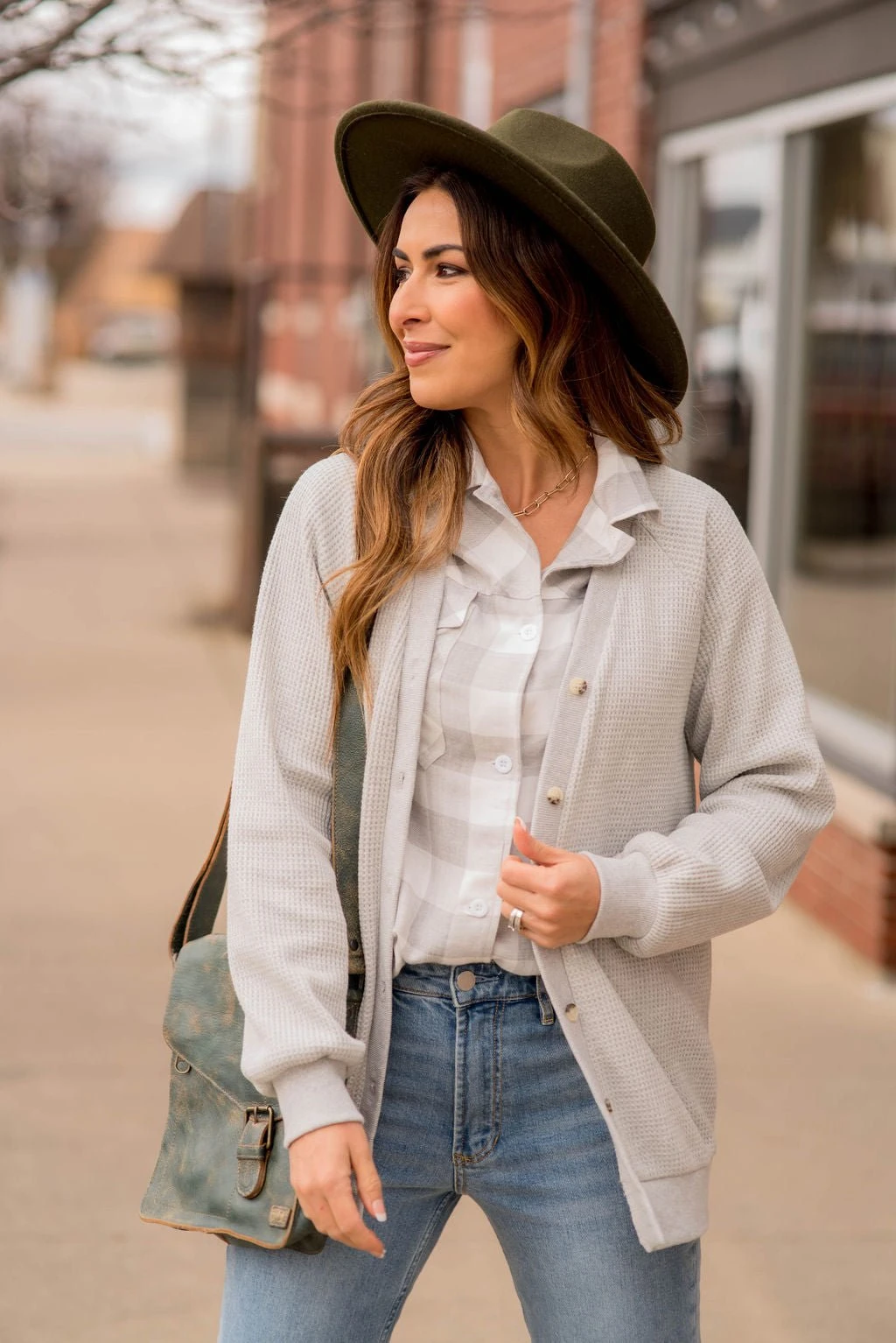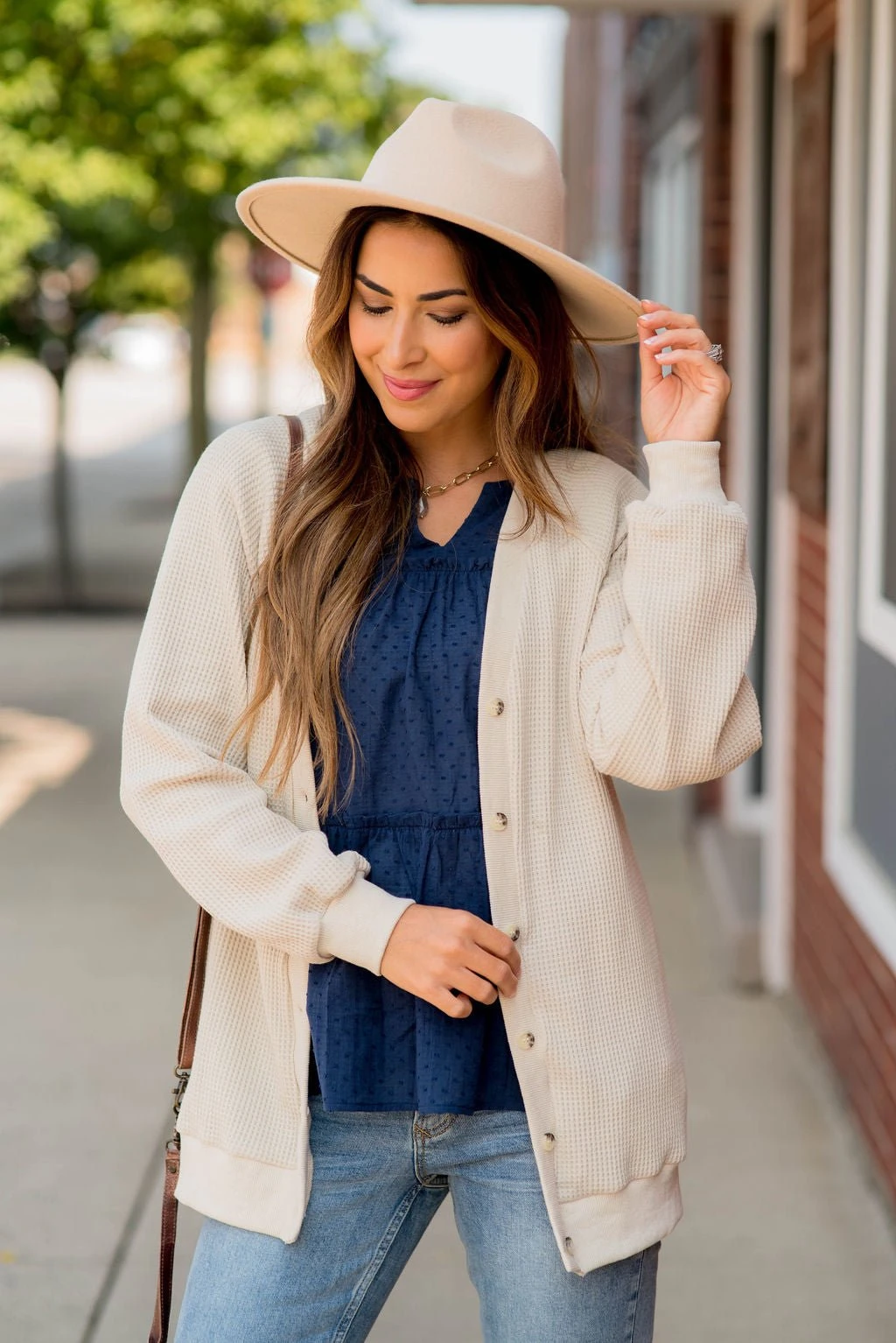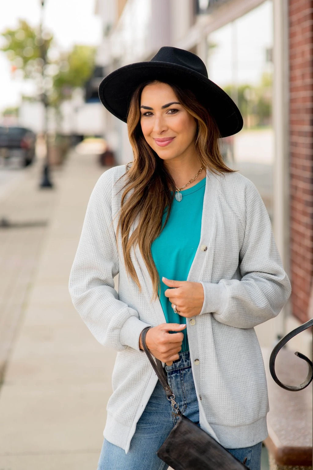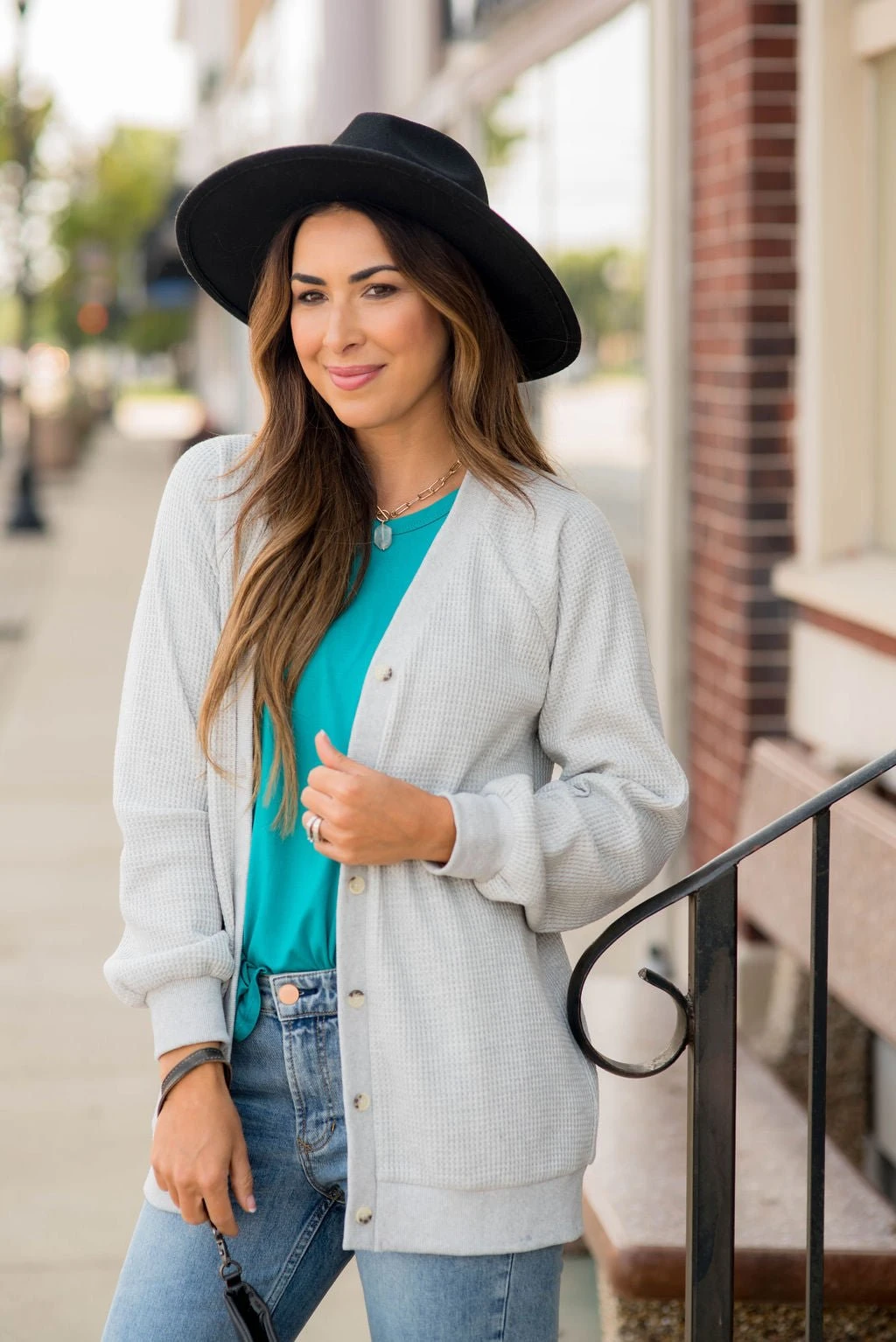 The waffled material against the solid trim really makes this cardigan pop! We’re loving the button accents for that little bit of extra detailing! Pair with a basic tee and leggings or denim for a quick and easy on-the-go look or layer with your favorite blouse for the office or the classroom!