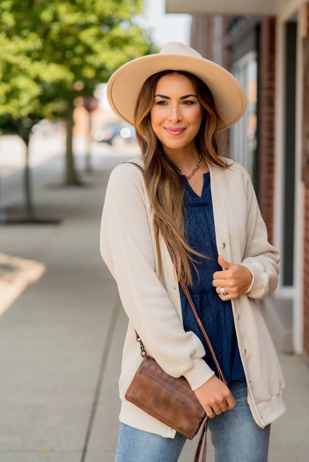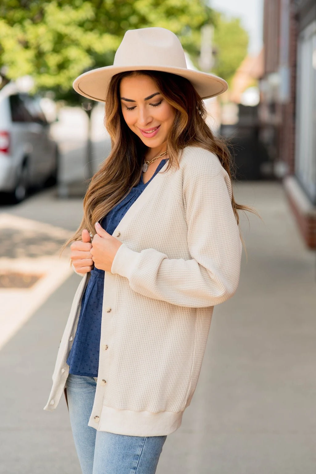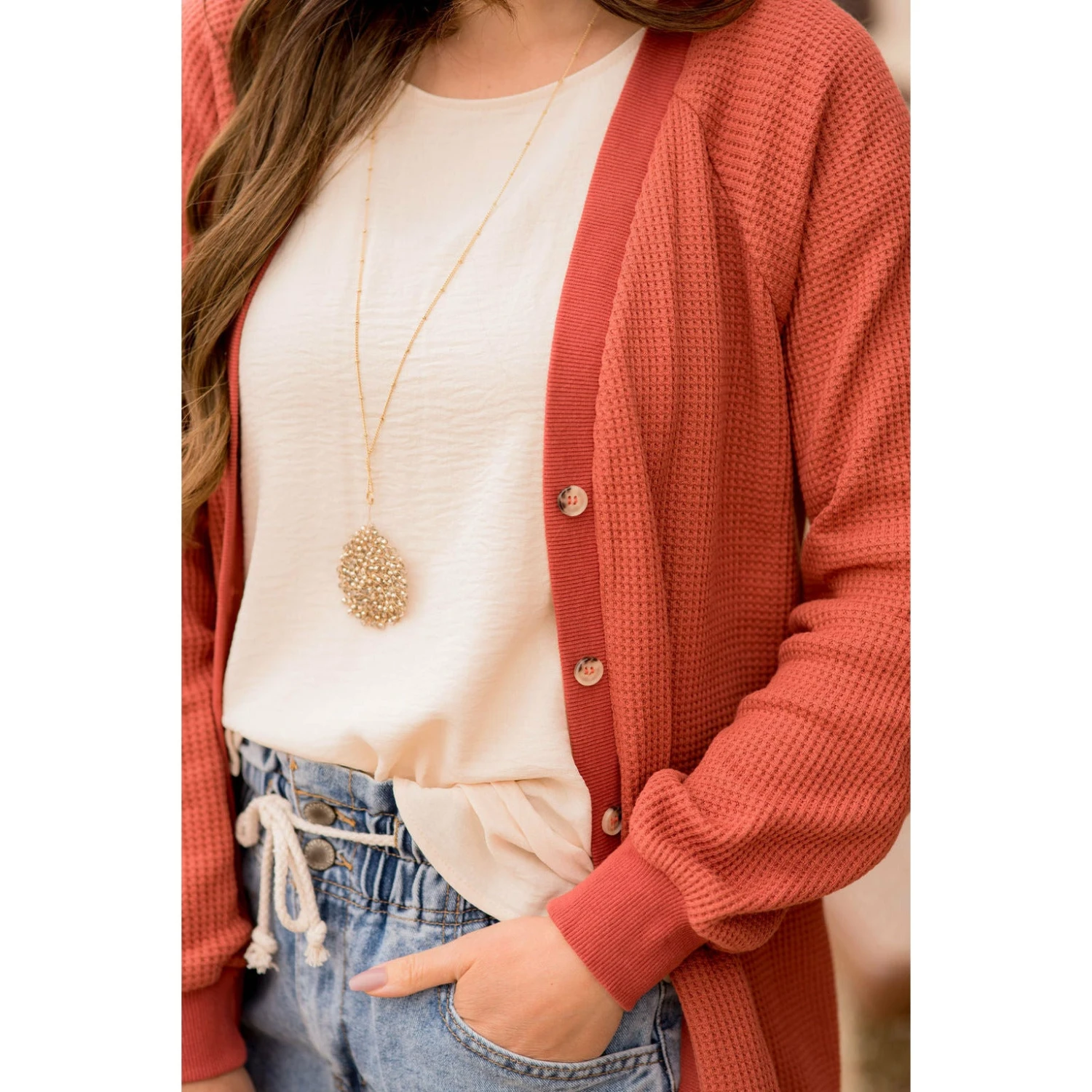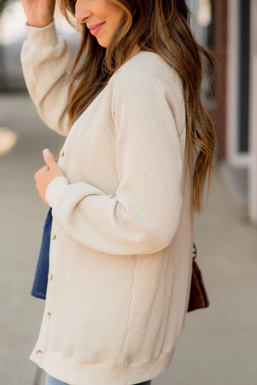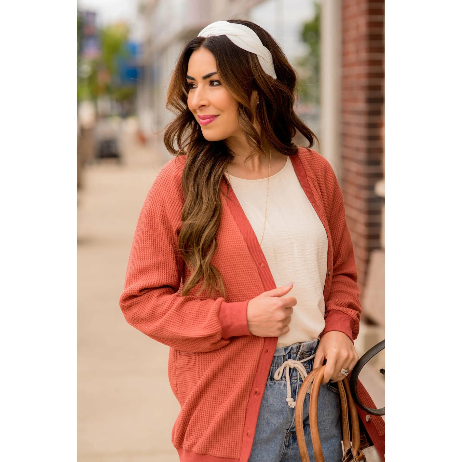 The waffled material against the solid trim really makes this cardigan pop! We’re loving the button accents for that little bit of extra detailing! Pair with a basic tee and leggings or denim for a quick and easy on-the-go look or layer with your favorite blouse for the office or the classroom!