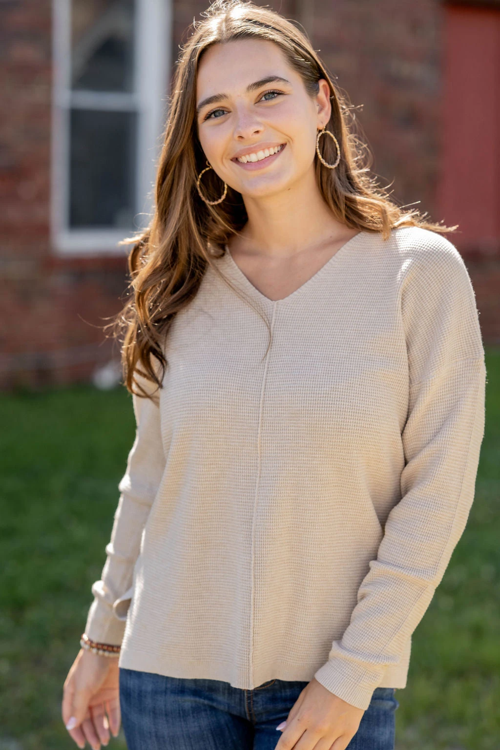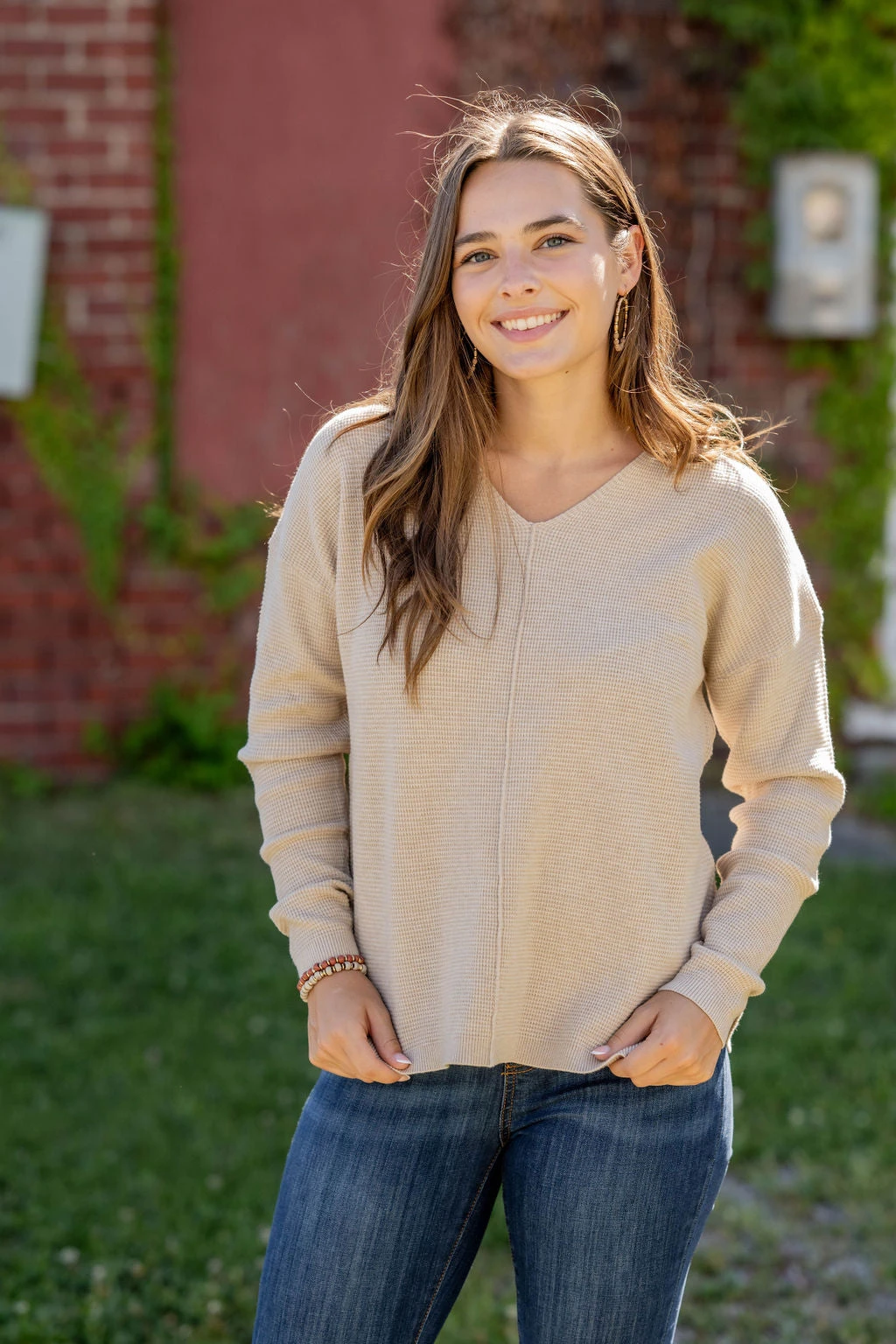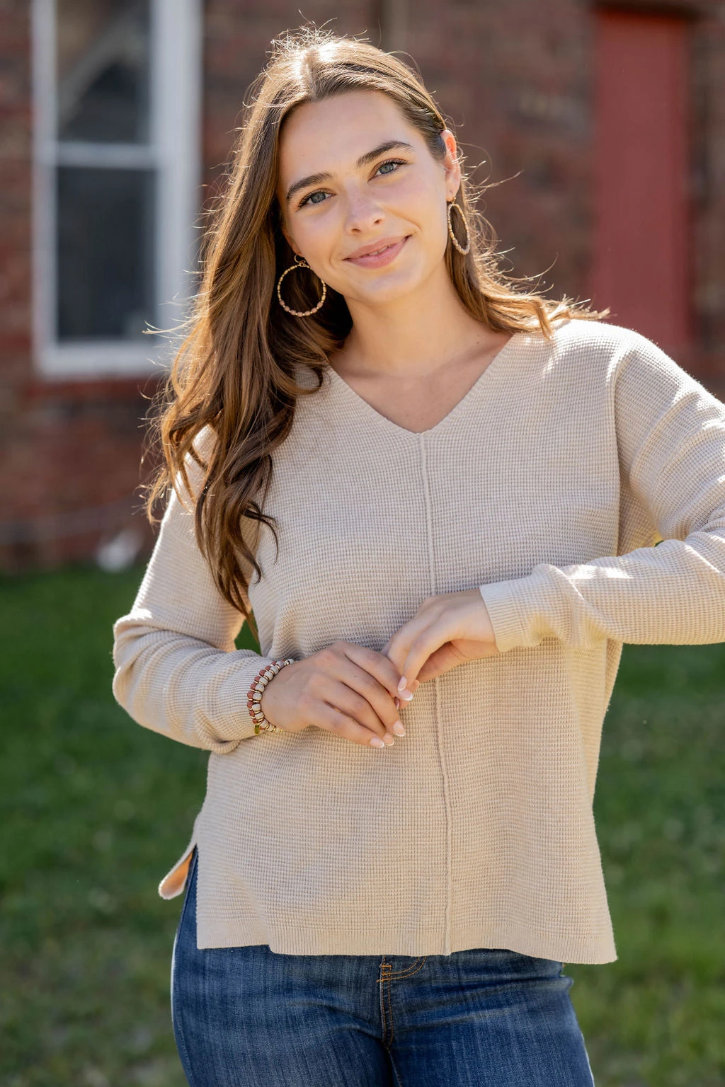 A super soft and lightweight sweater set apart from the rest with a waffled textured, v-neckline, side slit, and a mid-seam detailing! Pair with denim and a statement necklace or cute pair of earrings for a more elevated look, or with joggers or leggings and a vest or shacket for a quick yet super cute on-the-go look!