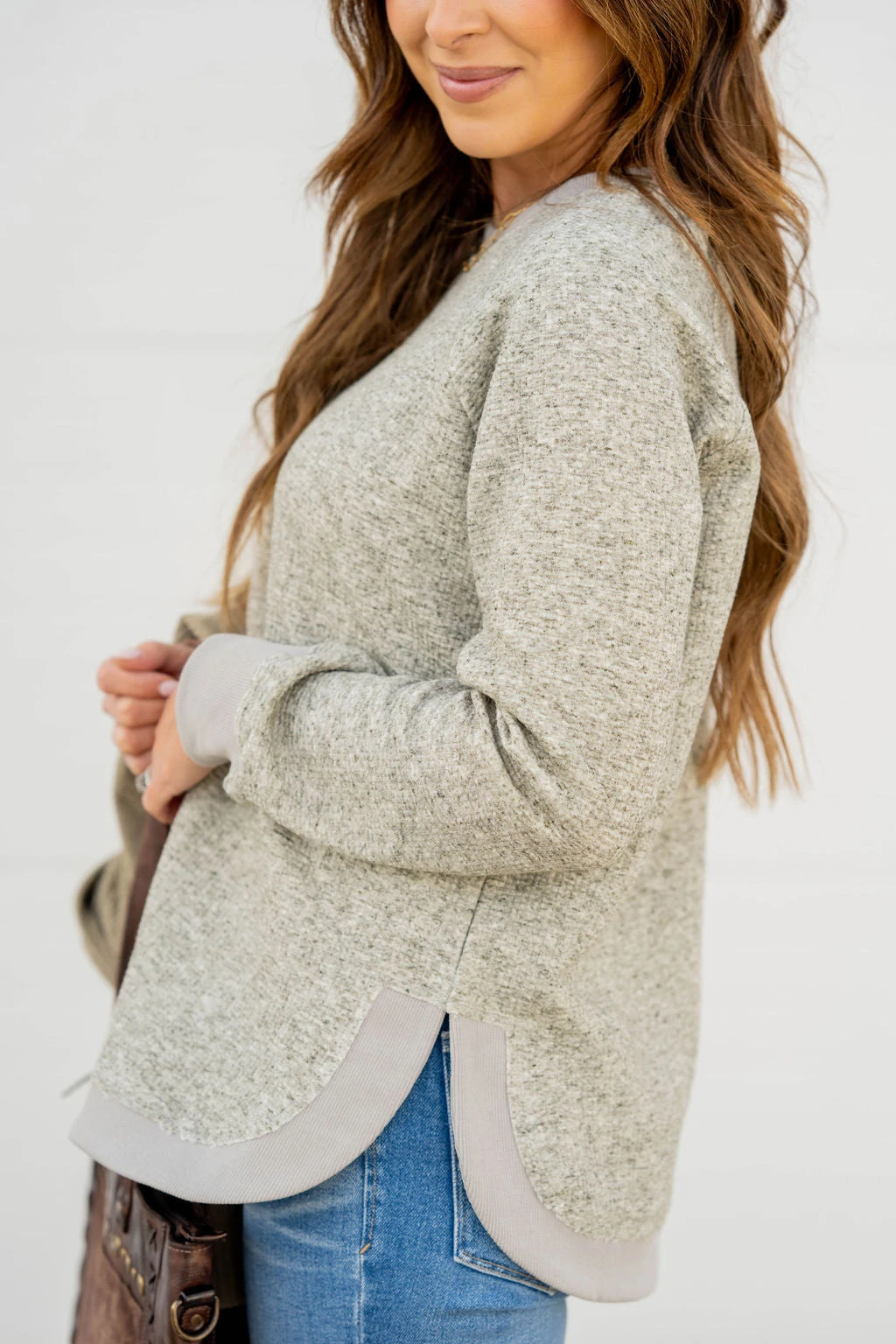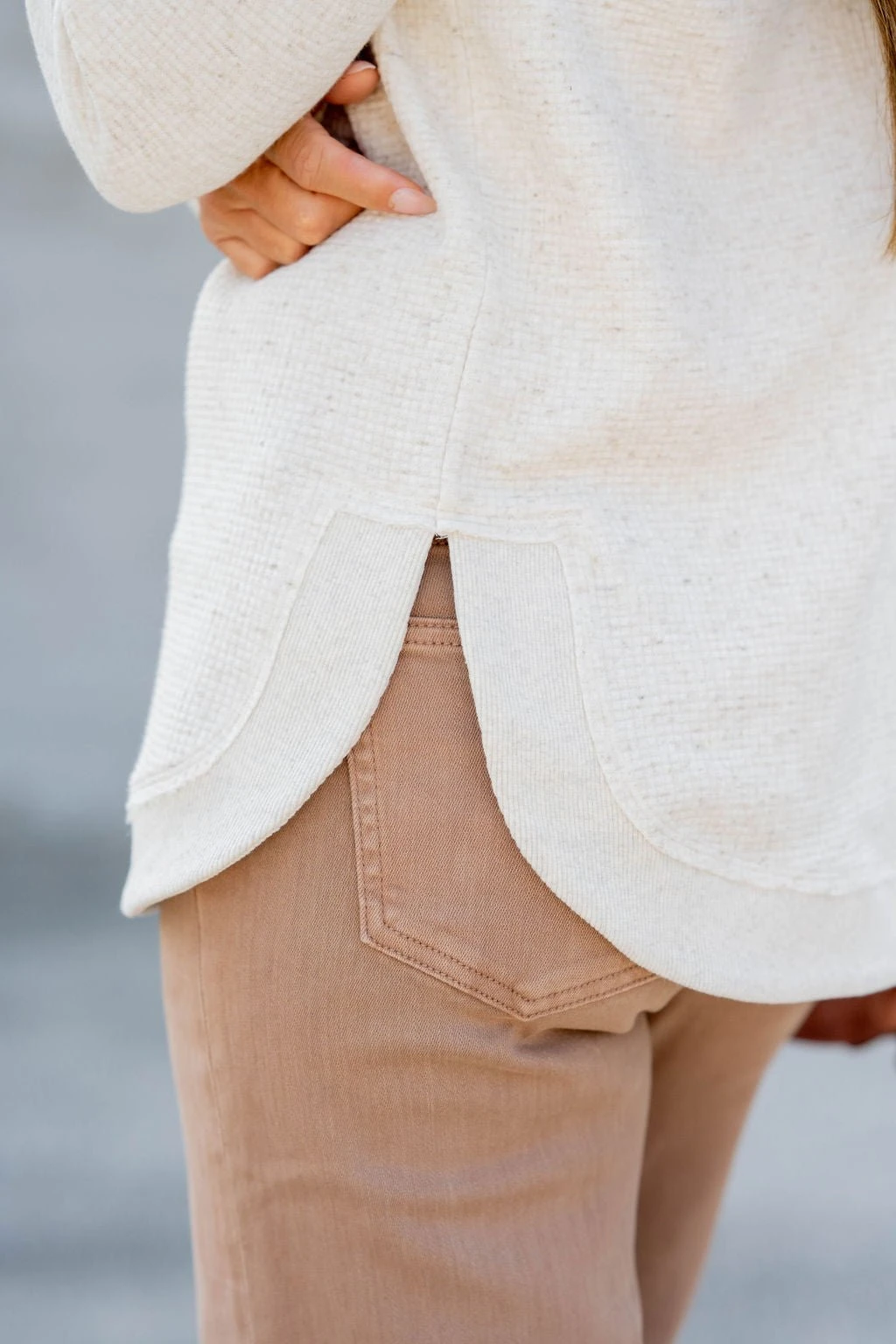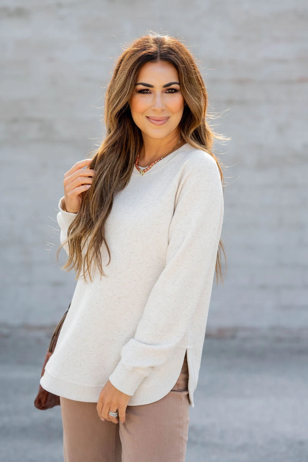 Comfort meets style in this waffled sweatshirt! The lightweight and soft waffled material gives a fun texture to any look, and the side slit detailing is perfect to pair with leggings, denim, or joggers! Chilly? Layer with a vest or shacket!