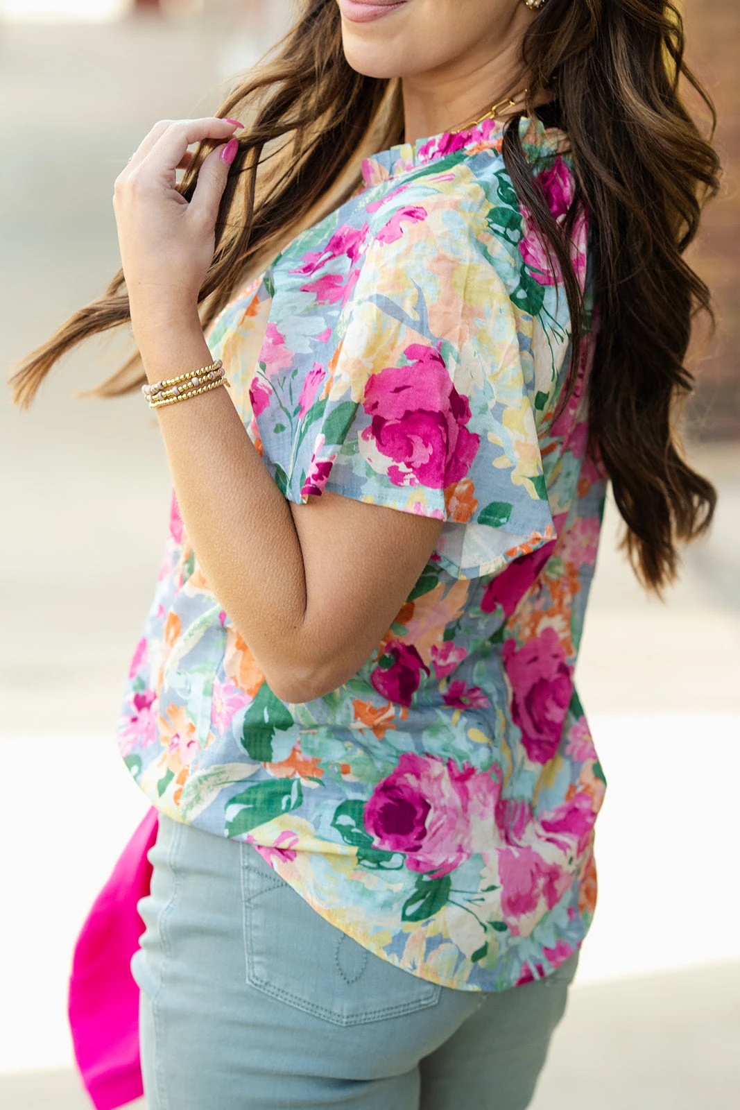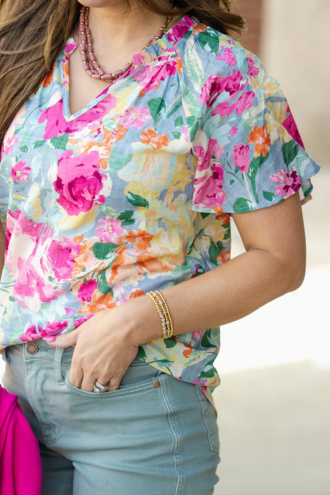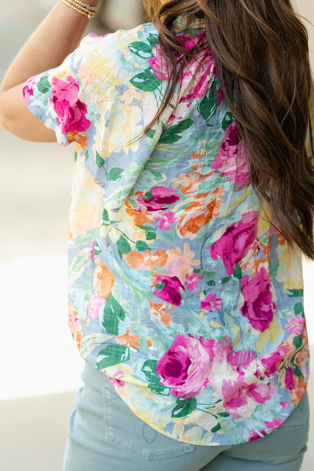 The cap sleeves and floral print on this blouse sets it apart from the rest! The lightweight and breathable material makes this ideal for any season! Pair with your favorite denim, a bold-colored pair of our Betsey’s Jeggings, or even just some leggings for a unique look!