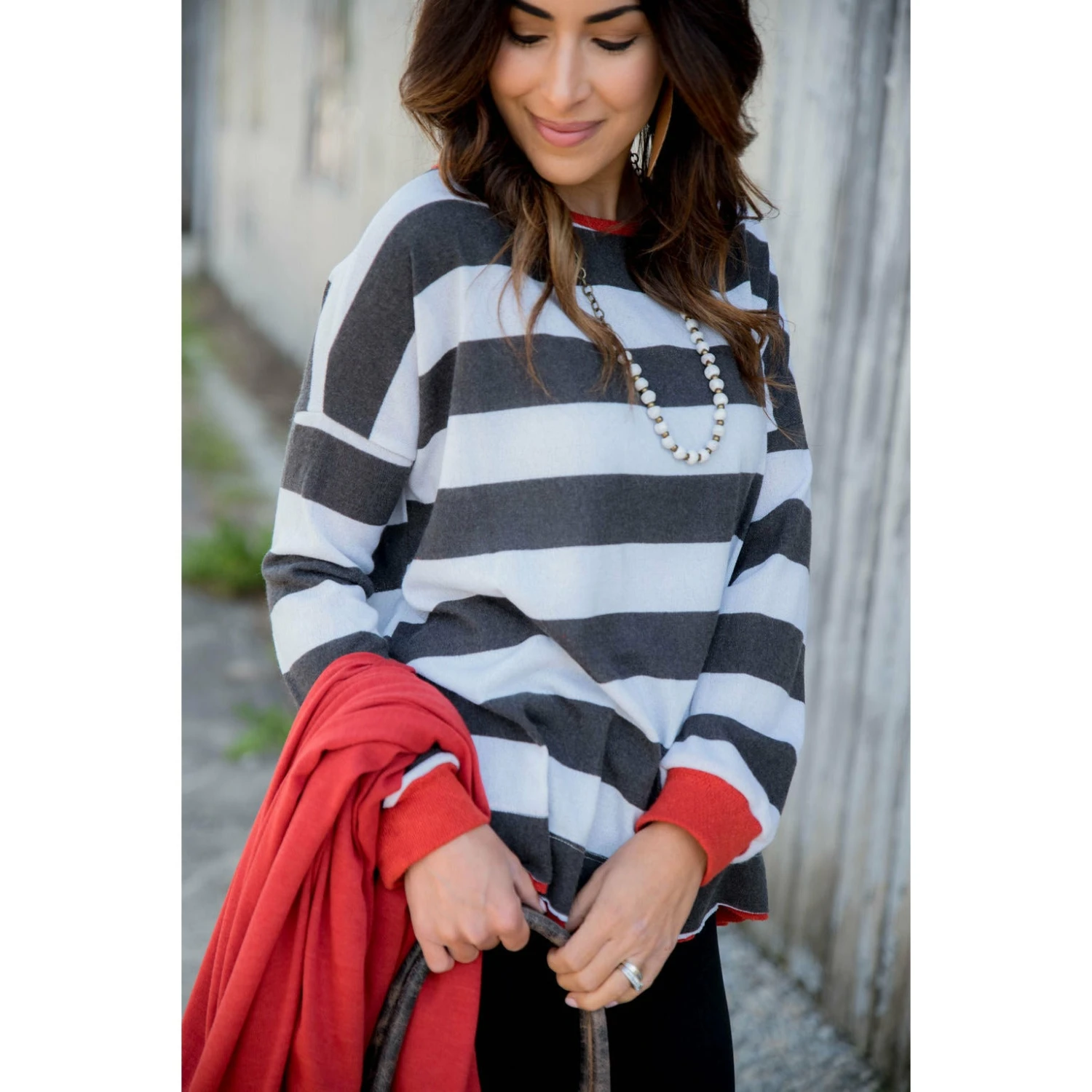 Everyone needs a cute slub style sweatshirt for on the go, and this one is it! The camel and the off white thick stripes really make the bold color accents pop! The side slit adds an extra detail and makes it the perfect sweatshirt to throw on with your favorite pair of denim and booties for a quick yet complete on the go look.
