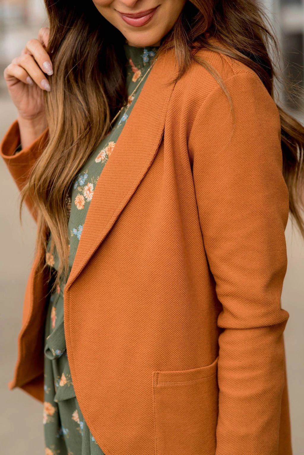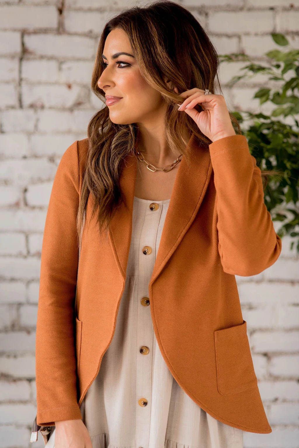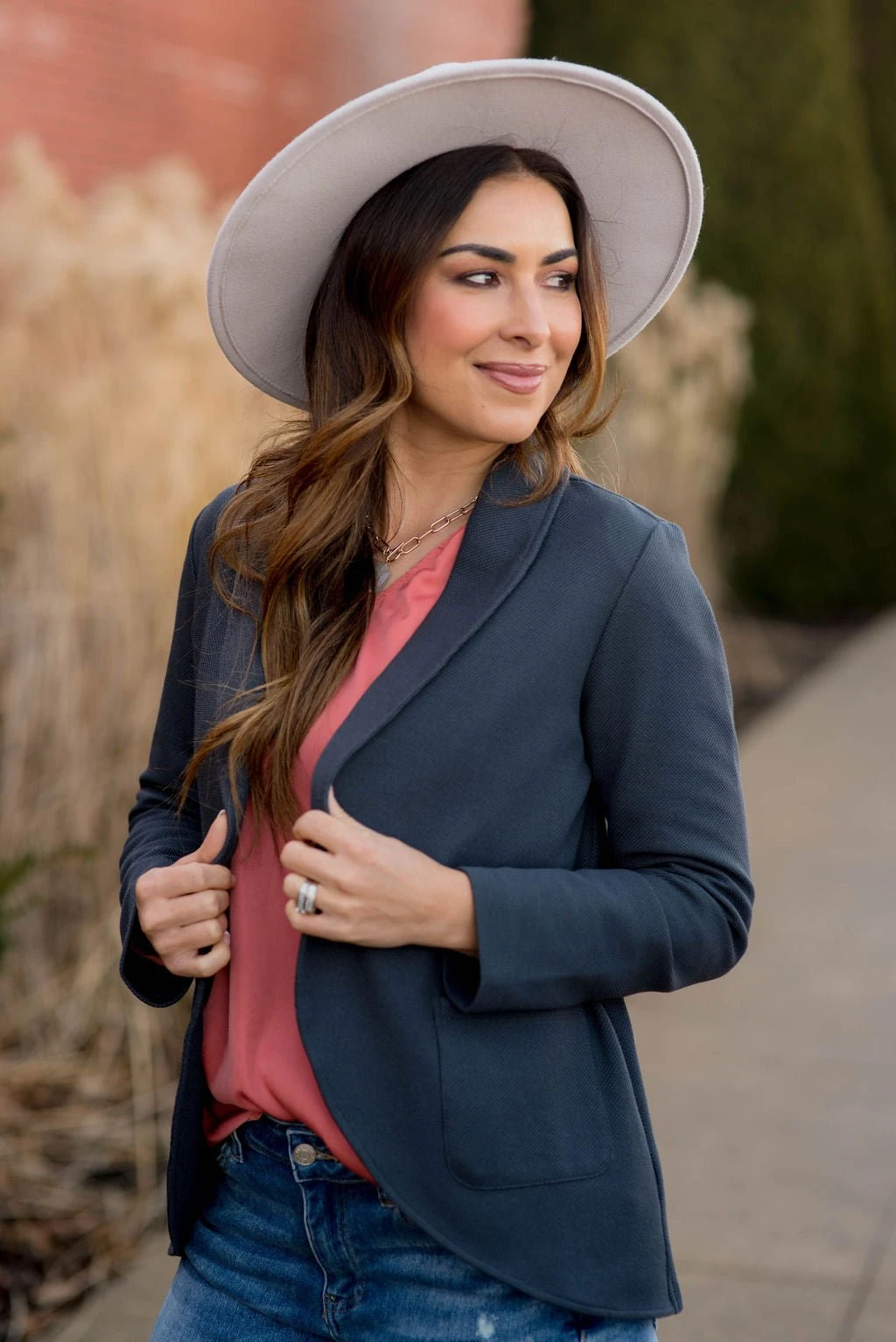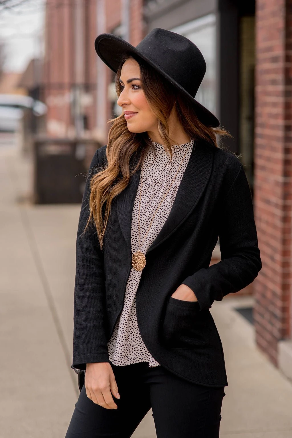This simple blazer is elevated with a woven texture and pockets! Pair with a dress or blouse and Betsey’s Jeggings combo for the office or the classroom or with a graphic tee and denim or a basic tee with leggings for a quick yet cute on-the-go look! We love that this can transition you through all seasons!