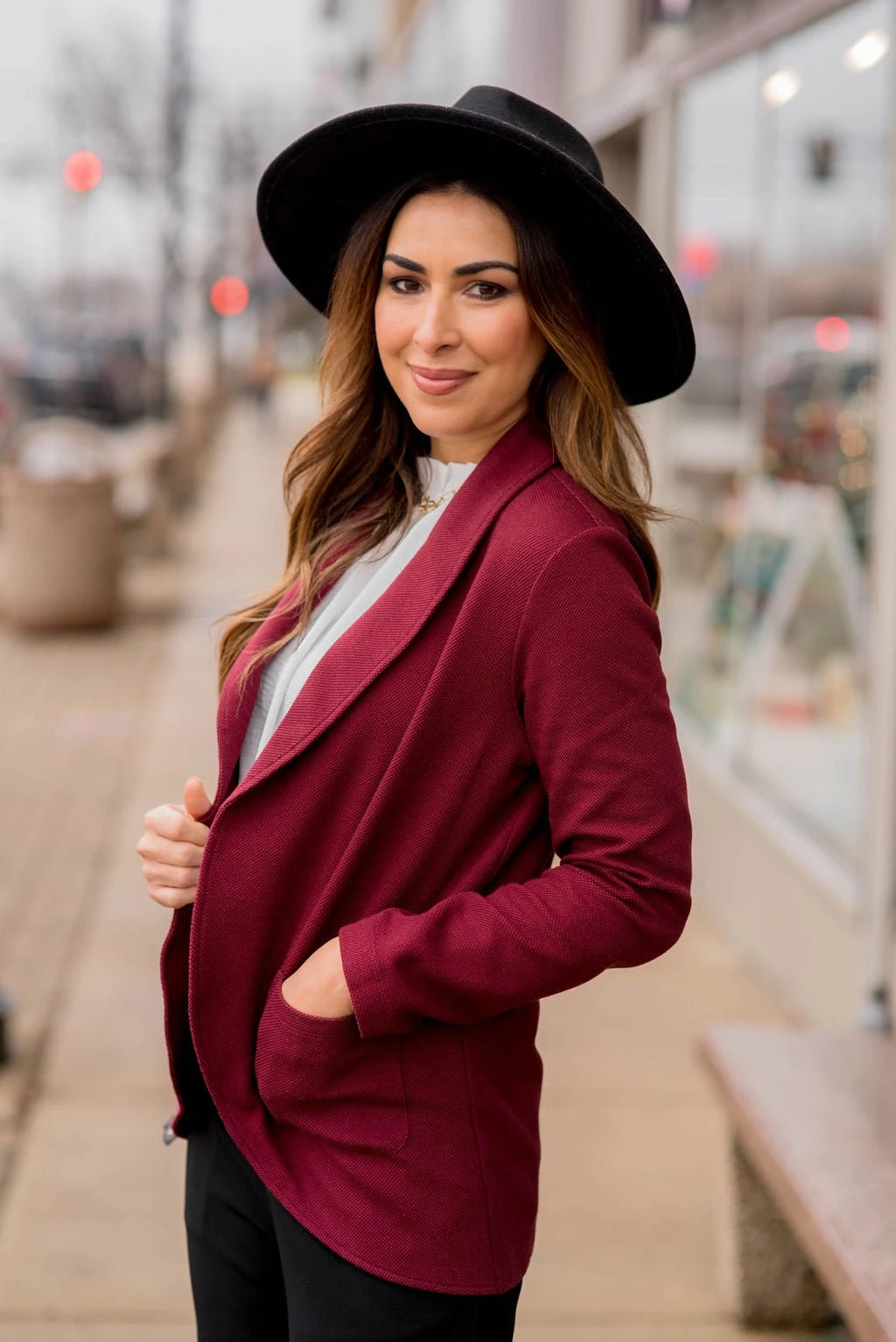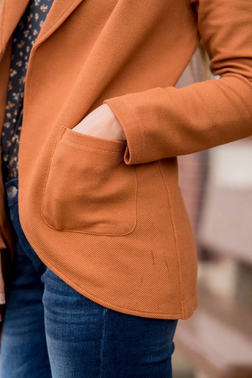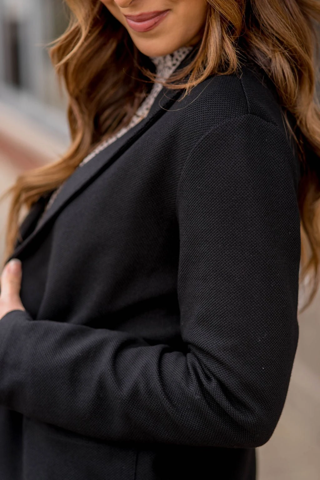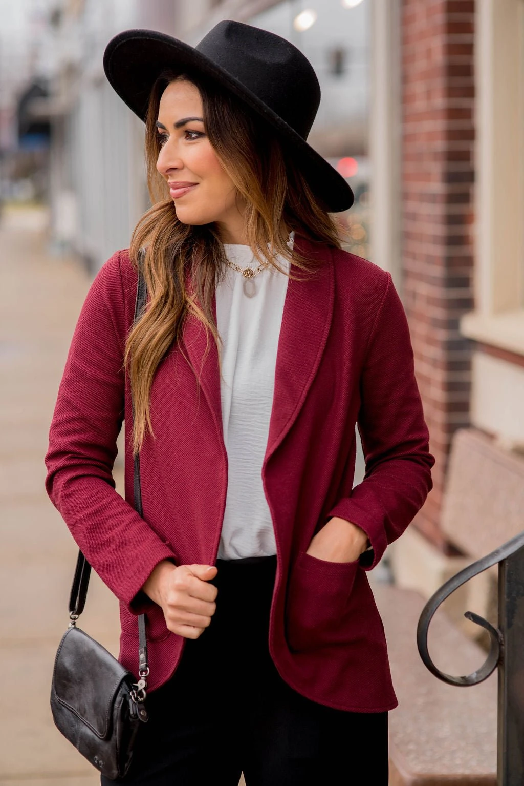 This simple blazer is elevated with a woven texture and pockets! Pair with a dress or blouse and Betsey’s Jeggings combo for the office or the classroom or with a graphic tee and denim or a basic tee with leggings for a quick yet cute on-the-go look! We love that this can transition you through all seasons!