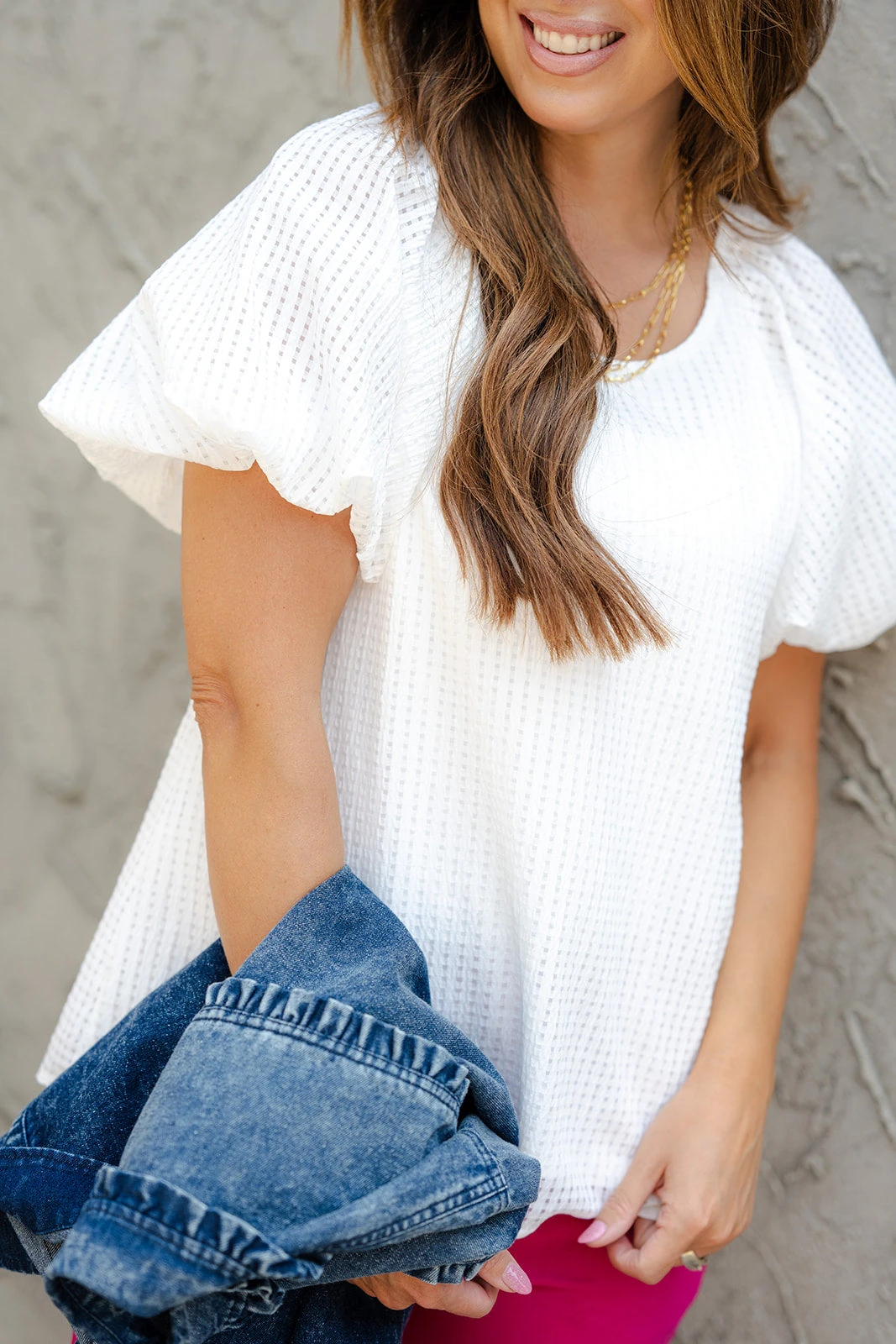 The fun puff sleeves and woven pattern really set this blouse apart from the rest! Pair with shorts or a skirt in the warmer months or with denim or our Betsey’s Jeggings in the cooler ones! Don’t forget your favorite accessories for a complete Betsey’s look! The simplicity of this allows you to dress it up or down with ease, making it ideal for everyday wear!